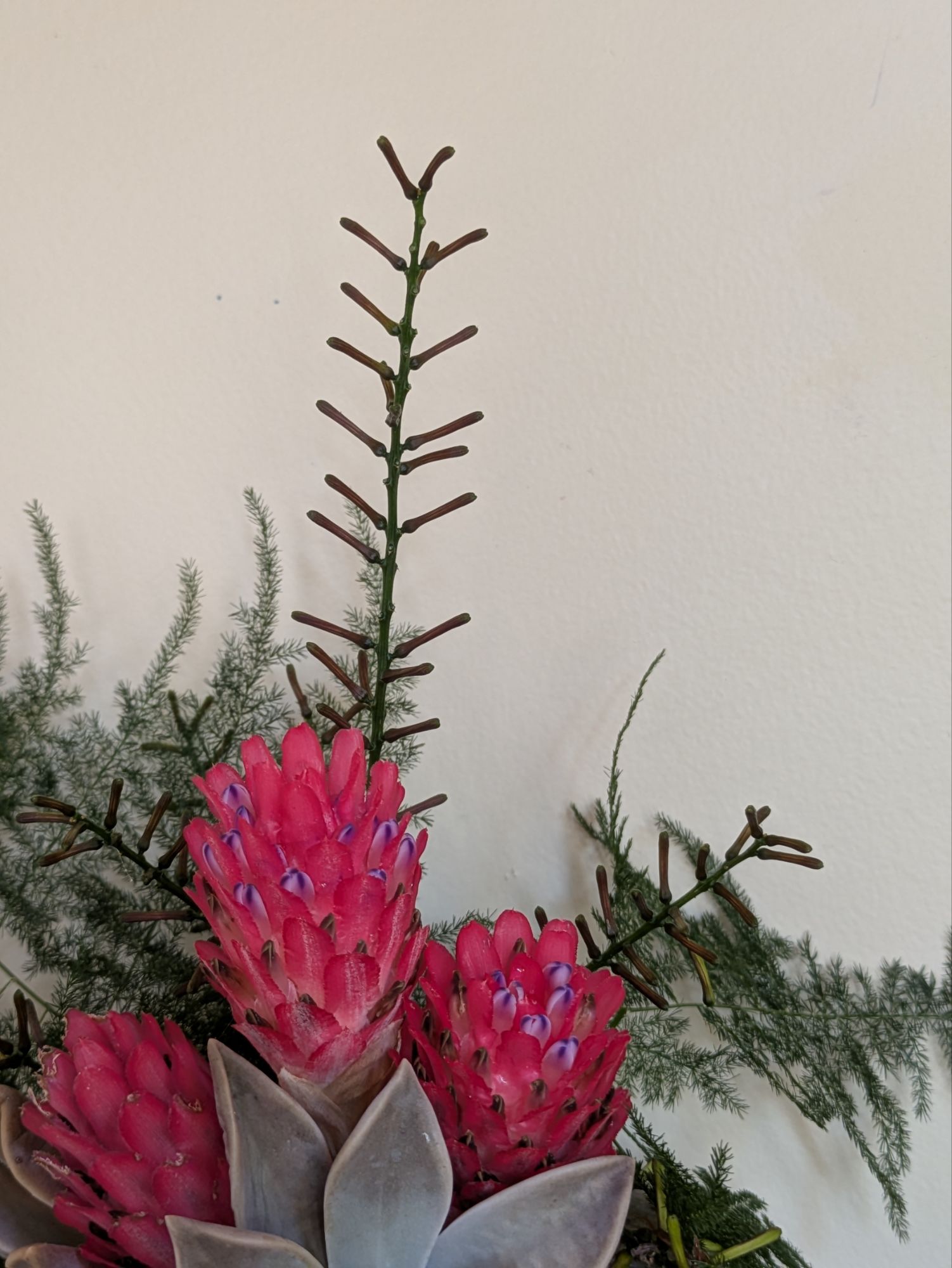 The tulips of South Florida are back again – pink flowers from Quesnelia testudo bromeliad. These Quesnelias are known for their cold tolerance. This one is common much further north of my garden. The flowers that were open burned to beige, but the new ones look great. The spiky stem in the back is a flower stalk from Dracaena reflexa. I am not sure what this was doing, there are berries on the plant, so it could be forming berries or just burnt from the cold. The ferny stuff is Climbing Asparagus Fern, a weed that pops up from time to time.