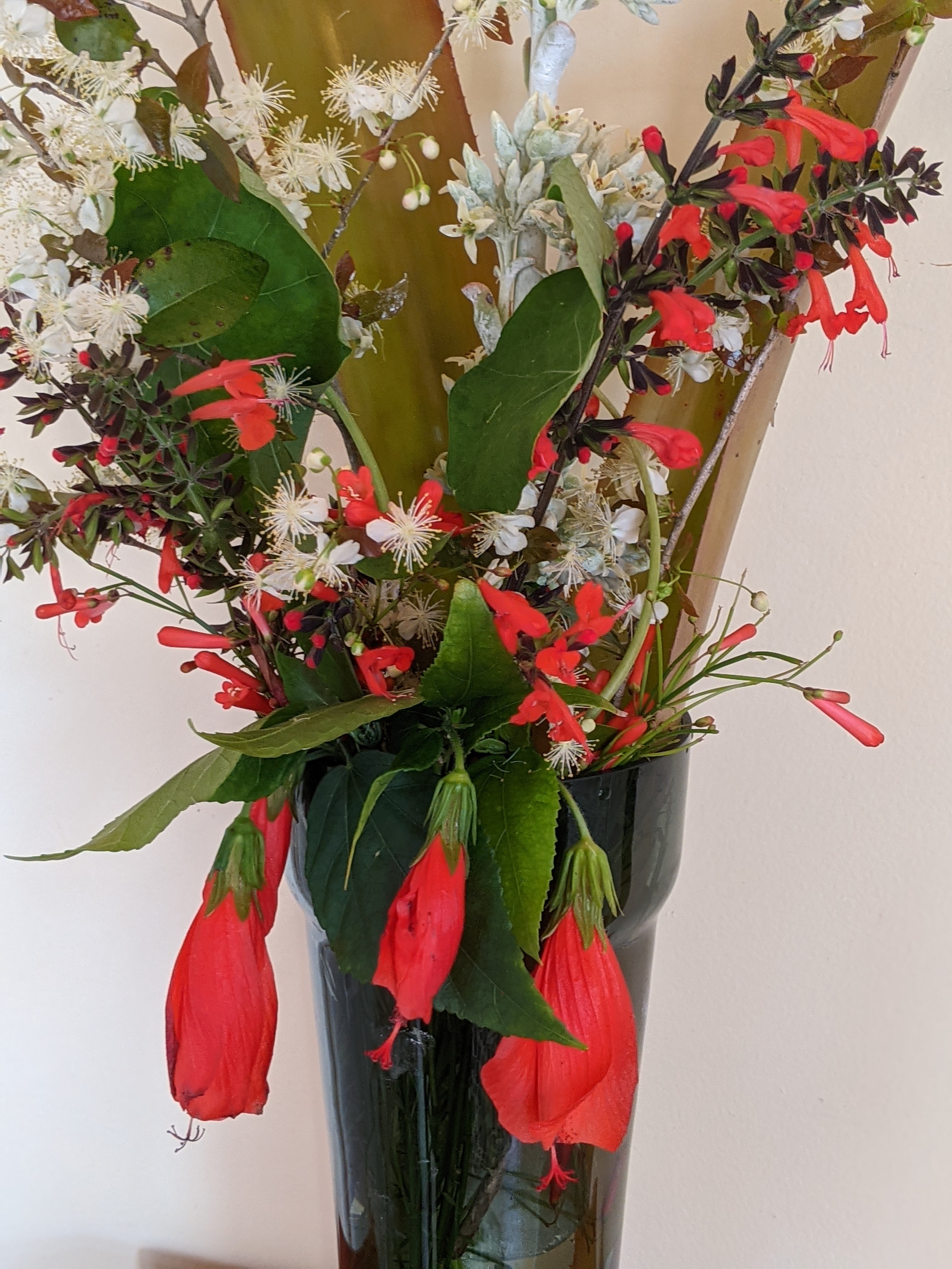 The black glass vase is a thrift store find from years ago I like to use with tall, thin plant material. Red spikes are Tropical Red Salvia (Salvia coccinea), these reseed prolifically and produce different colors, the latest is a nearly black stem I love. A few red Firecracker Plants (Russelia equisetiformis) are hanging over the base of the arrangement. The red flowers draped over the edge are Nodding Hibiscus (Malvaviscus penduiflorus), I am pretty sure these are edible, but didn’t try them out on Zepp as they can have a laxative effect – not good in a 80 lb. dog. The white flowers are branches from the Surinam Cherry (Eugenia uniflora), a large shrub with strange tropical fruit (known for its resinous taste). The branches remind me of plum or cherry flowers and are reminiscent of spring. The grey spike in the middle is the flower of a Flapjack Kalanchoe, a favorite succulent in my garden. I thought a little bronze foliage was in order, so the straplike leaves in the back were added. They are from Blanchetiana Bromeliads.