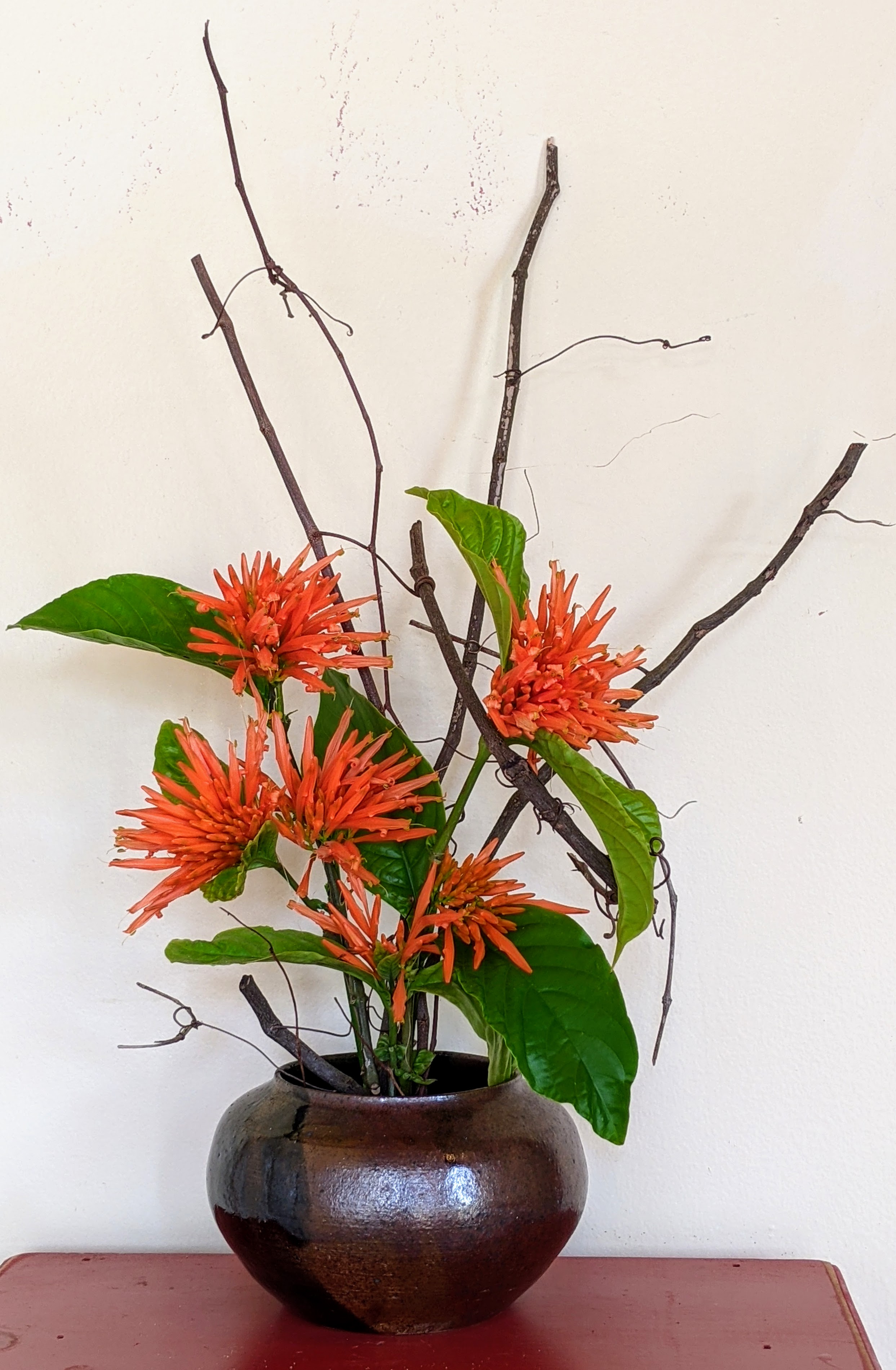 This week I decided to try creating a spare design with a Japanese feel. I also wanted to use some grapevine. I thought the brown pottery vase would give the arrangement some weight and tie the brown grapevine together with the limited plant palette. Limited may be an understatement. This arrangement has two plants!