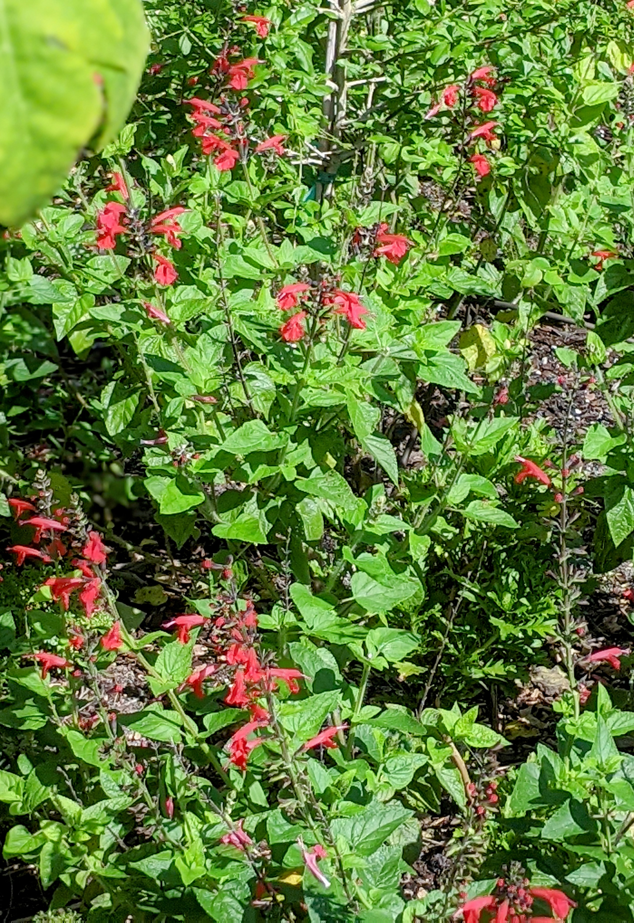 For unknown reasons the Tropical Red Salvia are having a banner year. Possibly the advent of soaking afternoon thundershowers and their taking hold in the highly amended, recently abandoned vegetable bed. The flowers are bigger and more bountiful than ever before. Another gardening mystery to ponder.