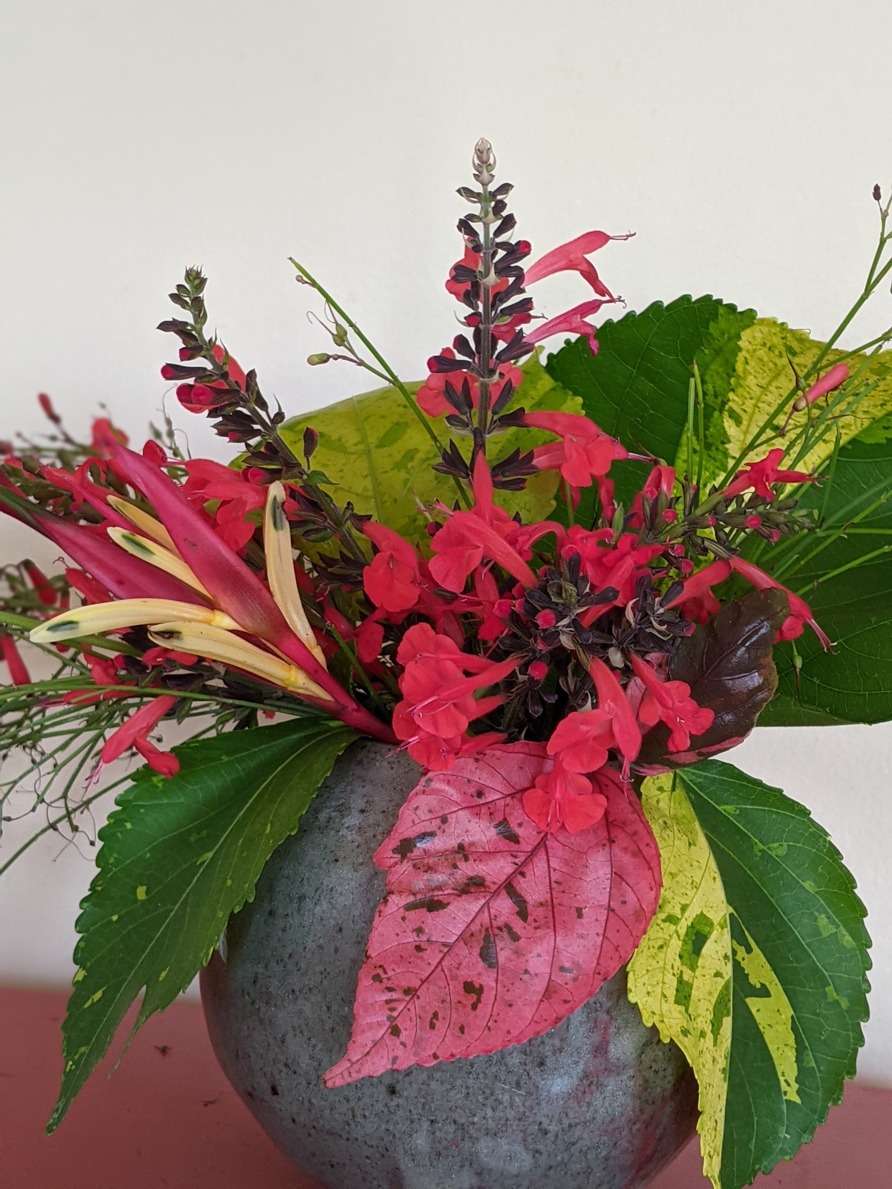 The red spikes are the fat and happy Tropical Red Salvia (Salvia coccinea). I am always amazed at the ability of my garden to produce foliage in colors that match the flowers.This week’s foliage is from Copperleaf shrubs, oddly named, in my opinion, as they are available in many colors besides copper. The red leaves are from ‘Louisiana Red’ Copperleaf (Acalphya wilkesiana). The yellow and green leaves are called ‘Java White’.