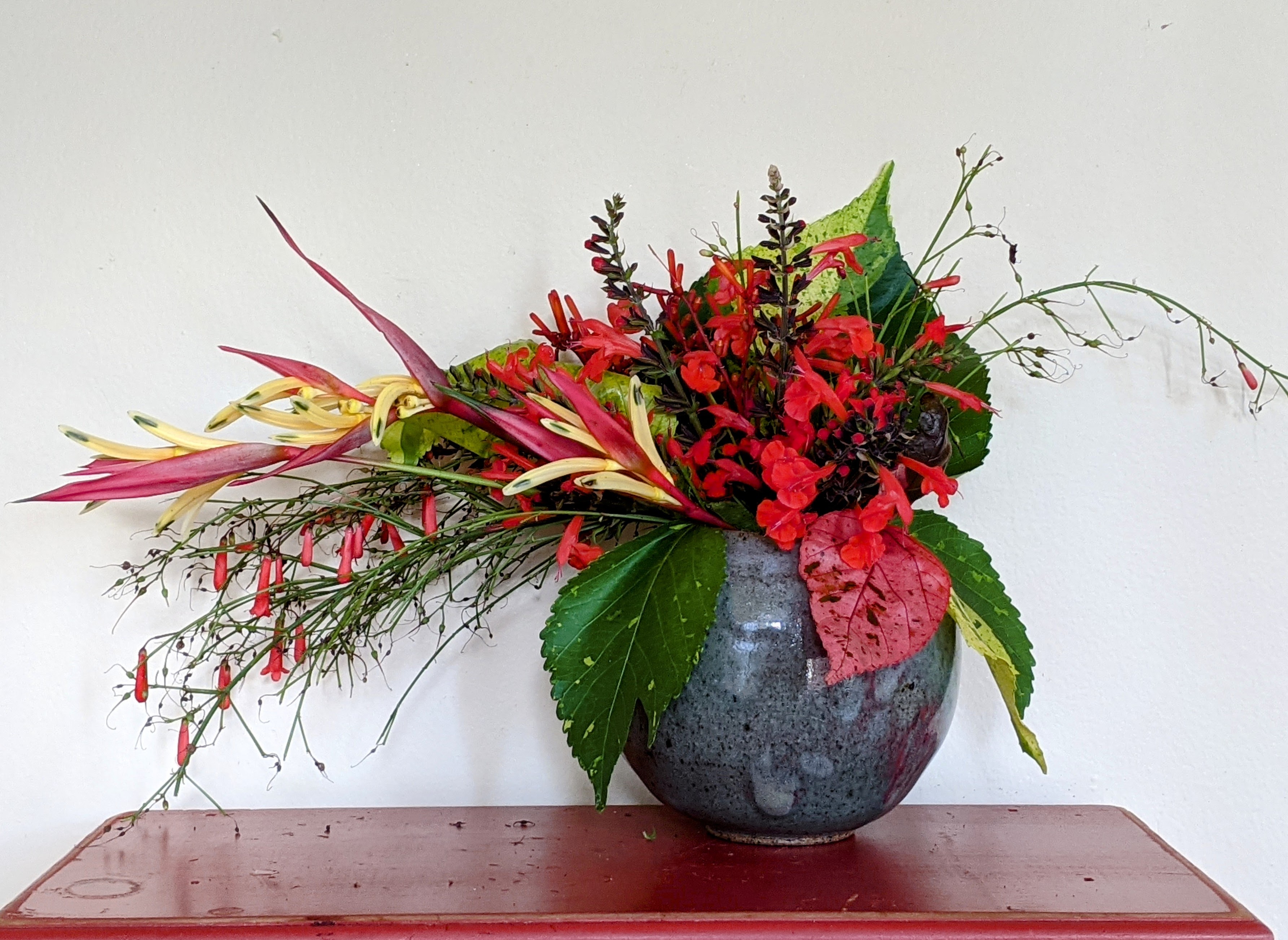 This is an accidental flower arrangement. I had a few Parrotflowers (Heliconia psittacorum) pop up in the front garden and cut them. One had an extremely short stem, so I decided to put them in this short vase – not realizing I could not get a frog in the vase to hold the stems upright. The Parrotflowers landed on edge. Eureka! they look like birds in flight and I went with the flow. I decided more red and yellow would pop the parrot colors.
