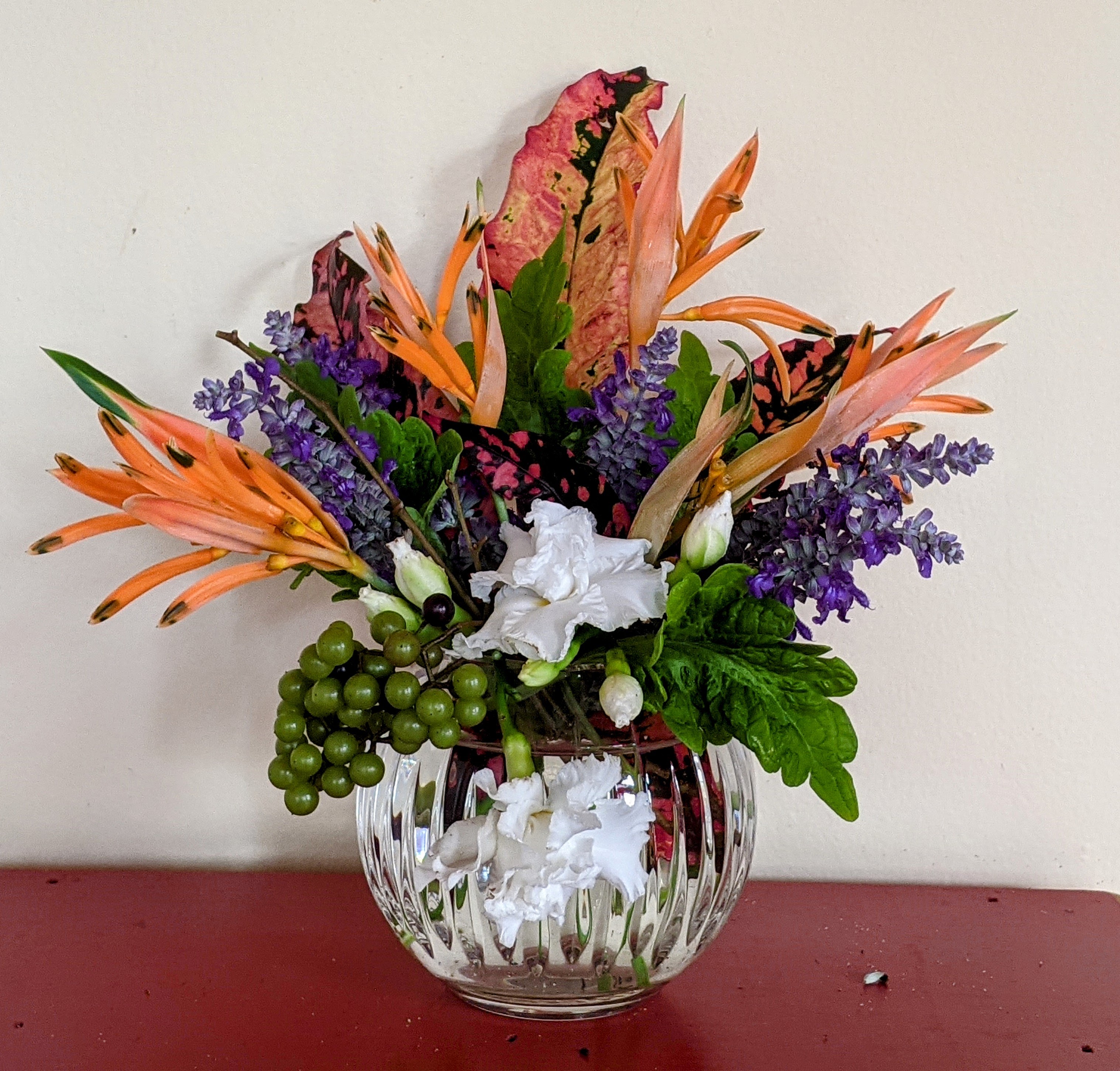 I like the new apricot Parrot Flowers. They look great with the blue Salvia and bright green coleus. The green grapes add a nice autumnal feel to the arrangement. I can’t believe that fall is so near!