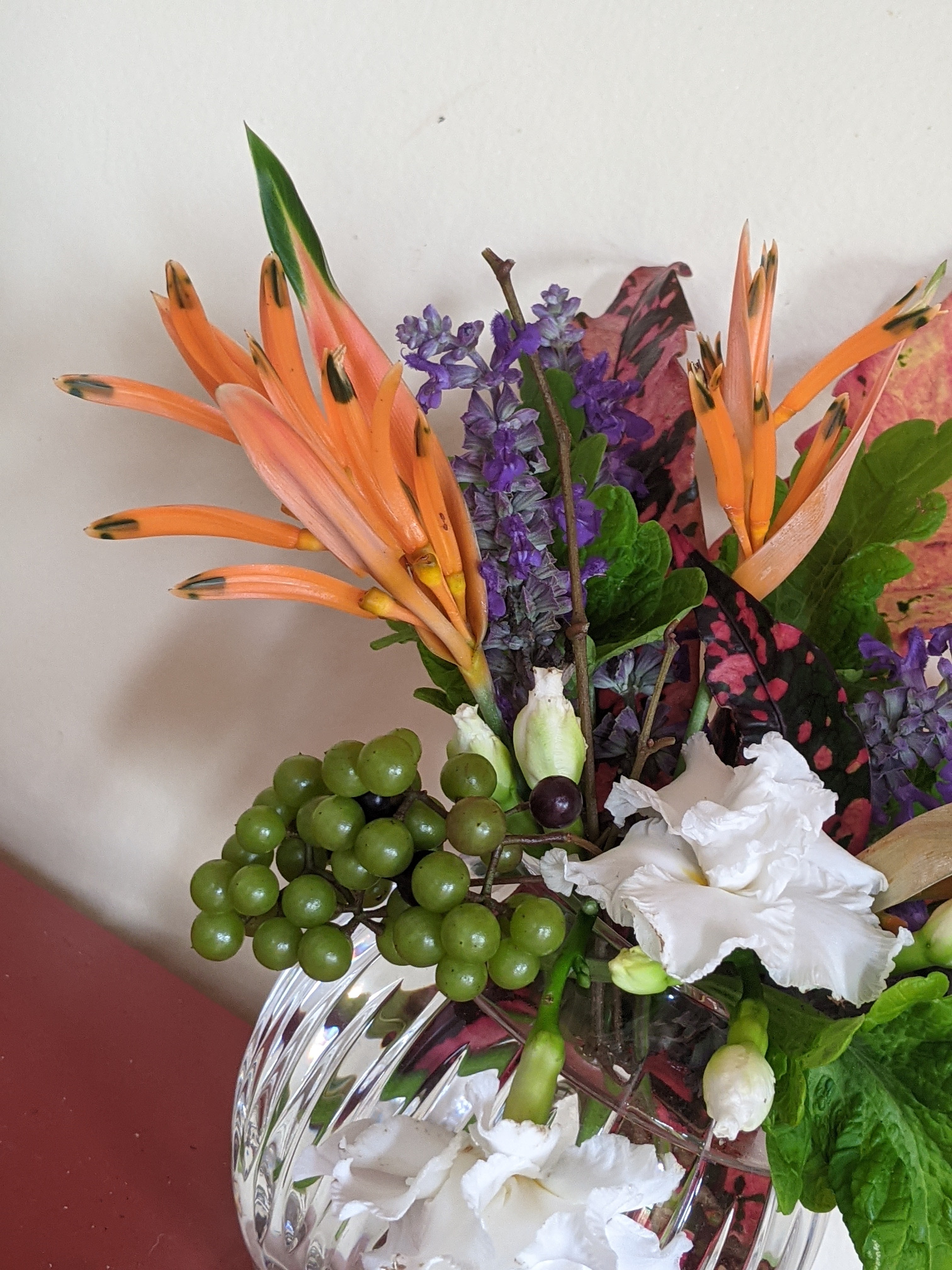 Lovely. I like the parrot flower and the tropical gardenia, in particular. Your use of grapes set me off looking for the name of the “other” grape I grew up with–scuppernong. Didn’t know it but “Botanically speaking, they’re a variety of muscadine grape that goes by the scientific name Vitis rotundifolia ‘Scuppernong.'” My older relatives all loved all these grapes while we kids loved the store-bought seedless ones that came in bunches like in still-life paintings.