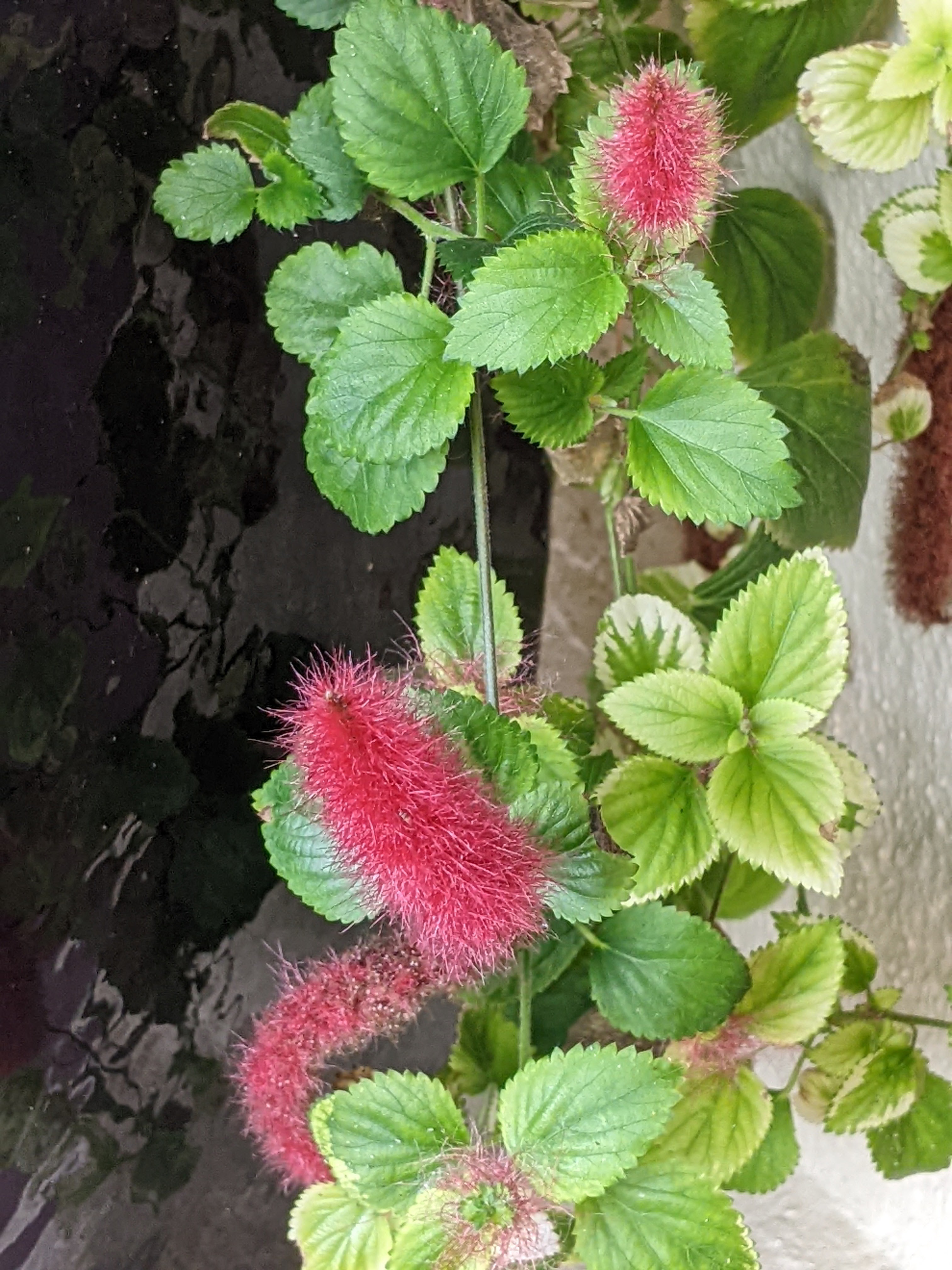 Dwarf Chenille Plant (Acalypha pendula) this is underplanting a Malaysian Orchid. These two are spending the night in the bathtub.