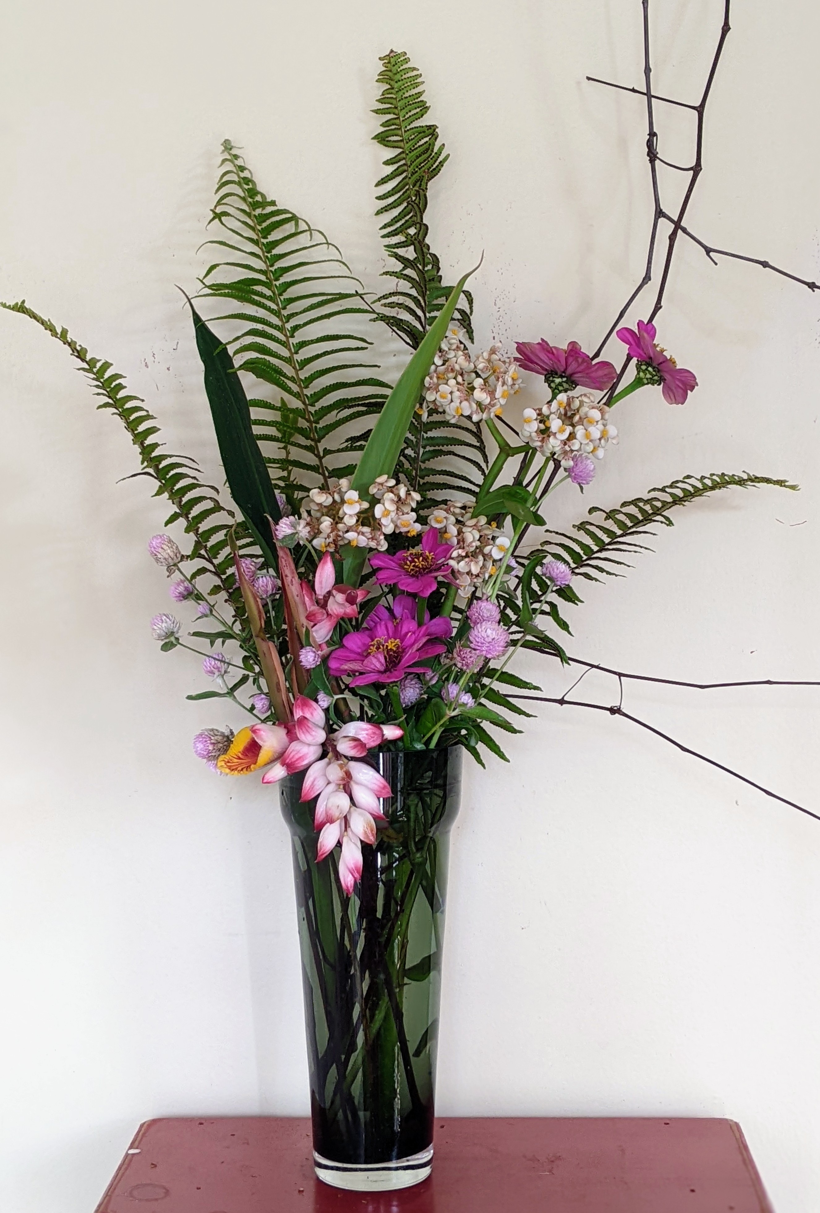 The grey glass vase, a thrift store find. Pink Zinnias, grown from seeds found on Etsy. White Begonias, a local botanical garden find; Begonia nelumbifolia or Lotusleaf Begonias. Smaller pink flowers are Globe Amaranth, again from Etsy seeds. Tropicals lounging over the edge are Shell Ginger ( Alpinia zerumbet) Ferns are – the love it or hate it Boston Fern – a native I love. Brown grapevines doing the twist, Vitis rotundafolia; they are difficult to like, producing bitter fruit and overrunning (or ruining) everything else.