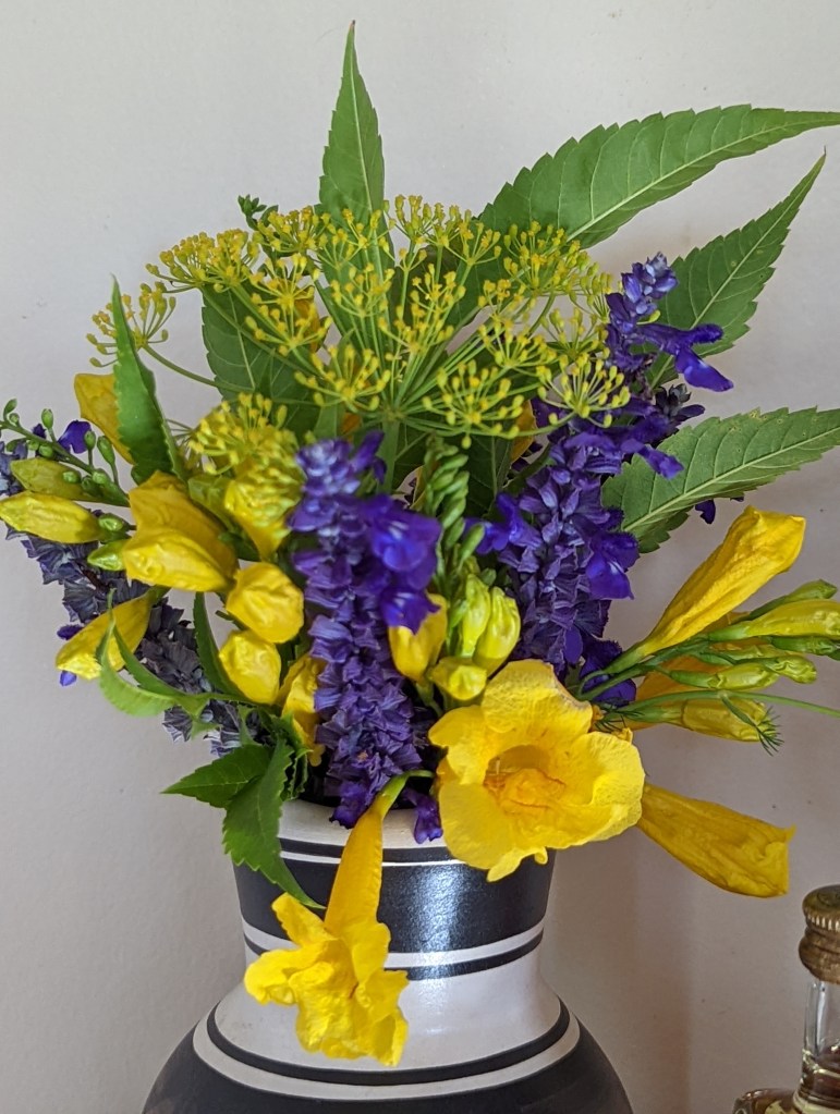The yellow bell shaped flowers are Esperanza (hope in Spanish) in latin, Tecoma stans. Yellow umbels are from culinary dill (Anethum graveolens). I am not sure I have ever seen the latin name for dill or knew it is a member of the parsley family. Blue flowers are Mystic Spires Salvia, a wonderful color match for the Ukrainian flag. The vase, inherited from my mother, from the Ute tribe in the Western US.