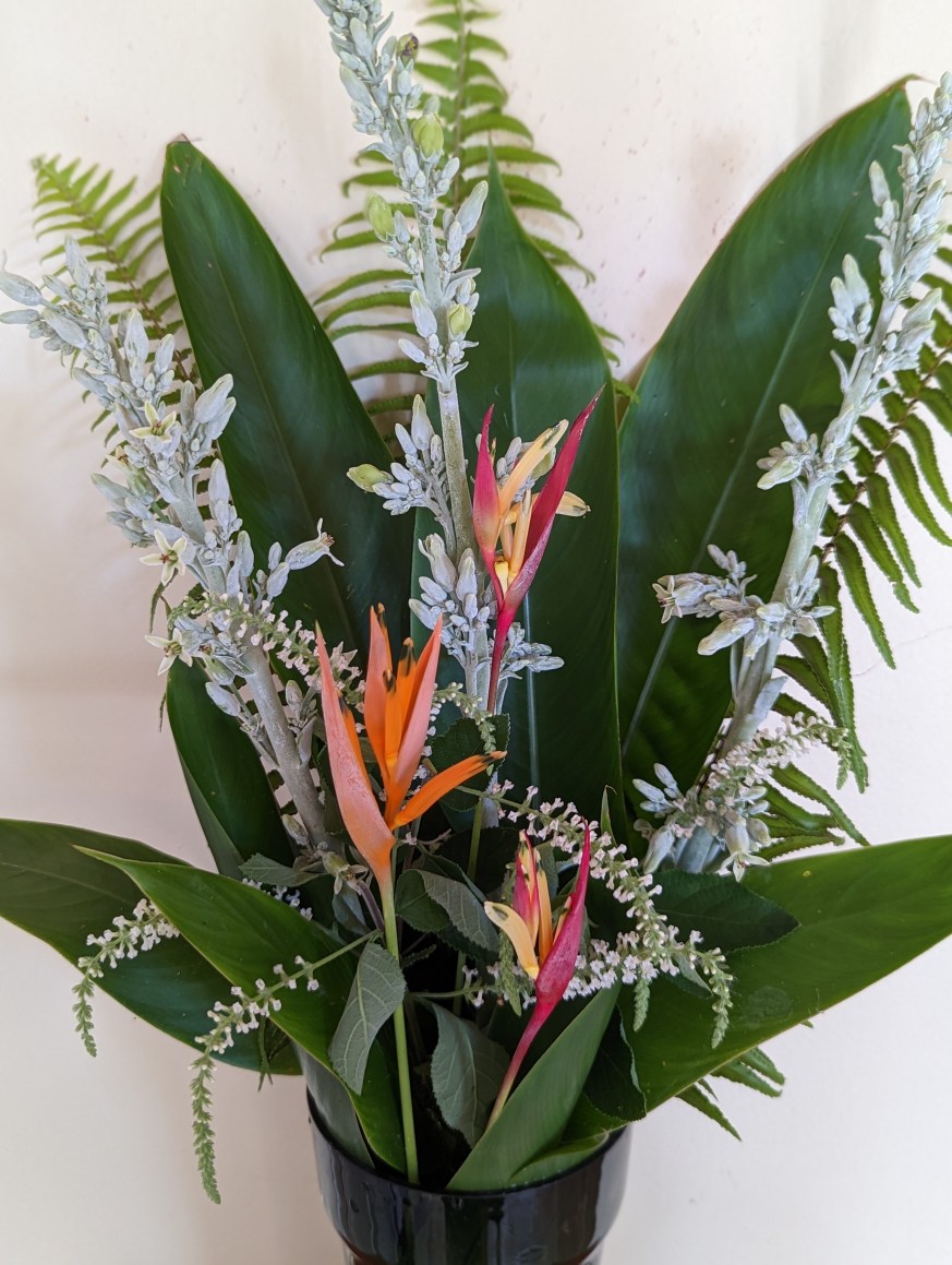 The flowers, three of each, of course. In red and yellow, ‘Lady Di’ Heliconia (Heliconia psittacorum); in orange, ‘Chocociana’ Heliconia (H. psittacorum ‘Chocociana’); white spikes lending fragrance to the vase, Sweet Almond Bush (Aloysia virgata); grey flower stalks are Flapjack Kalanchoe (Kalanchoe luciae); Boston Ferns (Nephrolepis exaltata) are in the background again; green leafy foliage is from the Heliconias.