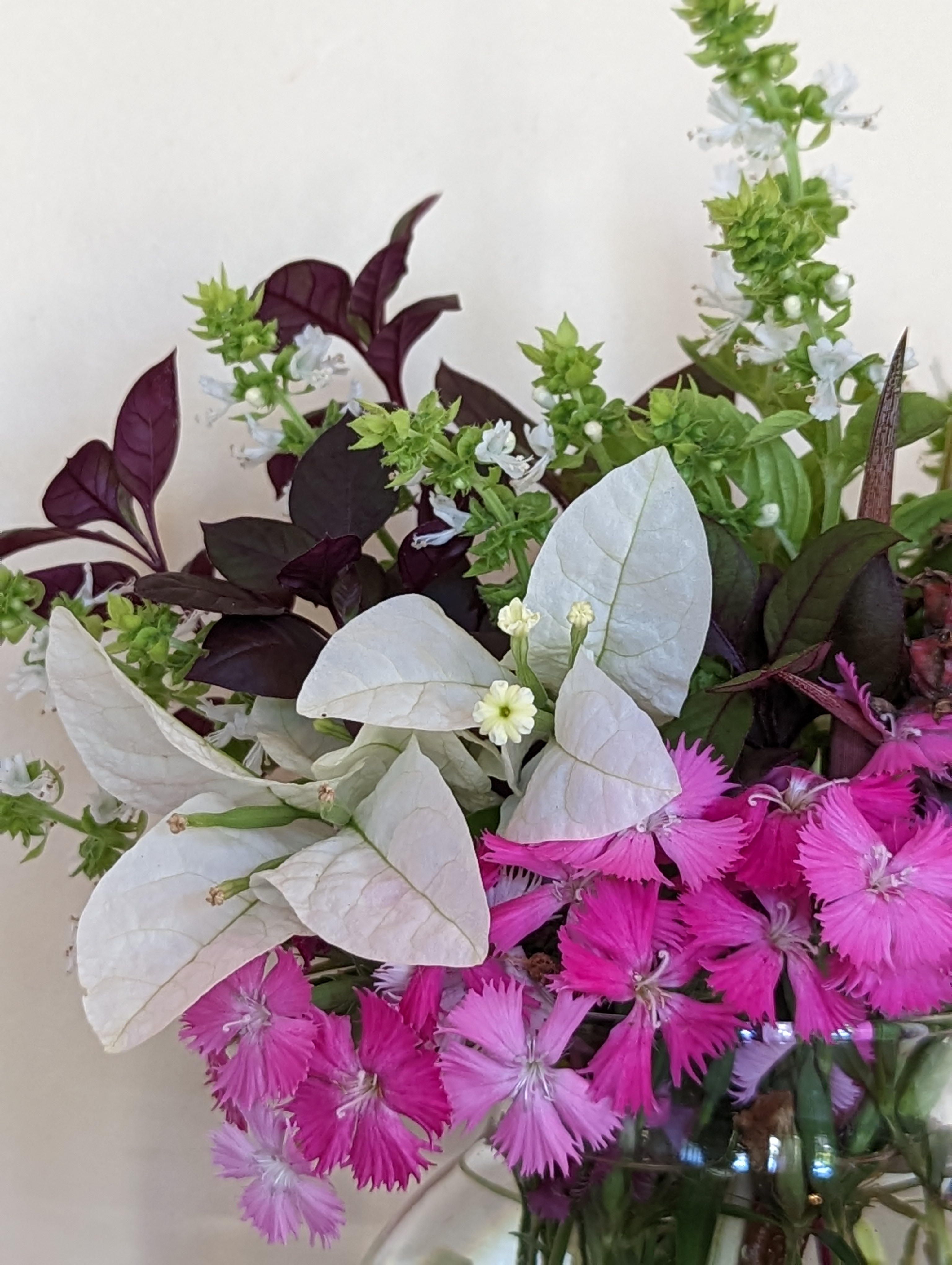 I love the scent of basil, but I think the smell of dianthus is even better! I often have them in pots in summer, next to our front door… just for the fragrance. Good idea to cut them, and the cute pineapple too, if they are only destined to frazzle. They go so well with the dark Purple Prince foliage too. 😃