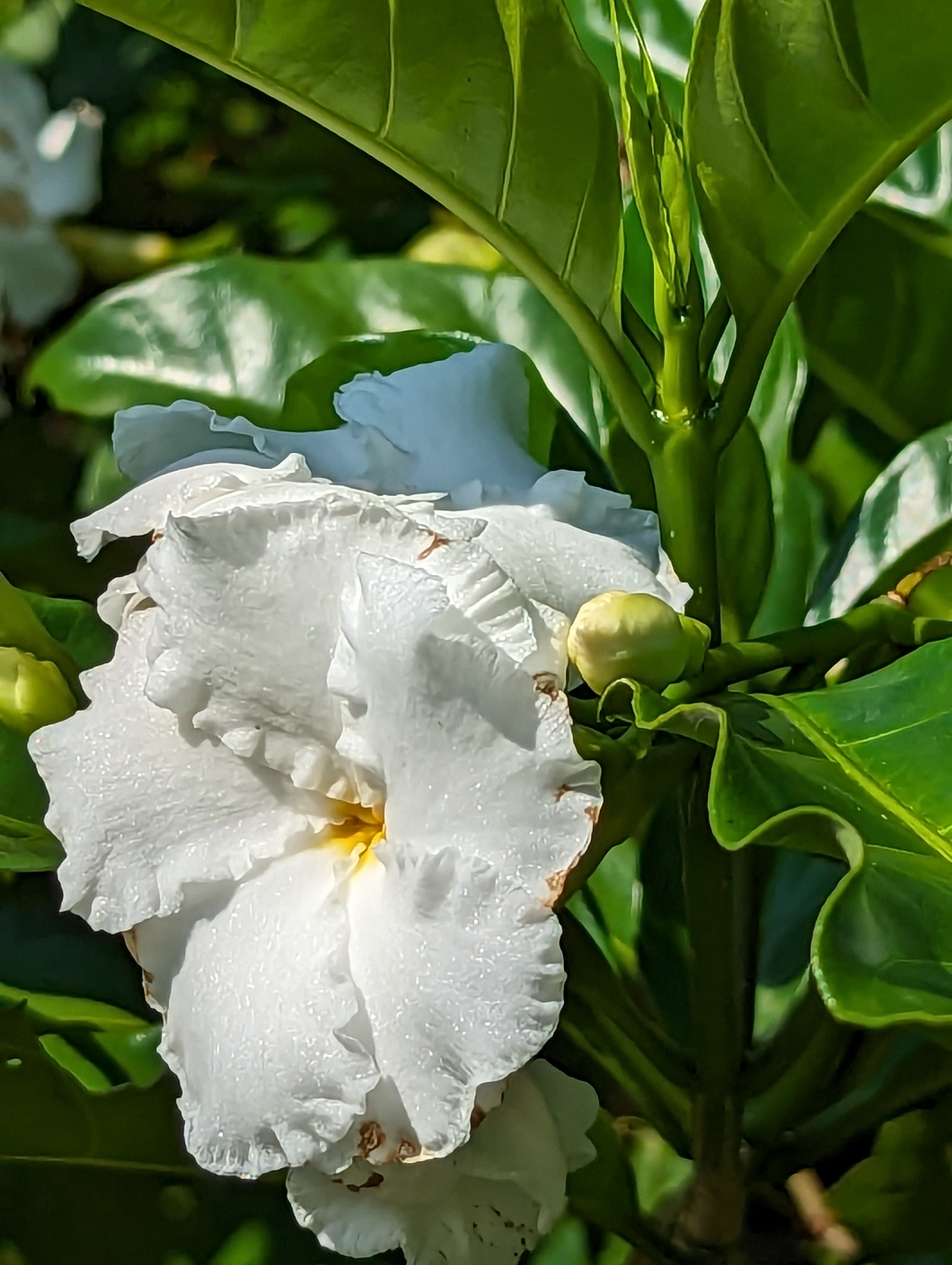 Tropical Gardenias (Tabernaemontana diviricata) soaking up all the moisture and producing lush flowers and leaves.