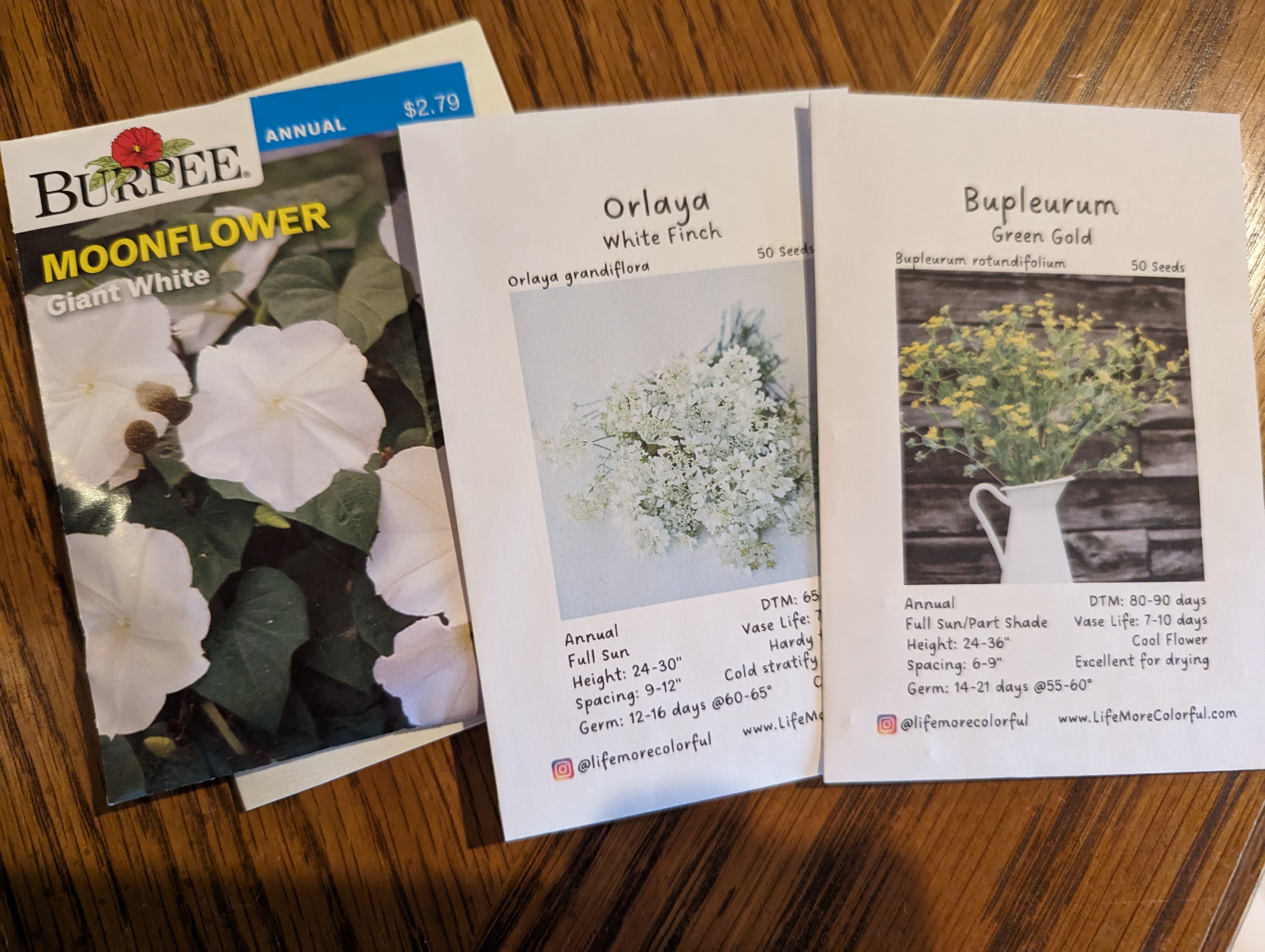 Of course, after the bulb and tuber event some new types of seeds were required. The Moonflowers were sent to me by a friend. I am going to try to grow these along with the Bougainvillea for scent this fall. I have not had Orlaya or Buplerum before and look forward to trying these as cutting flowers. I should have some mad green bouquets this winter. Hopefully with dahlias!