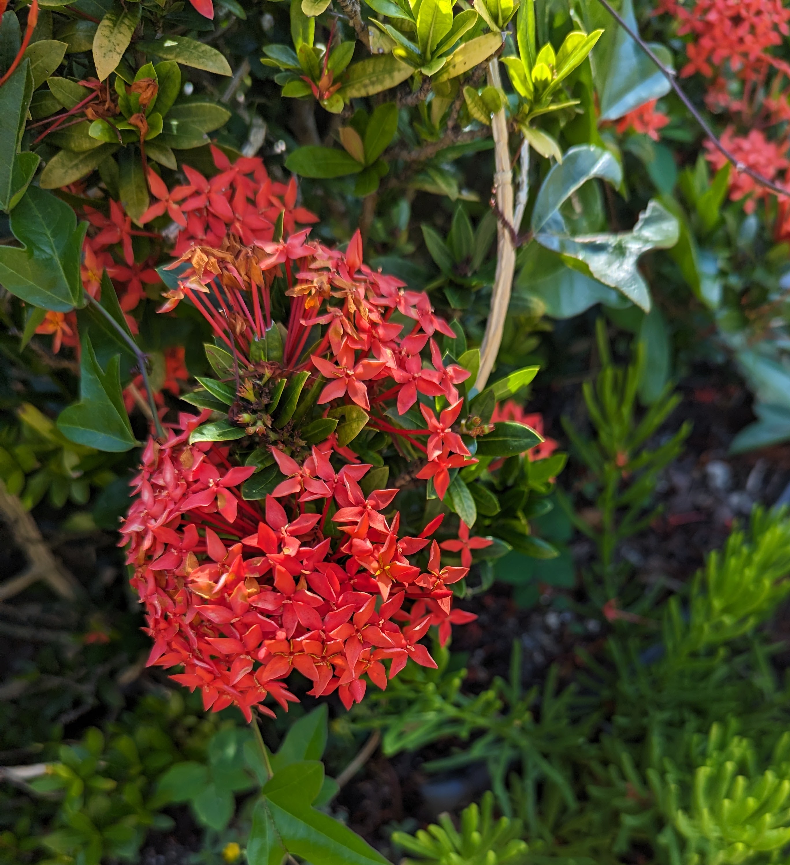Below is a Dwarf Red Ixora (Ixora taiwanensis) having a really good year.