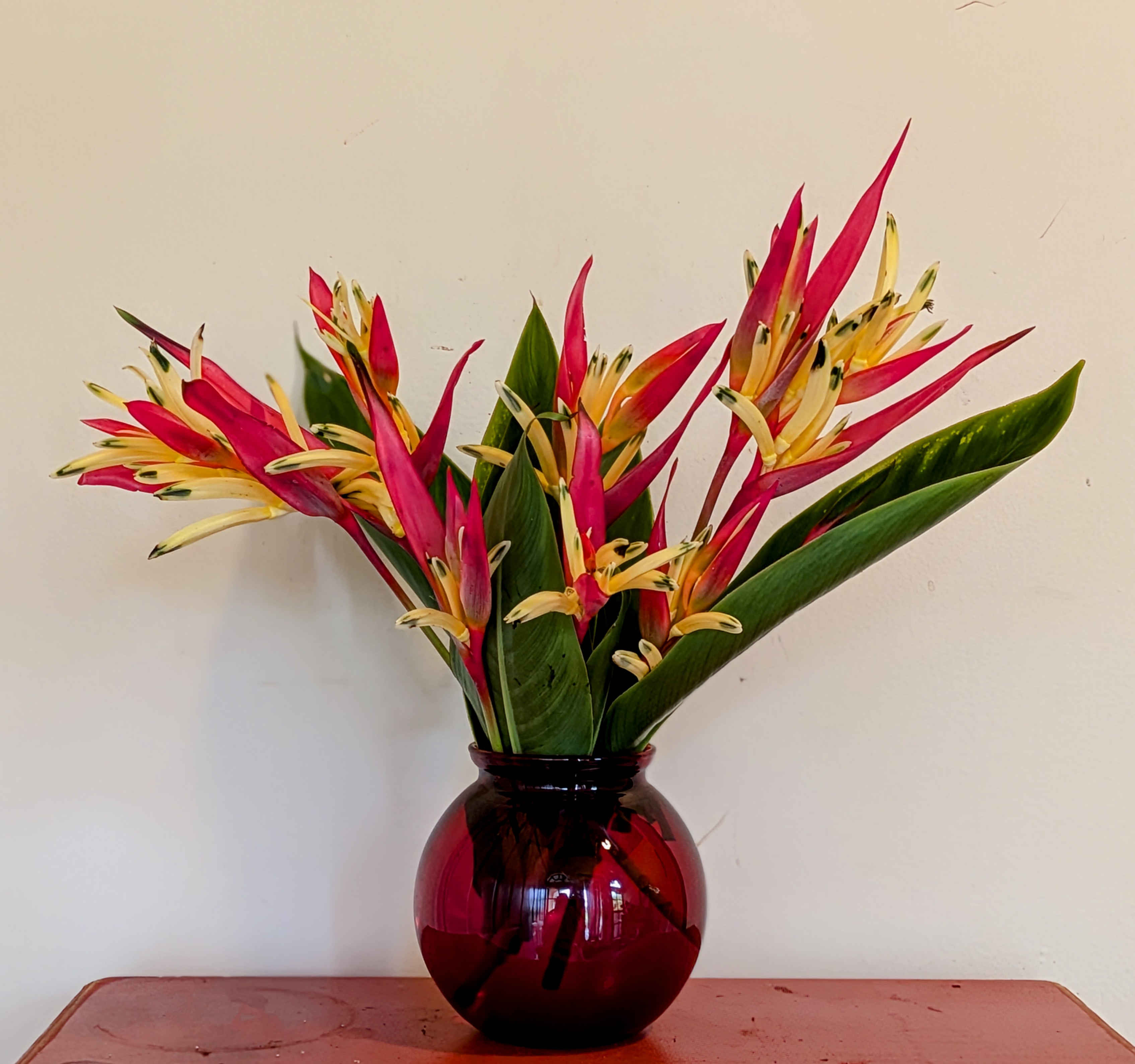I fully intended to put a tropical mixed vase together..until the predicted tropical rainstorm started and hasn’t let up. I had just cut the Heliconias when the bottom dropped out. This weather is a harbinger of things to come this week. Hurricane Milton is brewing in the Gulf of Mexico and is headed my way or somewhere on the Florida peninsula. The weather pundits are babbling away. I rooted around in my vase stash and came up with a red vase for my downsized vision. Sigh.