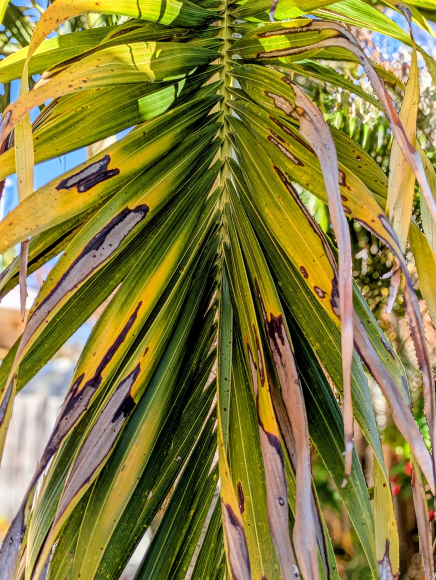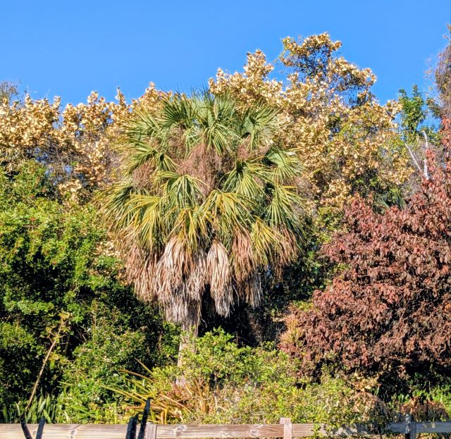 This is an Adonida Palm (Veitchii merrilli) I am probably on the northern edge of hardiness for this tropical palm. I think it will recover, the center growing point is still green and intact as is the trunk. Some of the trunks of the more exposed palms of this type are bronzing.