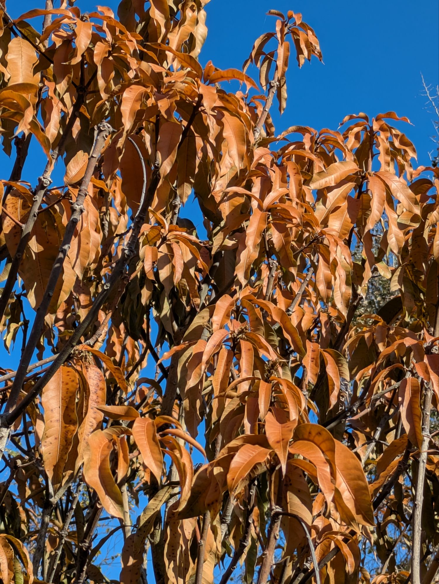 This is a Dendrobium orchid growing in the trunk of an avocado tree. Most of my orchids spent the last week in the tub of my second bath, but this one is well rooted into the bark of the tree. I covered it with pillowcases for several days and it seems to be fine. Fingers crossed. The avocado tree is fine.
