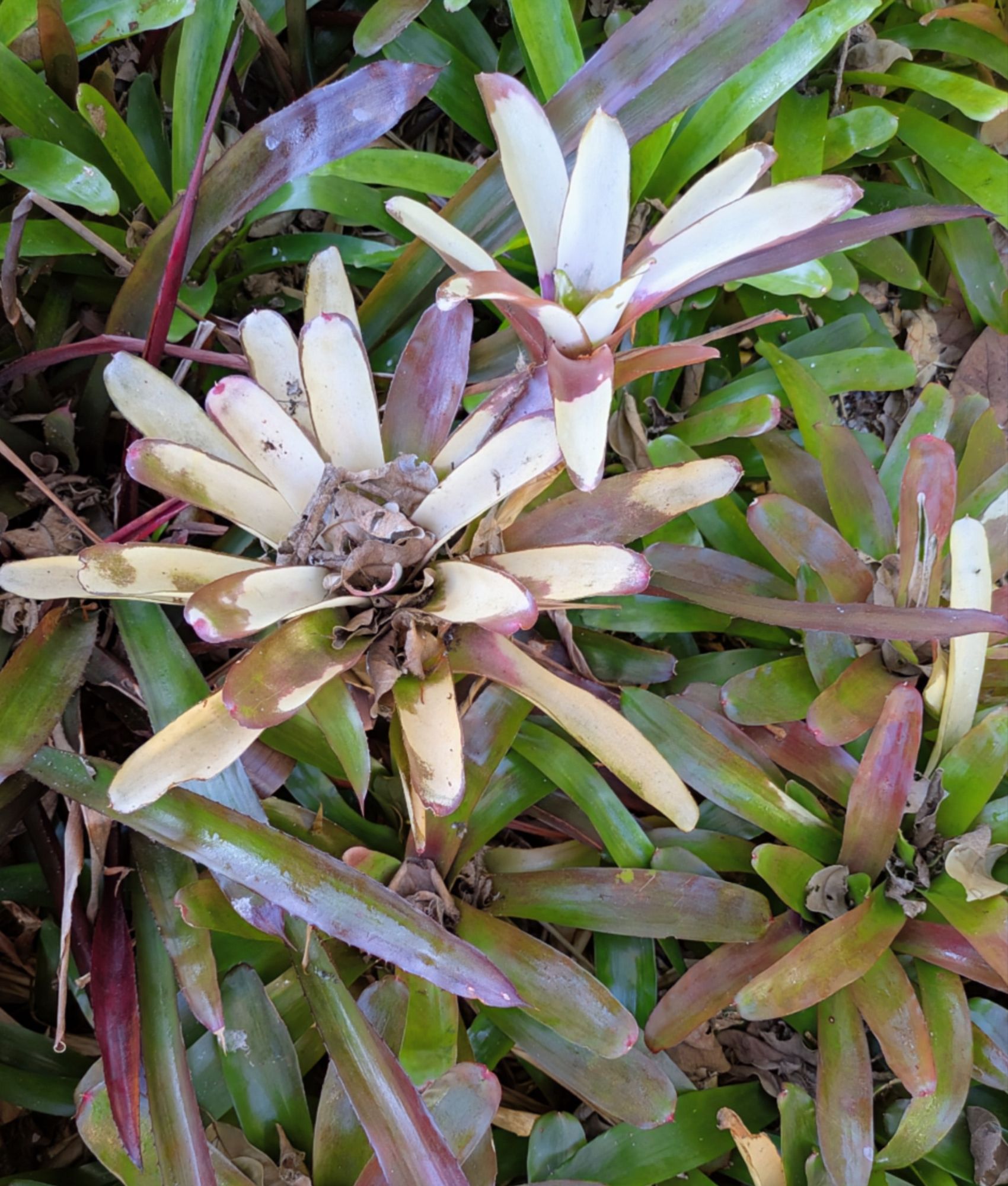 Super Fireball Neoregelia bromeliads burned white. The more exposed the location, the more fried the plants are. The white damage is still growing a week later. I cannot imagine there is anything to do but trim these off.