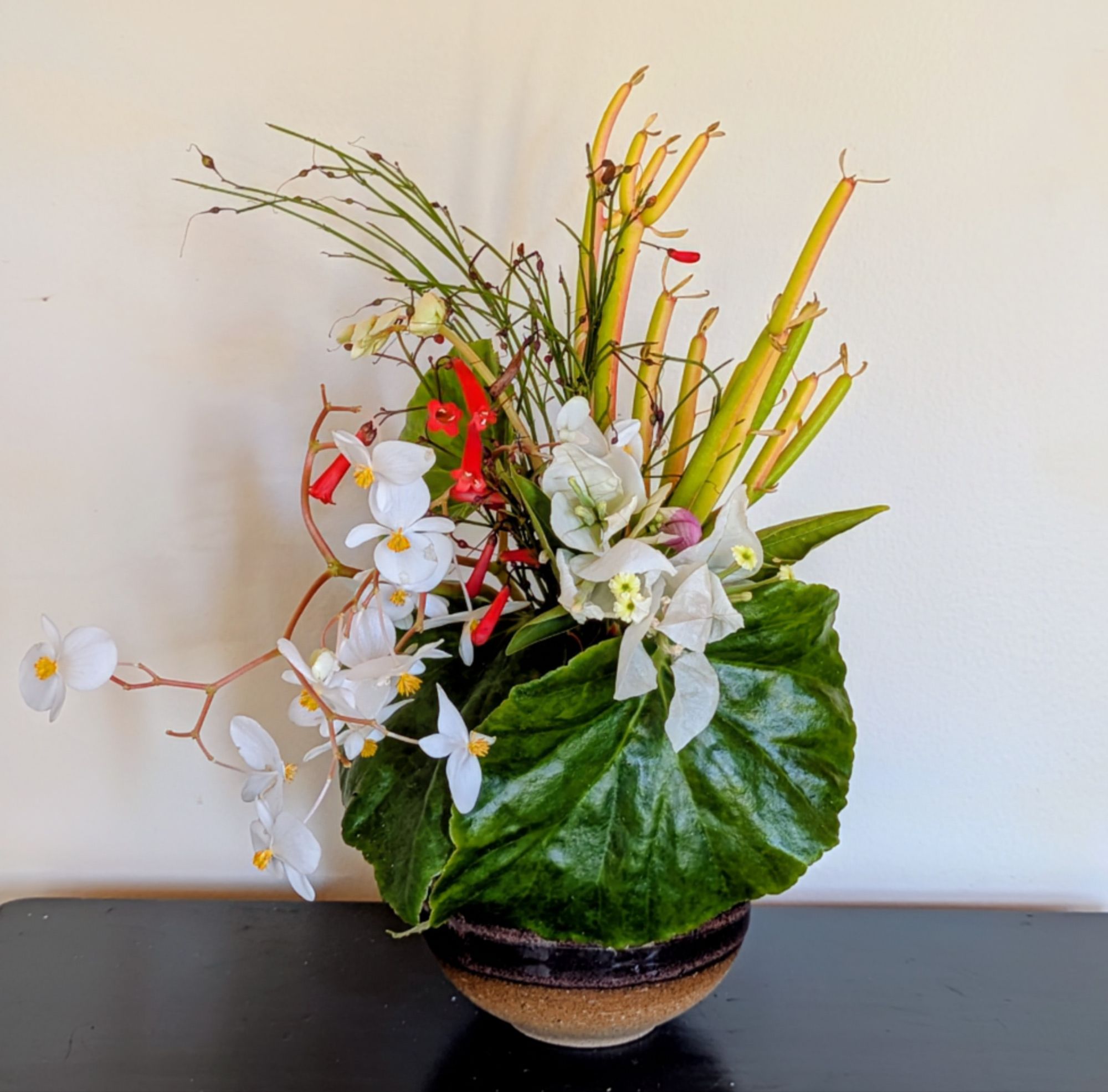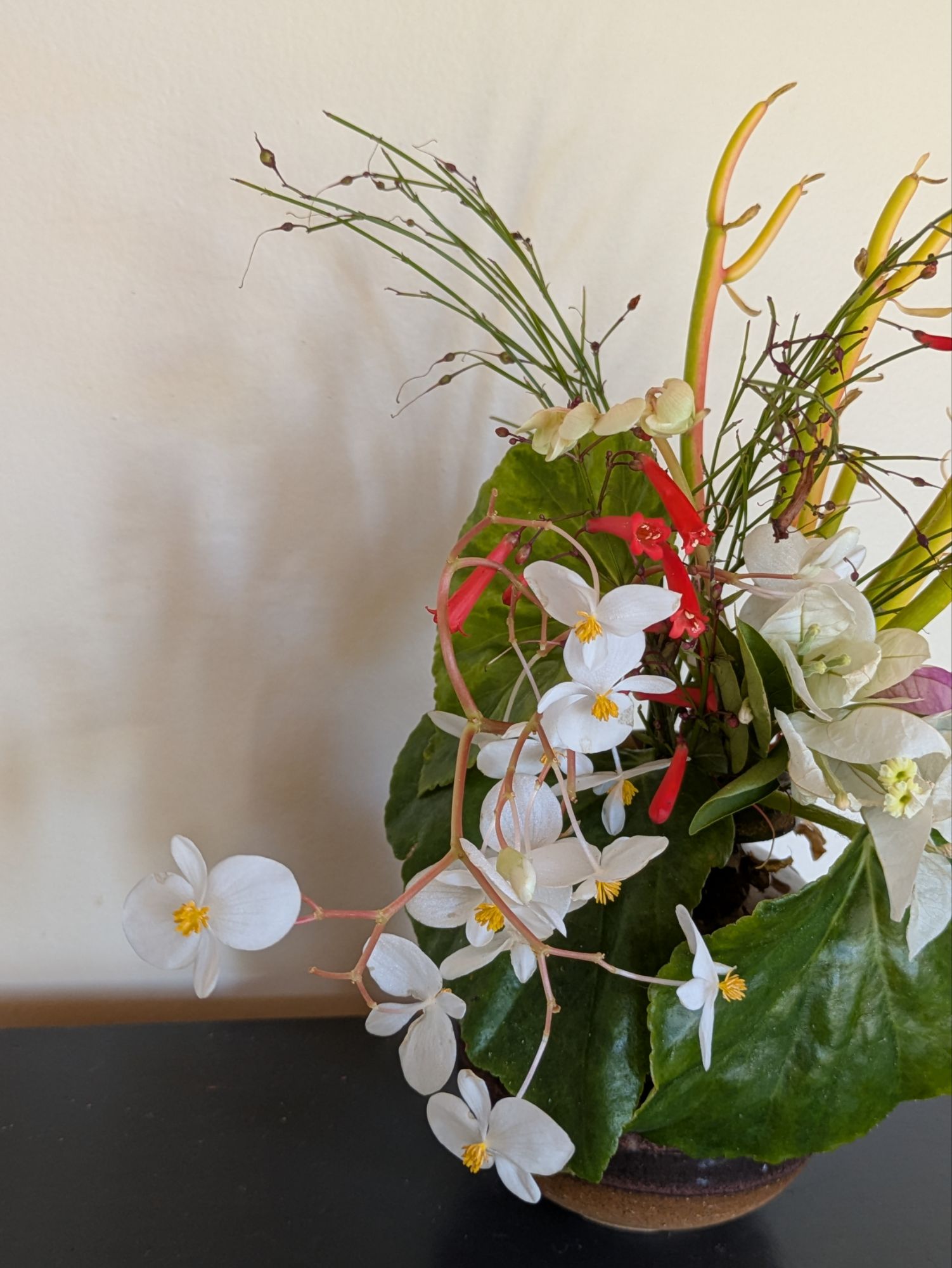 The red flowers, Firecracker plant (Russelia equisetiformis), are the only thing flowering in the garden. The white begonias are tropicals (Begonia odorata ‘Alba’) they spent a few days in the house – otherwise, I am certain the would be toast by now.