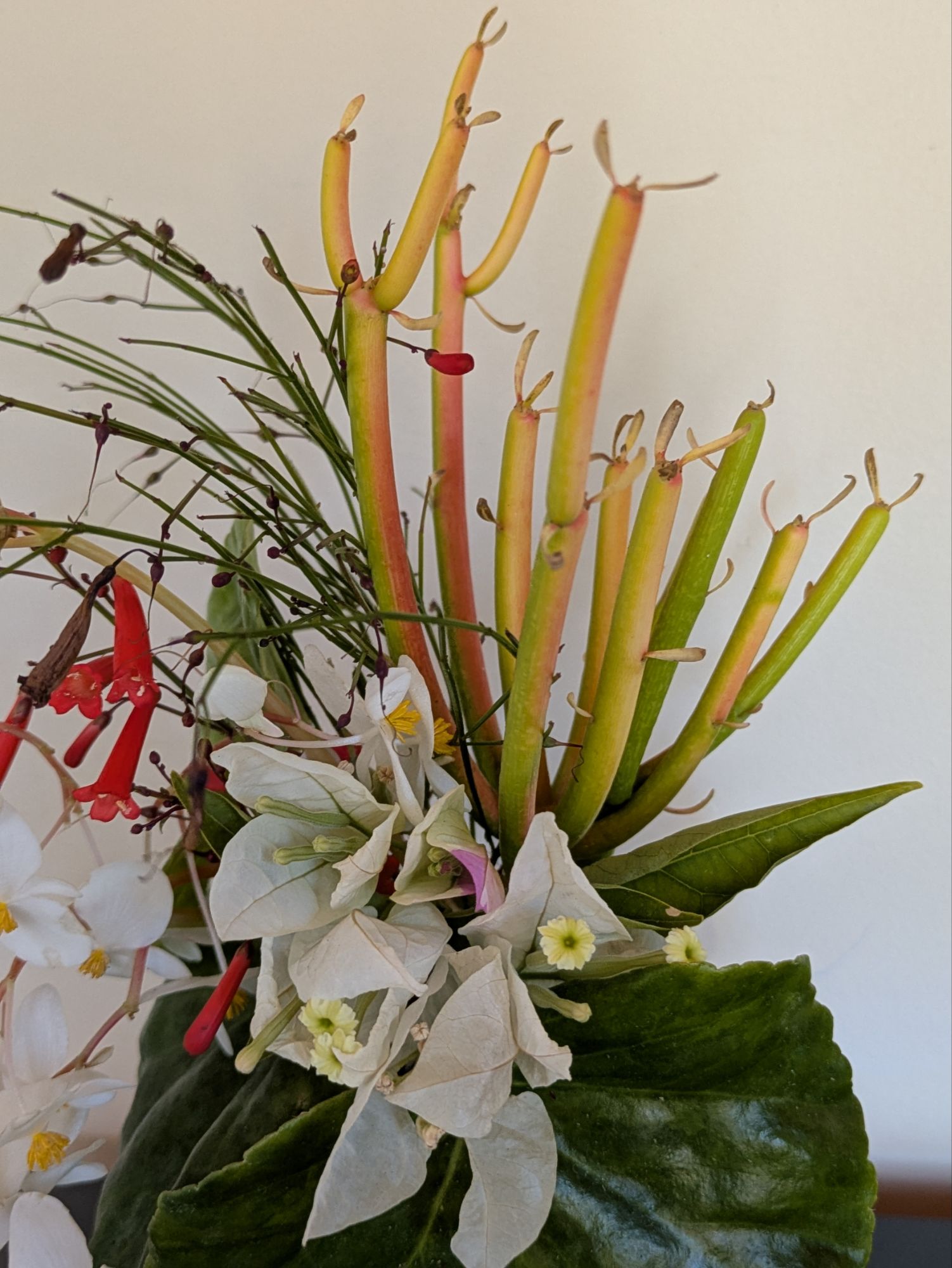 A very big surprise to me, in white, Miss Alice Bougainvillea, not missing a beat after the freeze. I surmise this is due to the proximity to the house. I have seen numerous fried Bougs at the curb this week. The succulents in the background are ‘Firesticks’ Pencil Cactus, living up to their name.