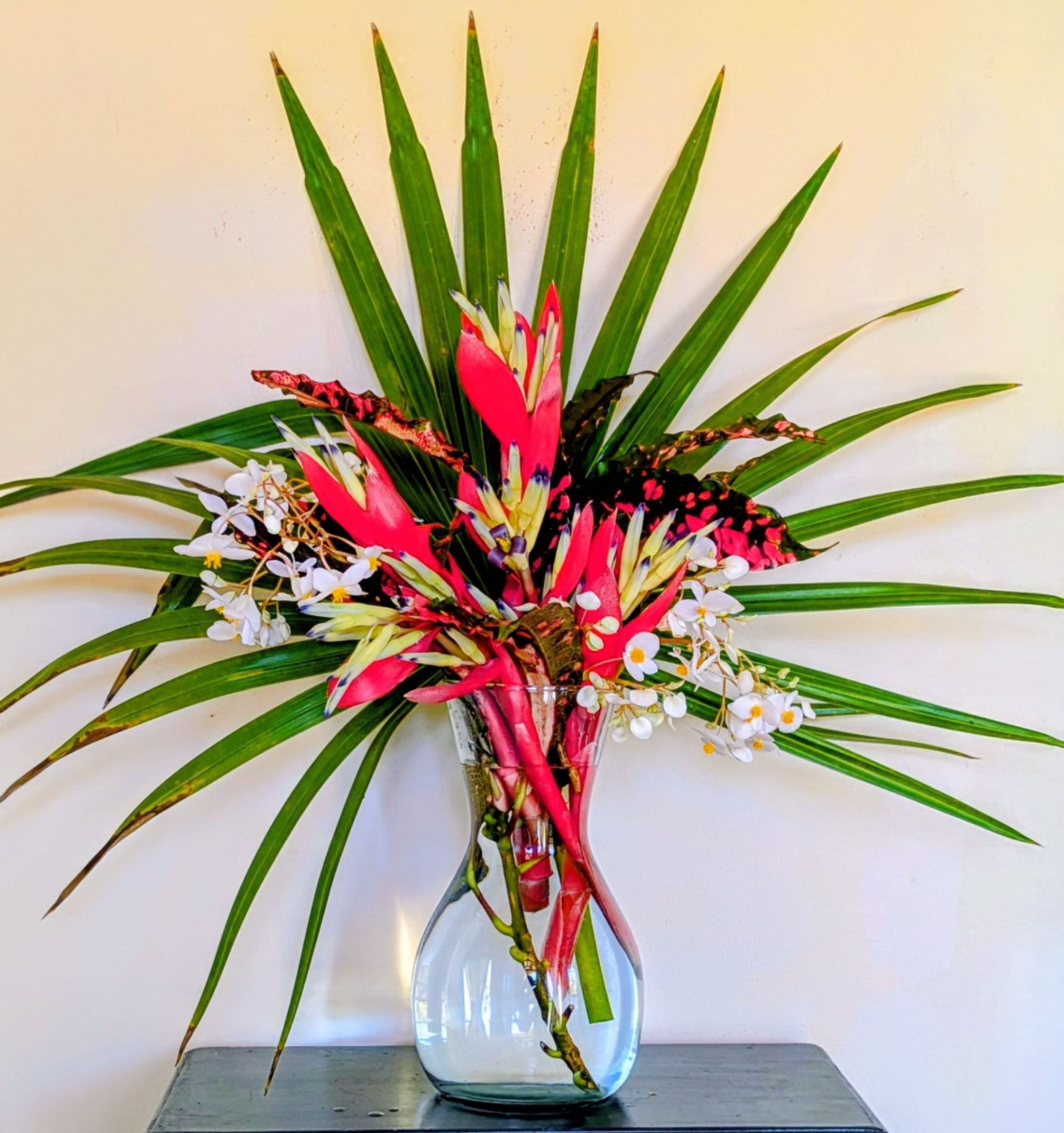 After a morose month in the garden, I am finally witnessing the rebirth of the tropical vibe. It is such a relief to find bromeliads and tropical begonias flowering and the not really cold hardy palm is so fine I filched a frond. I found some green sprouts on my terrifyingly brown mango tree. Fingers still crossed for the mango.