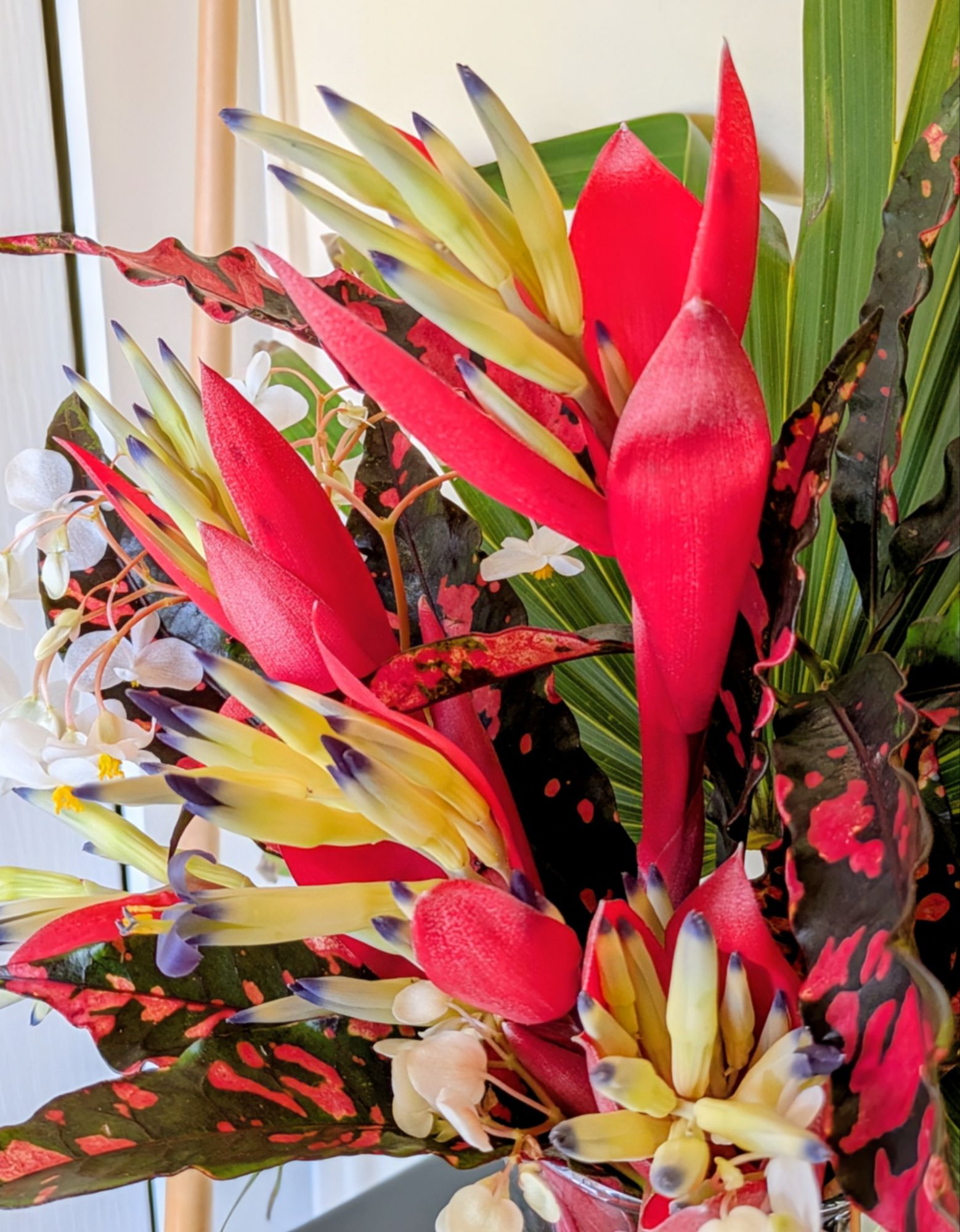 The red, yellow and blue flowers are from Billbergia vittata, a bromeliad that is obviously cold hardy. I would like to know the variety, but have no clue! Red and black (yea, weird) foliage is from Pie Crust Croton (Codieum varigatum) White flowers are Sweet Begonia (Begonia odorata ‘Alba’) this is a very common winter bedding plant here. I usually have them year round and take cuttings for new ones as needed. The frond providing background drama is from the native Thatch Palm (Thrinax radiata). These are so slow growing it is laughable. I bought one about ten years ago – it is not 3 feet tall yet.