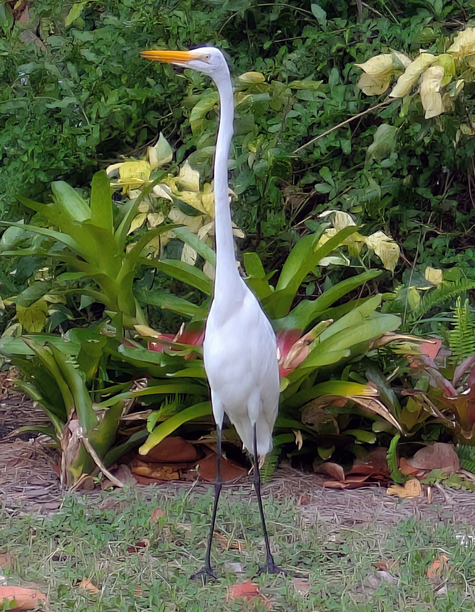 A totally different flight landed in the front garden. This is a Great White Egret easily four feet tall.