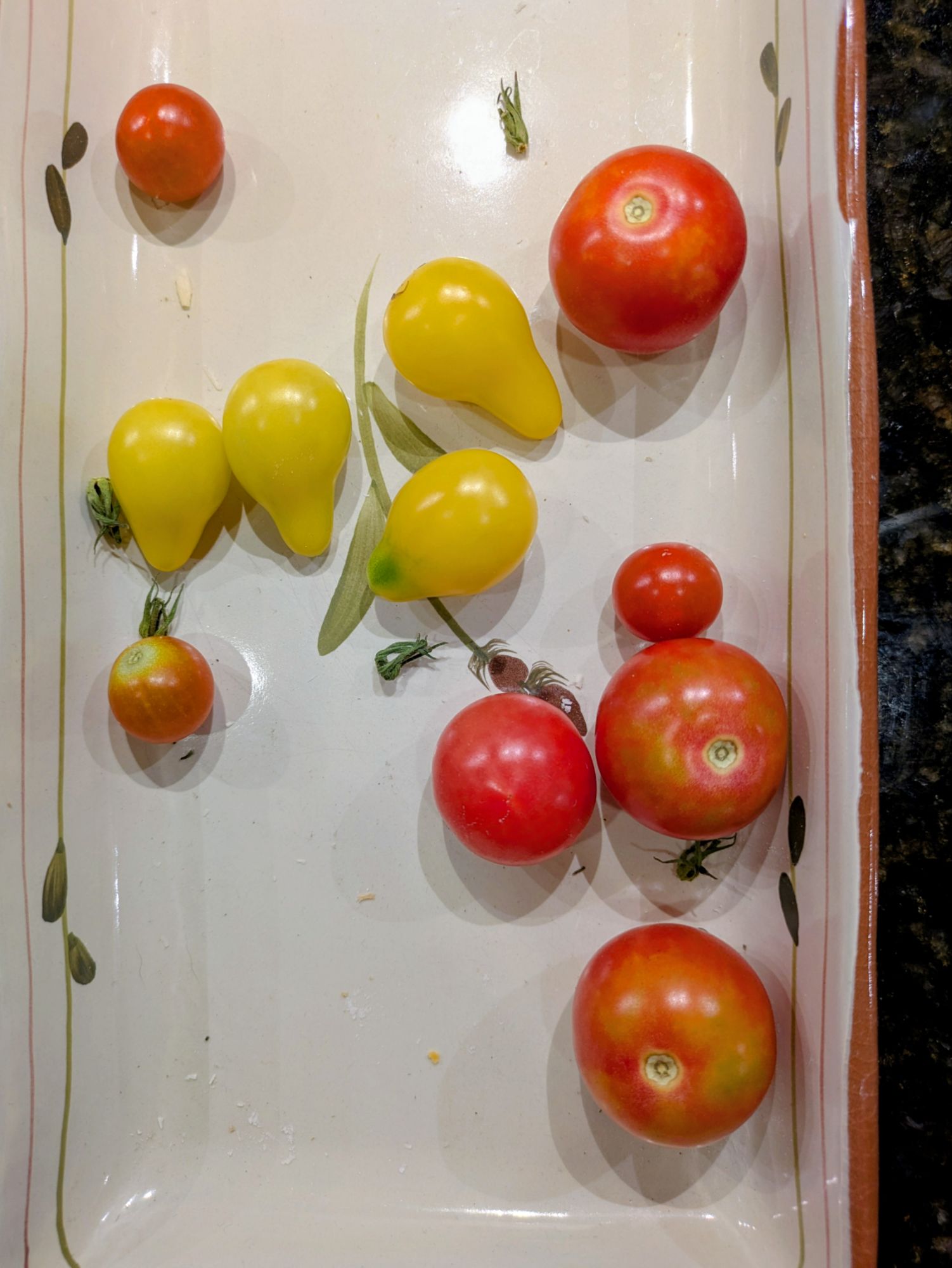 I have been picking tomatoes for a week or two. Here is a lesson in open pollination. I saved seed last year thinking I would get large yellow pear tomatoes. I got some! And some much larger pink campari style tomatoes and small red cherries. Fortunately, they are all delicious.