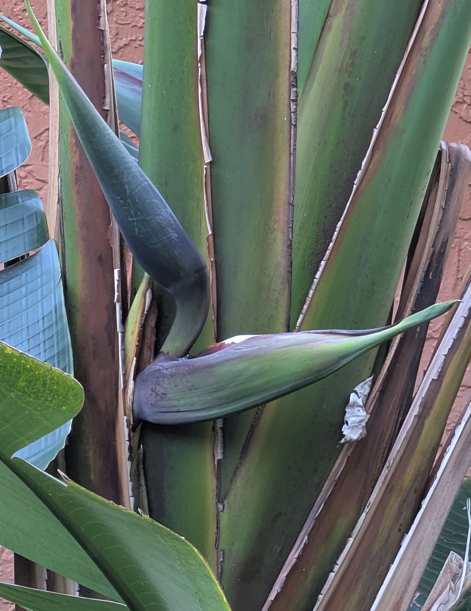 This is a bud on a White Bird of Paradise (Strelizia nicolai) This has been in the garden for 7 or 8 years, is at least 12 feet tall and this is the second flower! I keep going out to see if it opened yet.