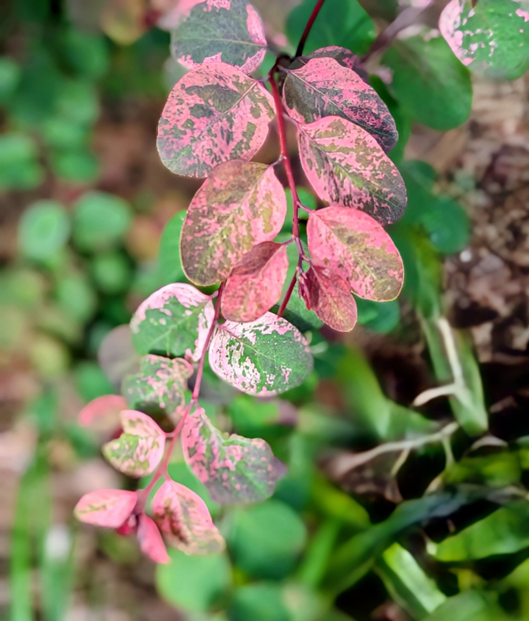 Spring snow is starting on the Hawaiian Snowbush (Breynia disticha) The foliage gets a bit whiter and then goes back to green. This is a bit of a garden thugs and difficult to pull up.