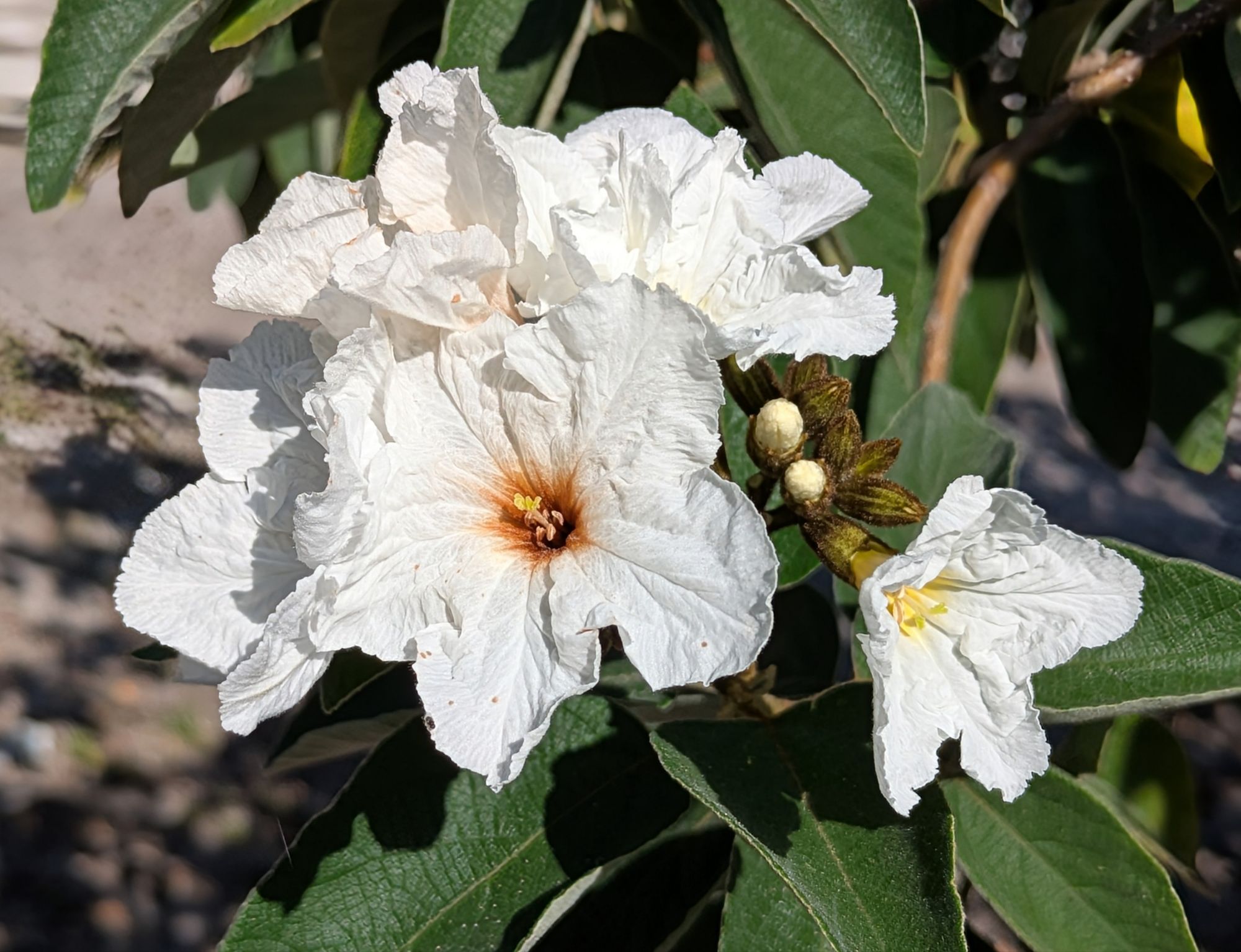 White Geiger (Cordia boisserei) has been flowering for a couple of weeks. This is sometimes called Texas Olive as it is native there and produces odd, olive like fruit. The fruit is edible but oddly gelatinous and best left for wild life. My greyhound will eat it if left to his own devices.