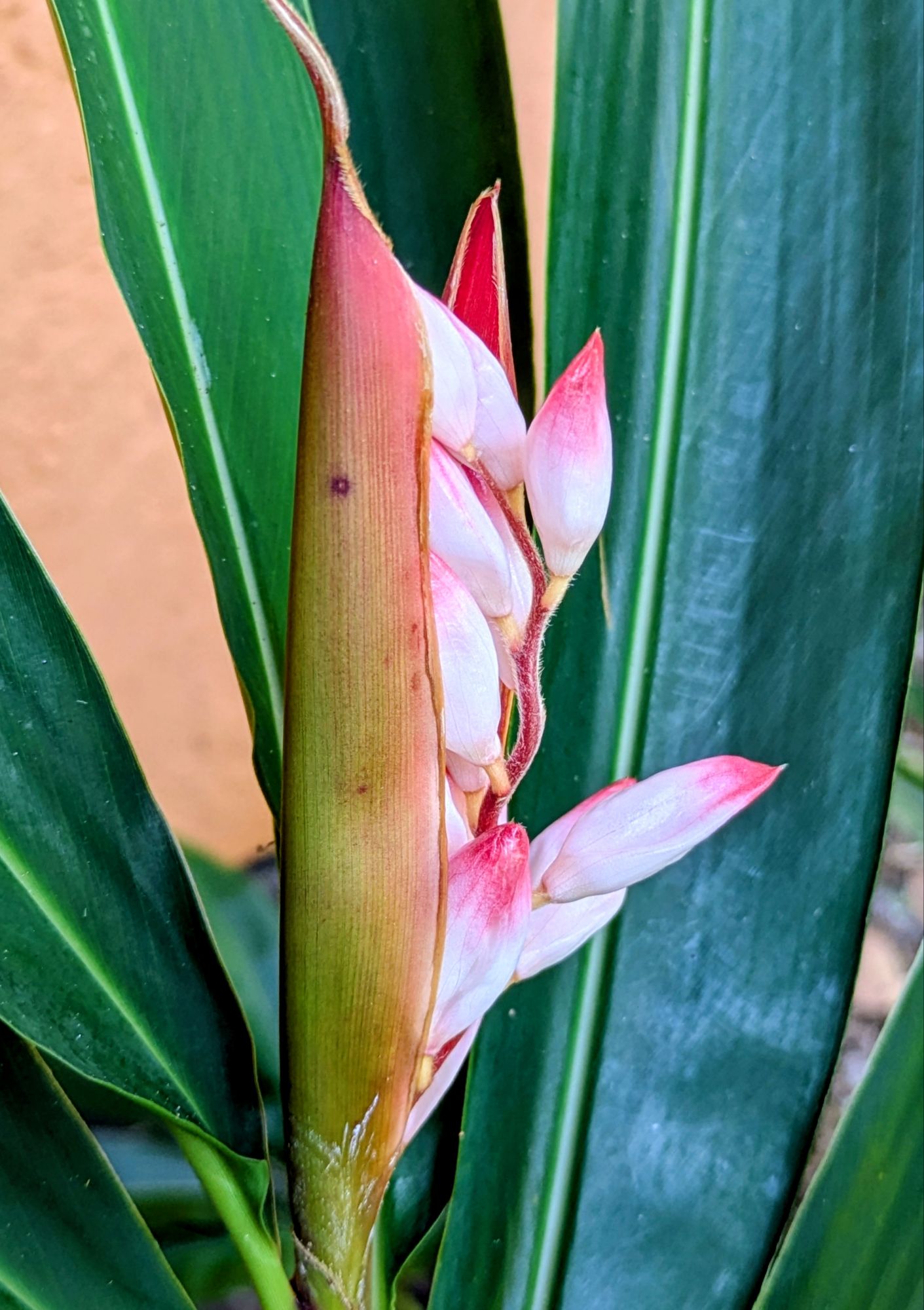 White and pink Shell Ginger (Alpinia zerumbet) are budding and blooming.