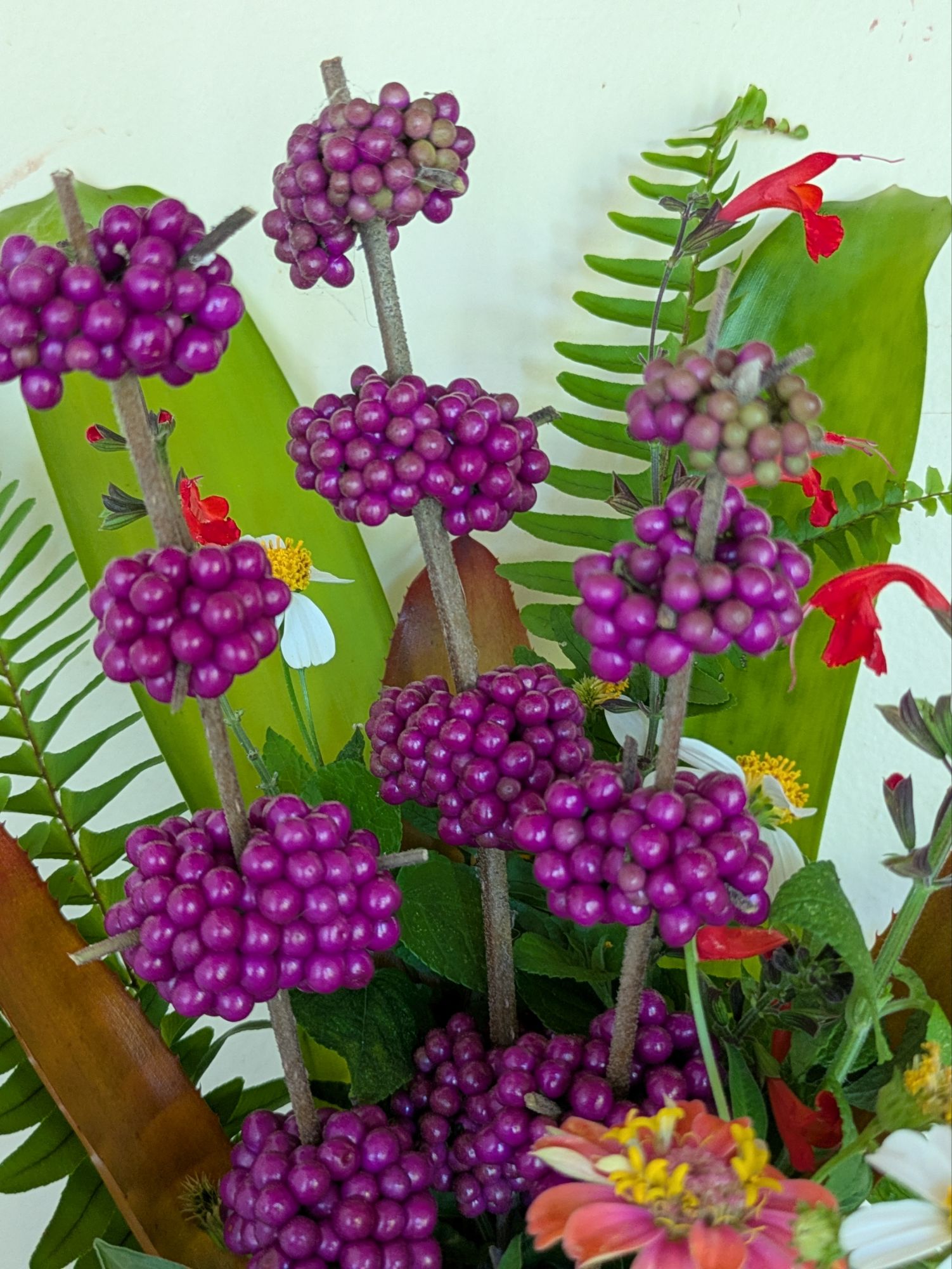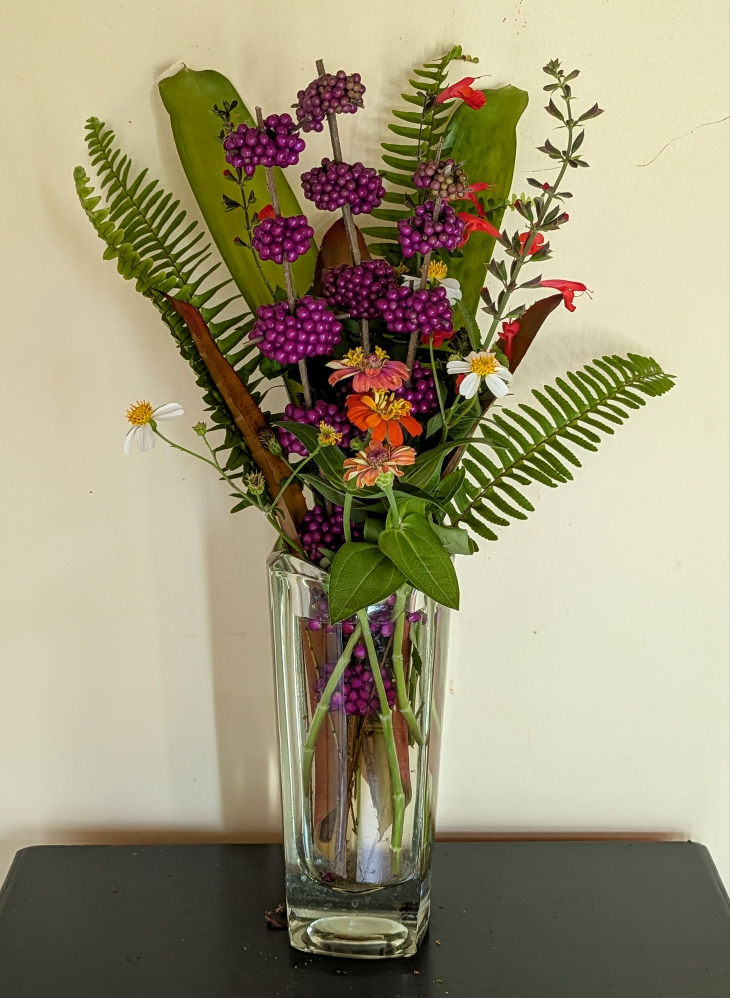 The purple beautyberries (Calliocarpa americana) have been spectacular this year. Even my husband noticed, which is a bit shocking. I collected another cup of berries to freeze and bake treats later. Red flowers are Tropical Red Salvia (Salvia coccinea). Green foliage is Asian Sword Ferns (Nephrolepis brownii) and Macwilliamsii Neoregelia Bromeliad.