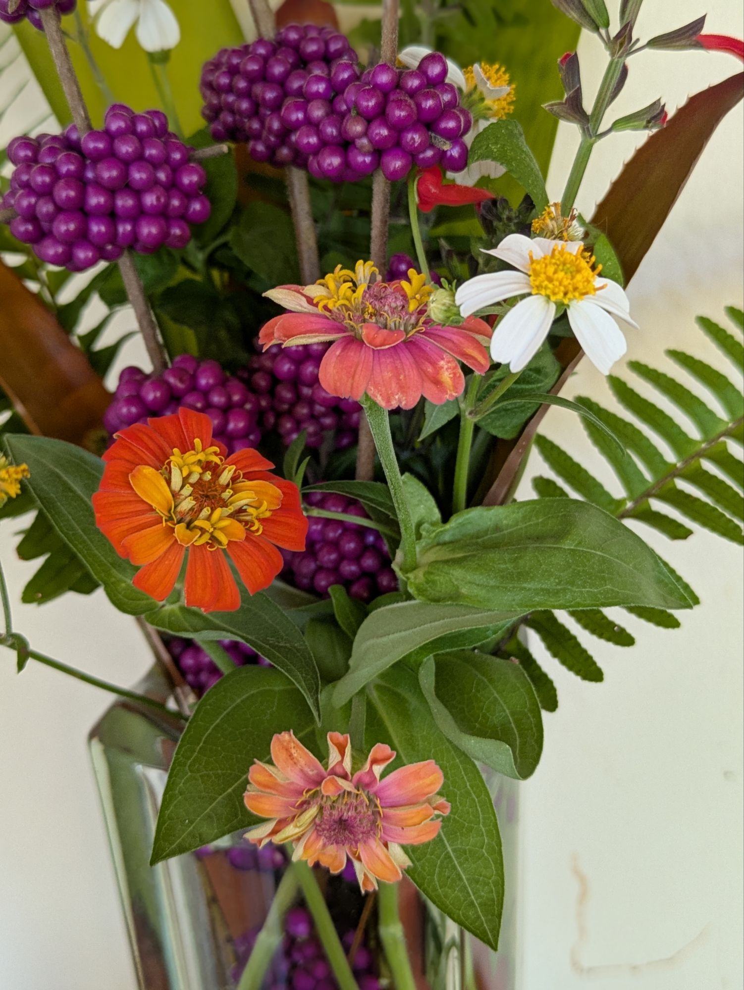 September is finally here. It rained, the weather cooled (ever so slightly) and the flowers opened their buds and cheered. I collected a few of the celebrants, then added some fruits and foliage and am now enjoying the fall colors.