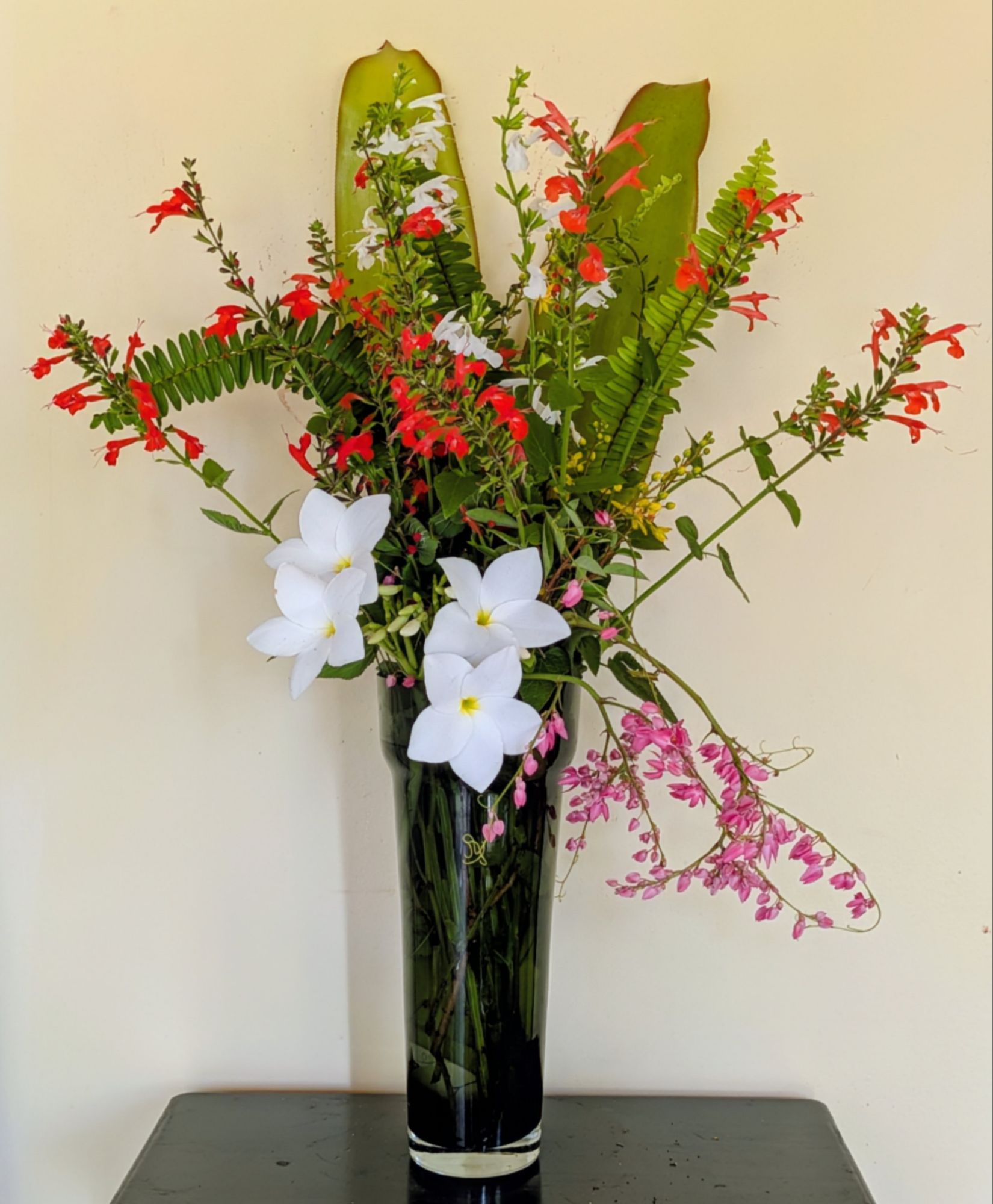 The rest of the arrangement is “Lady Di” Heliconia (Heliconia psittacorum) in red and yellow. The ferns are my favorite invasive fern, the Asian Sword. The vase came with a flower arrangement that was not from my garden.