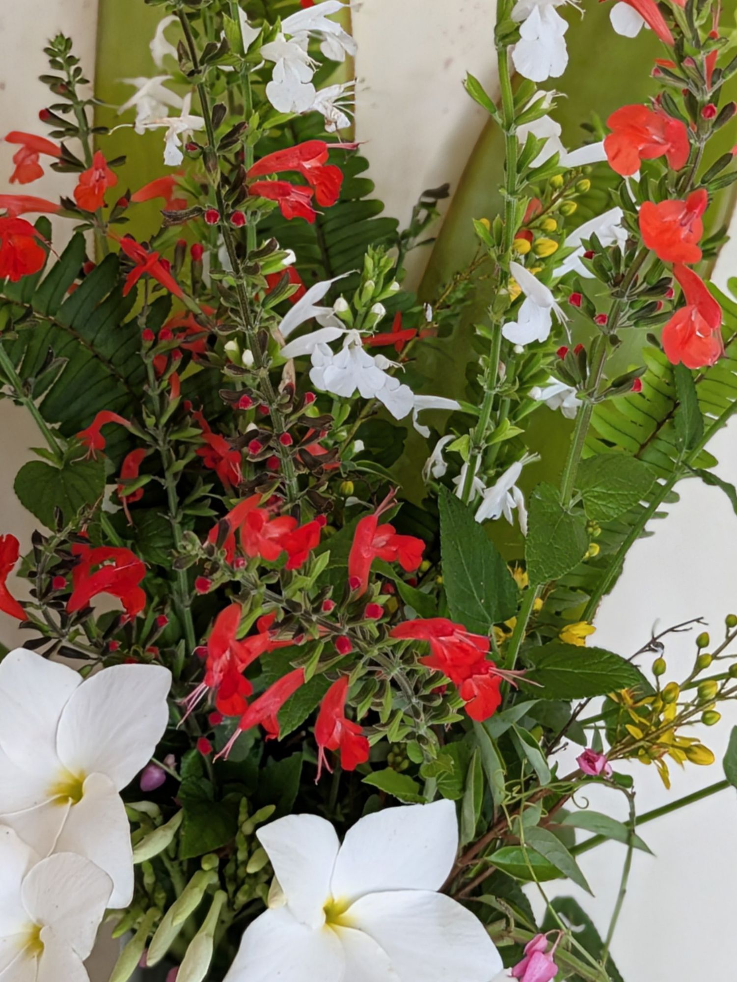 A close up of the Tropical Red Salvia (Salva coccinea). The background plants are Lemon Blanchetiana Bromeliad foliage and Asian Sword Ferns. A sprig of Bridal Bouquet Frangipani (Plumeria pudica) was added for fragrance.