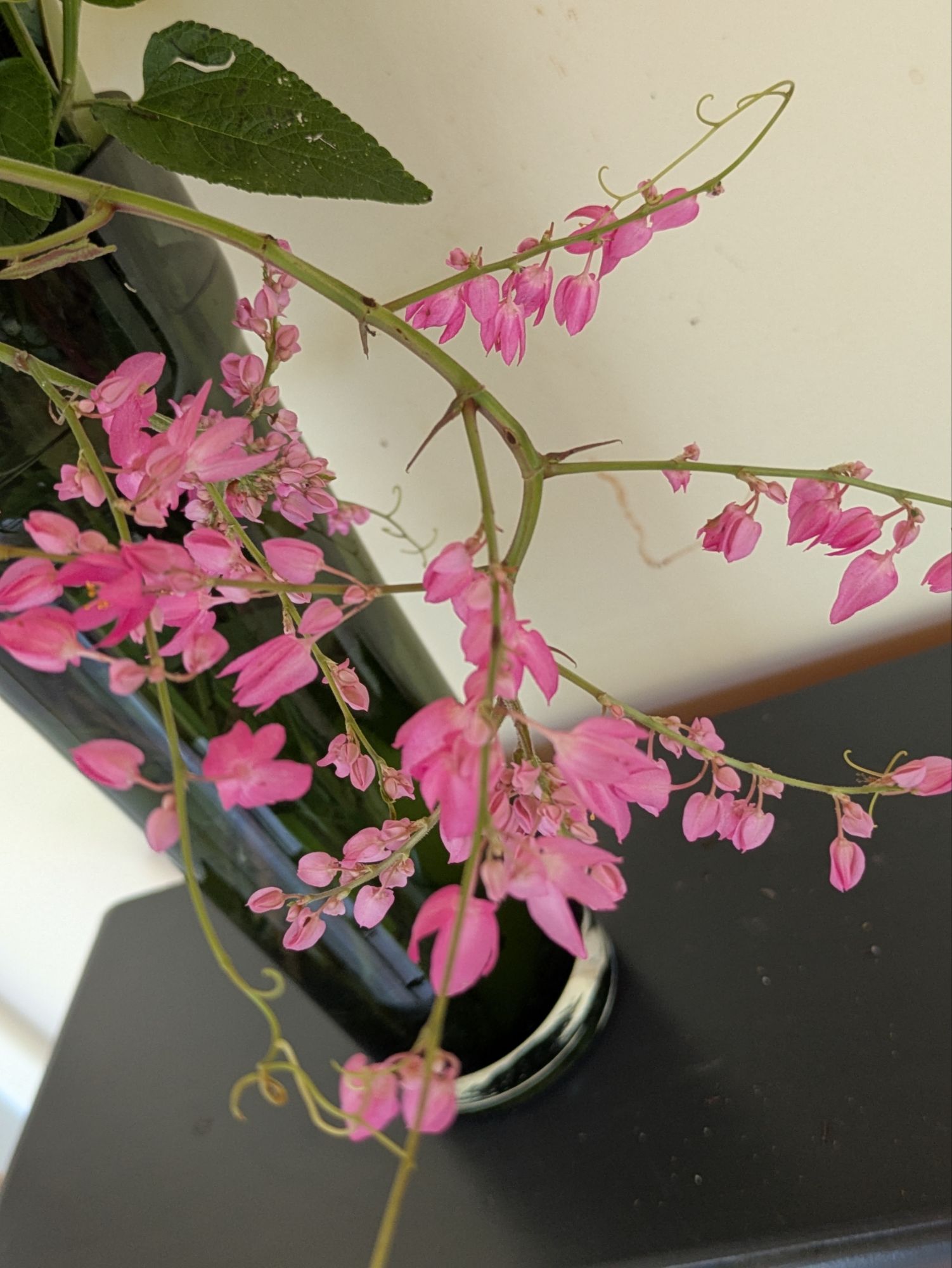 A twining stem of Coral Vine graces the edge of the vase. This vine (Antigonon leptopus) refuses to grow on the fence it was planted beside and prefers to climb the very thorny lime tree. I pick a piece out now and then and usually manage to get stabbed.