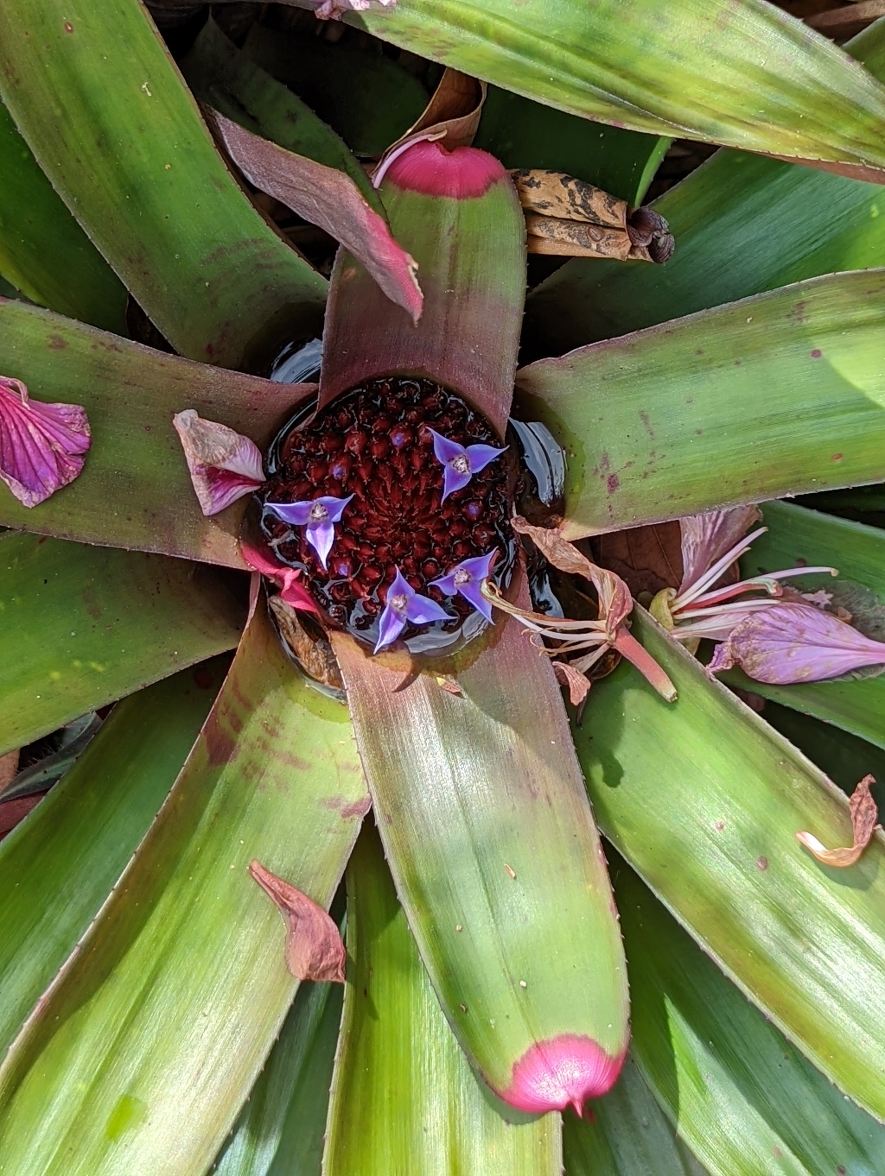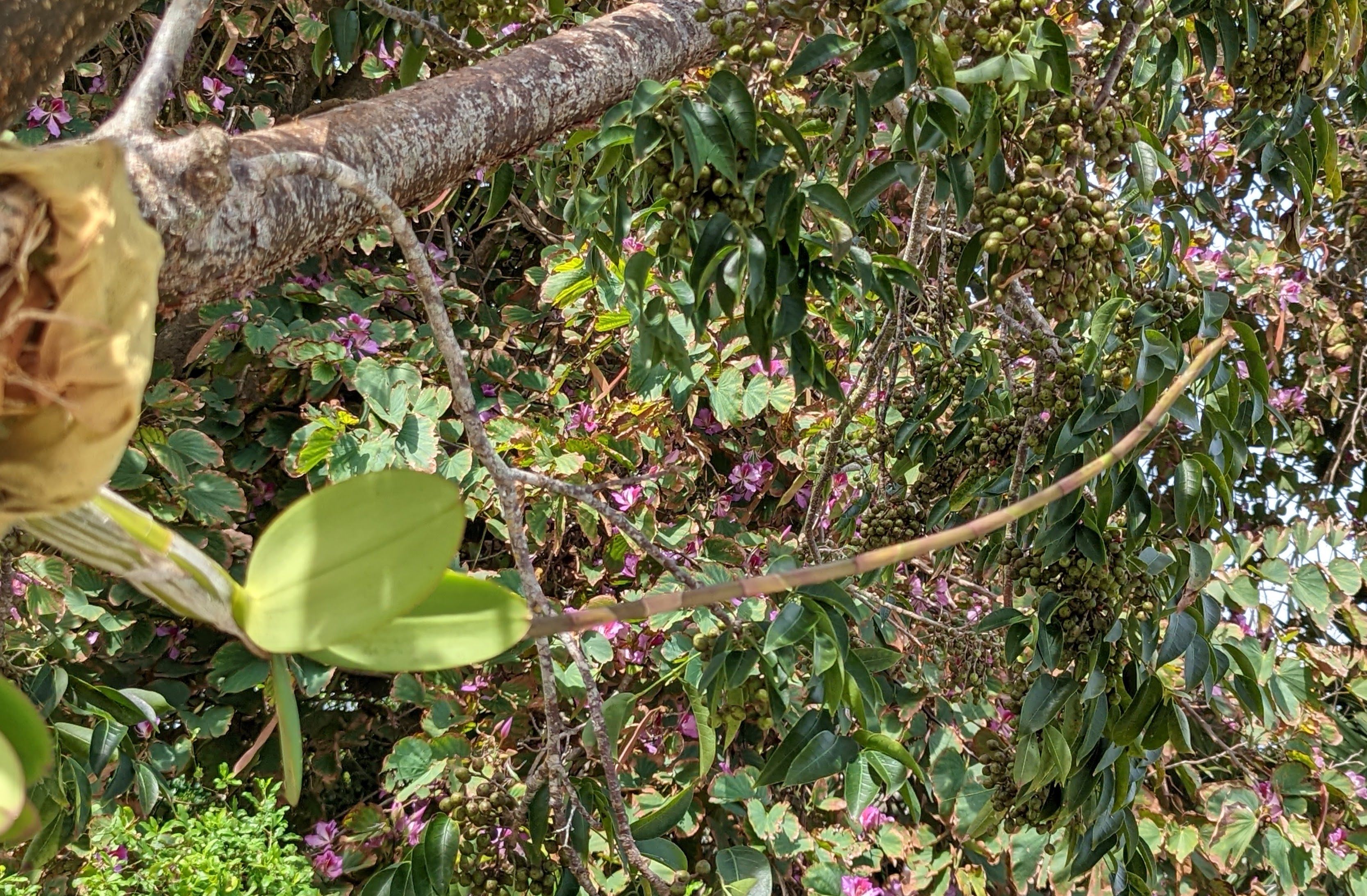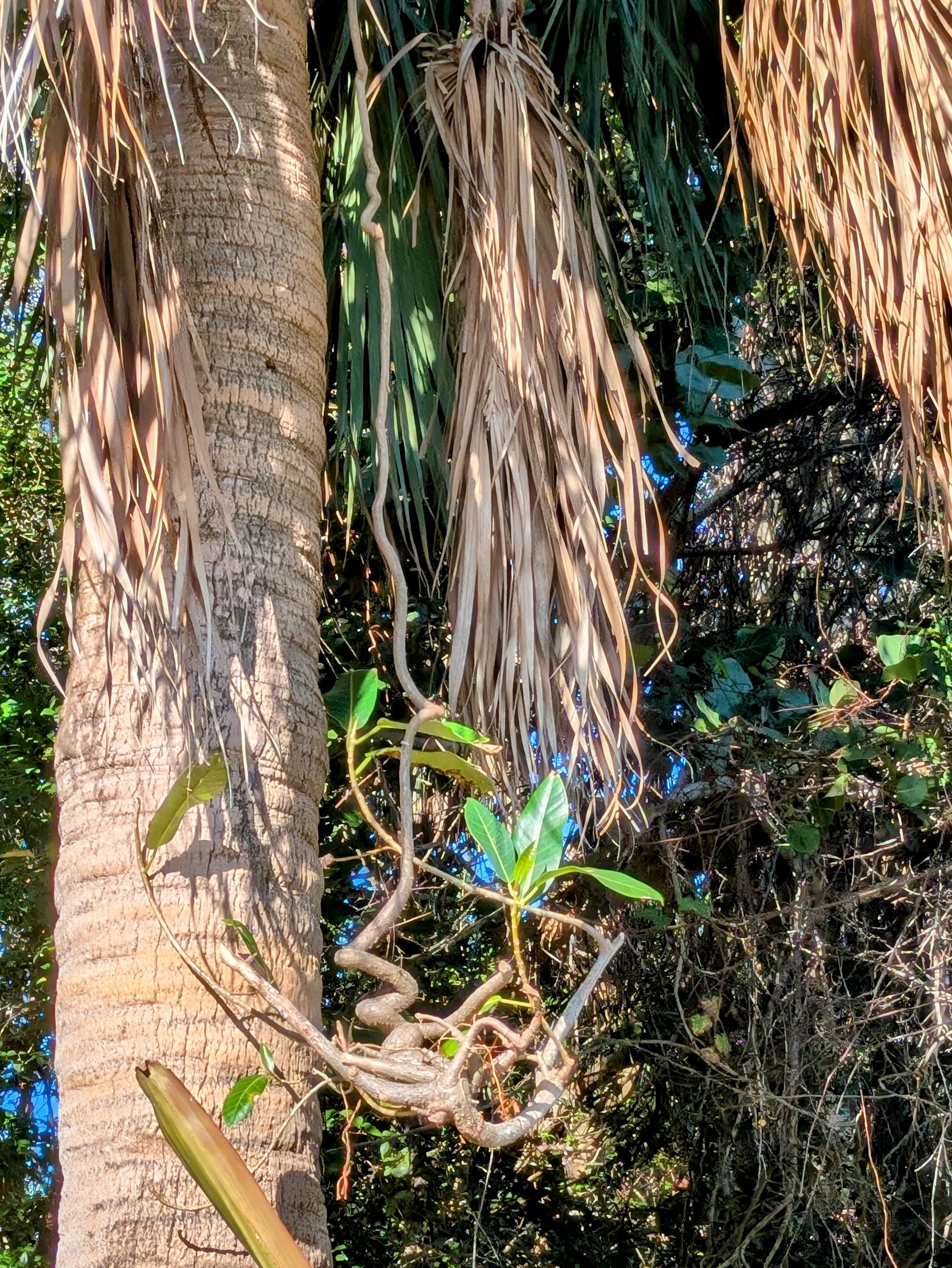 More of the weird and wonderful in my garden. This is a Strangler Fig (Ficus aurea) seedling seeking ground from the top of a Sabal Palm. The fruit from the Strangler Fig is left by wild life in the crown of the palm. It sprouts and eventually sends a tree back down to the ground. The tree roots and grows up around the palm and “strangles” it. Very Harry Potter.