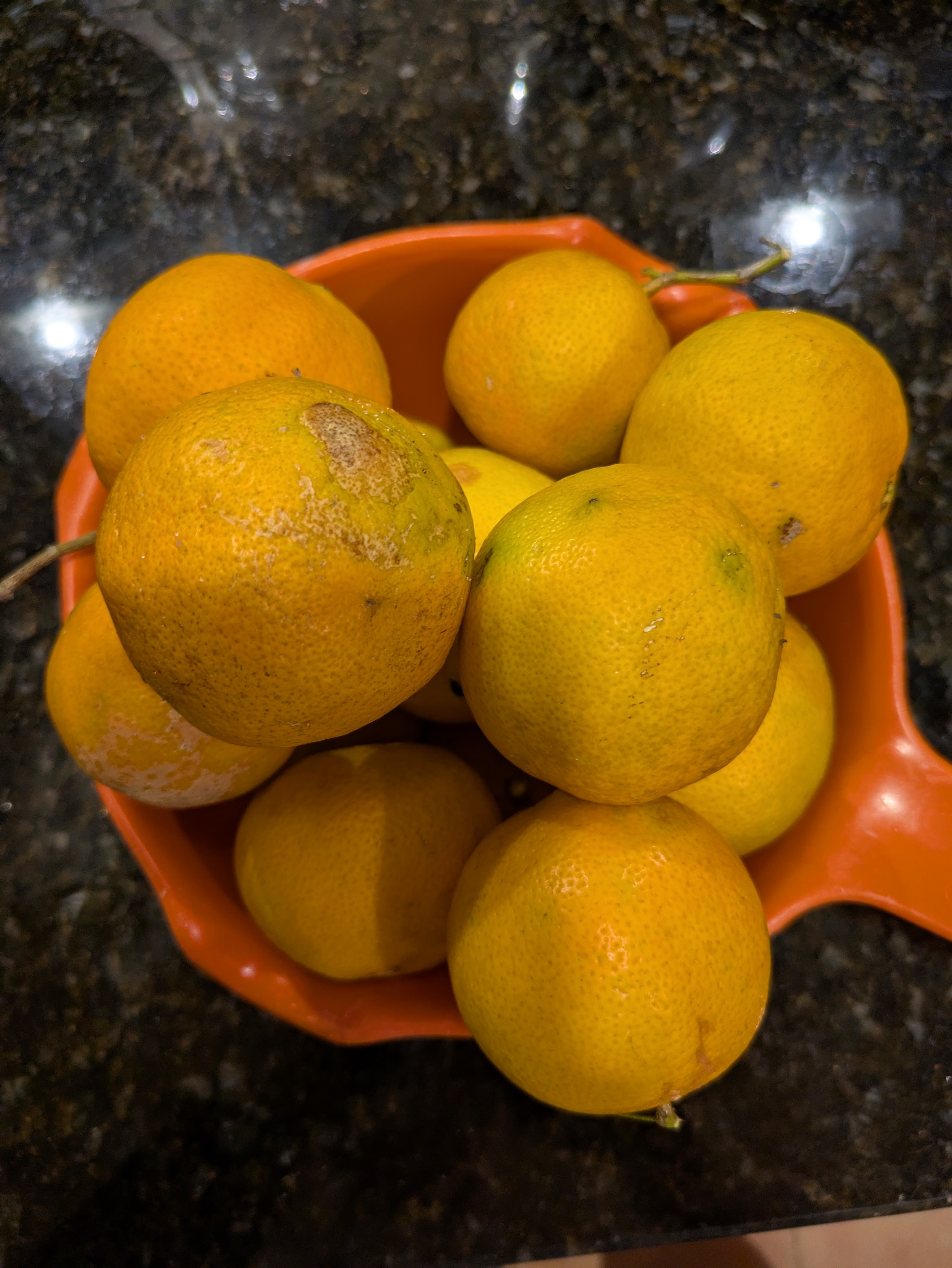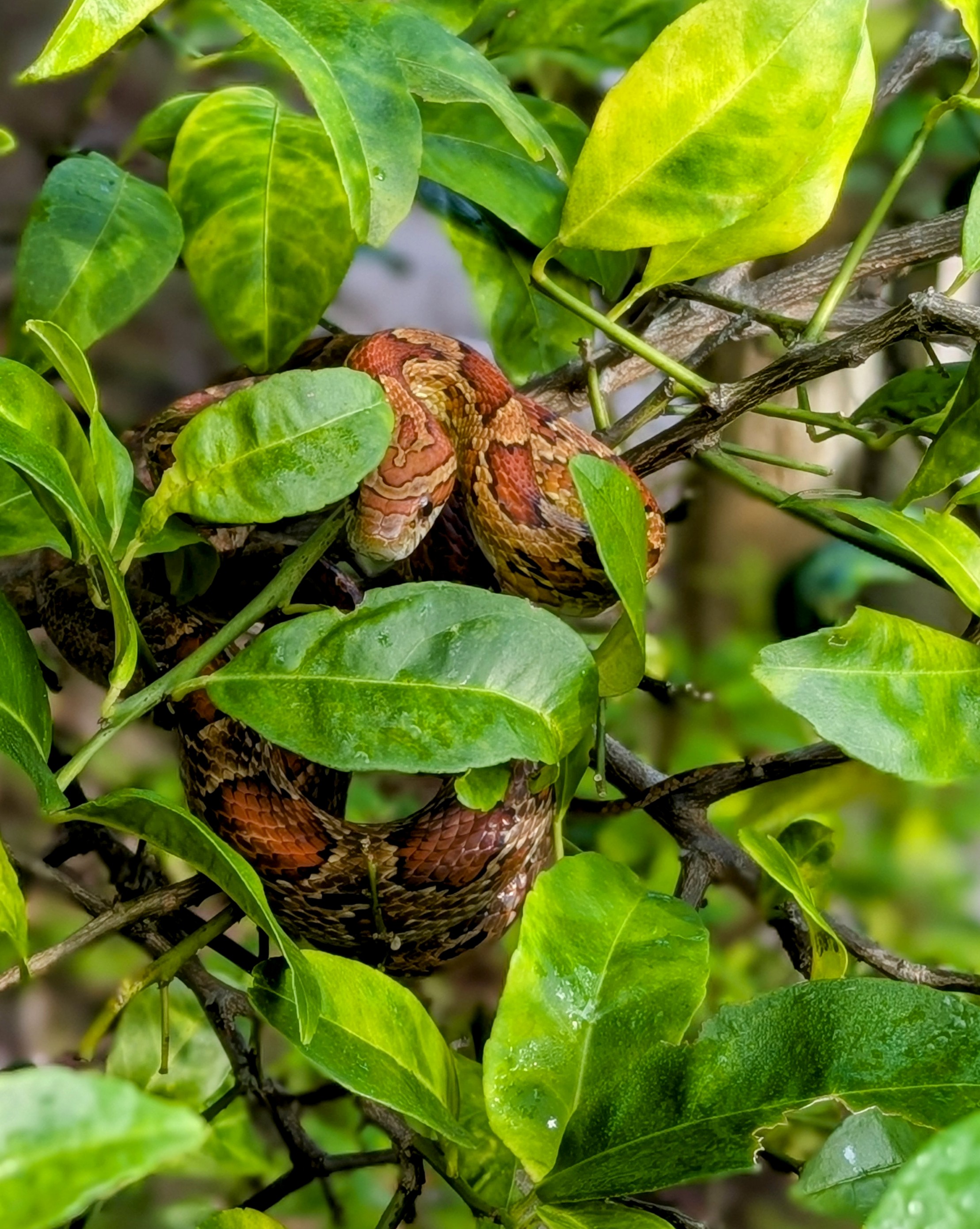I had a little surprise encounter while picking Rangpur limes. This is a corn snake, non venomous and a good snake to have in the garden. They eat rats and other things you don’t want around. Unfortunately, this one is a very similar color to the fruit. They usually don’t bite, unless, say you try to pick them. Fortunately, I realized what it was before I tried to pick it!
