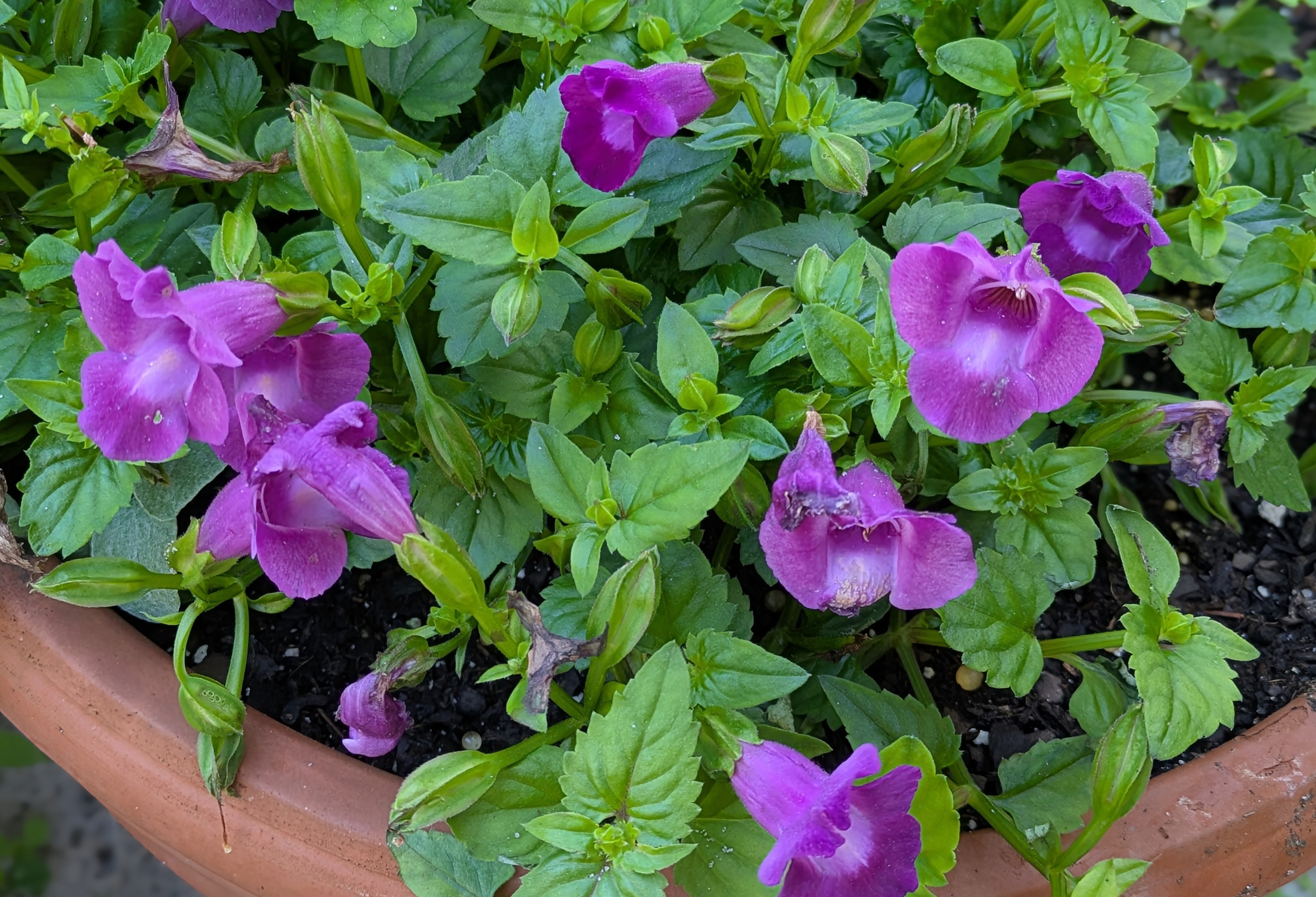 The container next to the Mona Lavendar is planted with Wishbone flowers (Torenia fournieri). I am not sure which named variety this is – it is my first time trying these. So far, so good. I am enjoying the color.