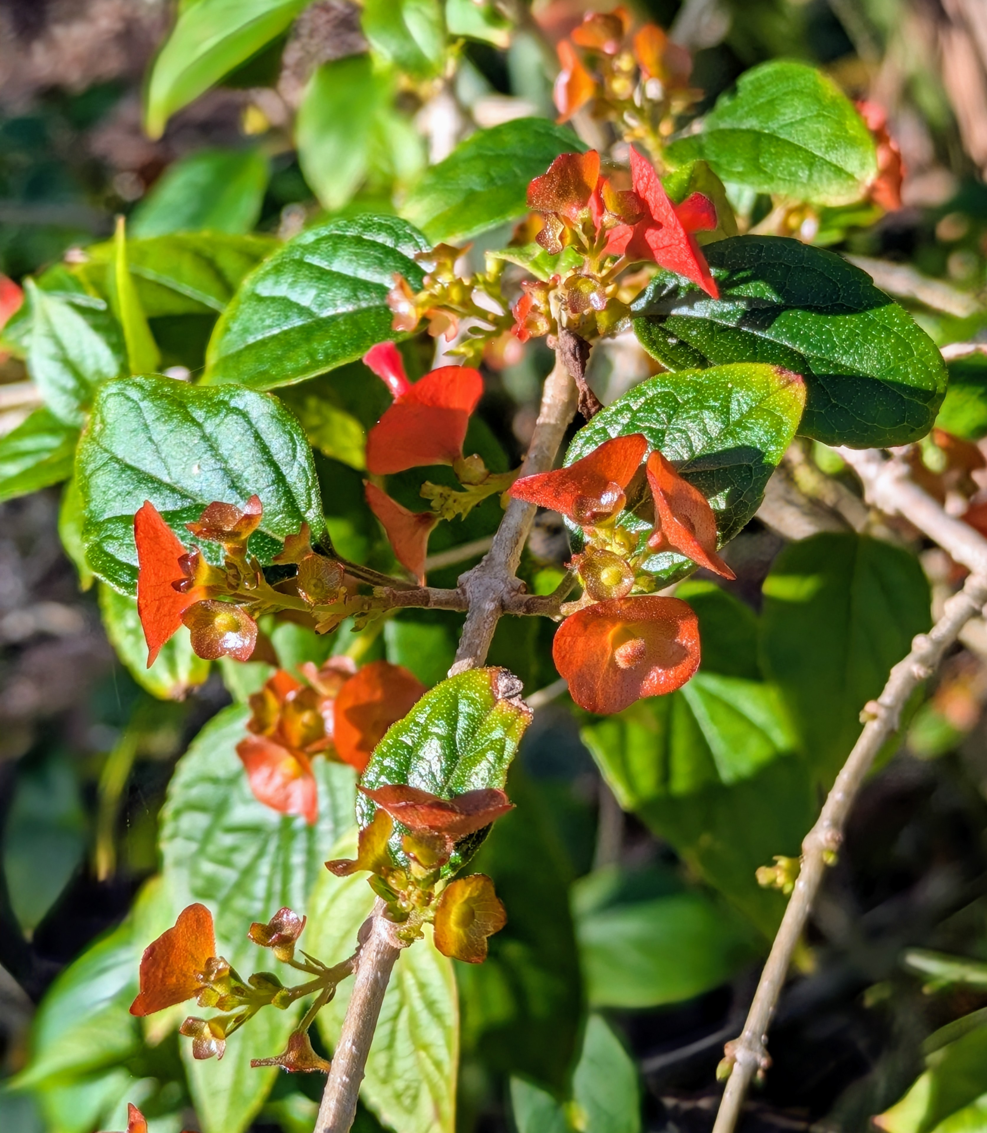 Flowers of the China Hat (Holmskioldia sanguinea) sometimes called Chinaman’s Hat. These are native to the Himalayas, seems strange to me they grow here.