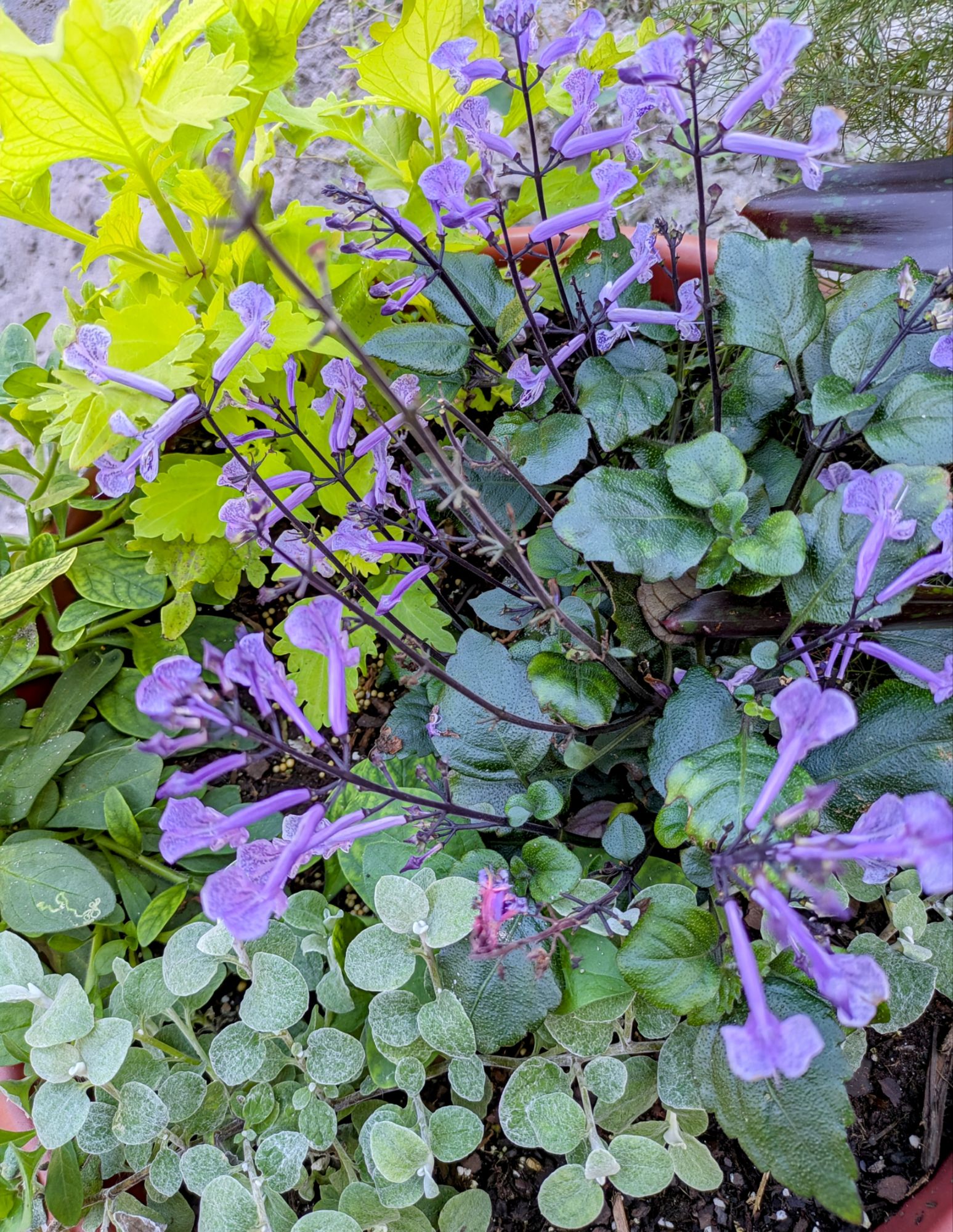 This is a Mona Lavendar Plectranthus. These are fairly common around here, generally used as annuals. I use them in containers. They last a year or two and are very hardy. This container has Licorice plant (Helichhrysum petiolare), a charteuse coleus, and Starry Night Petunias.