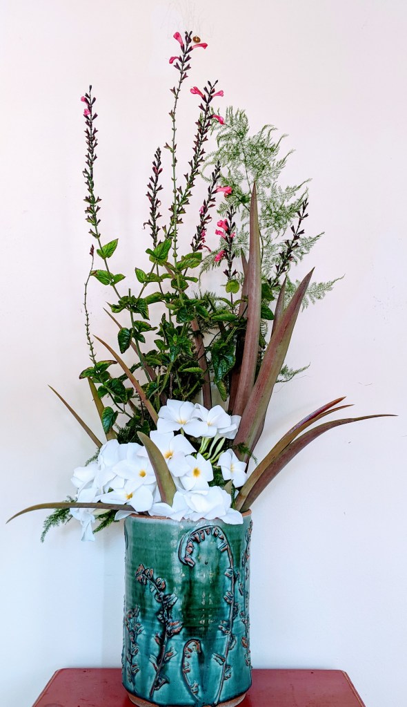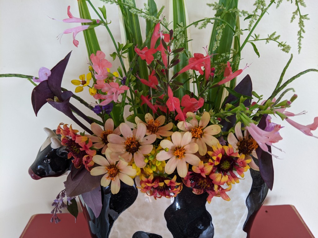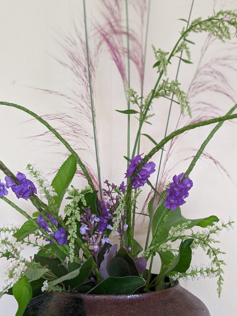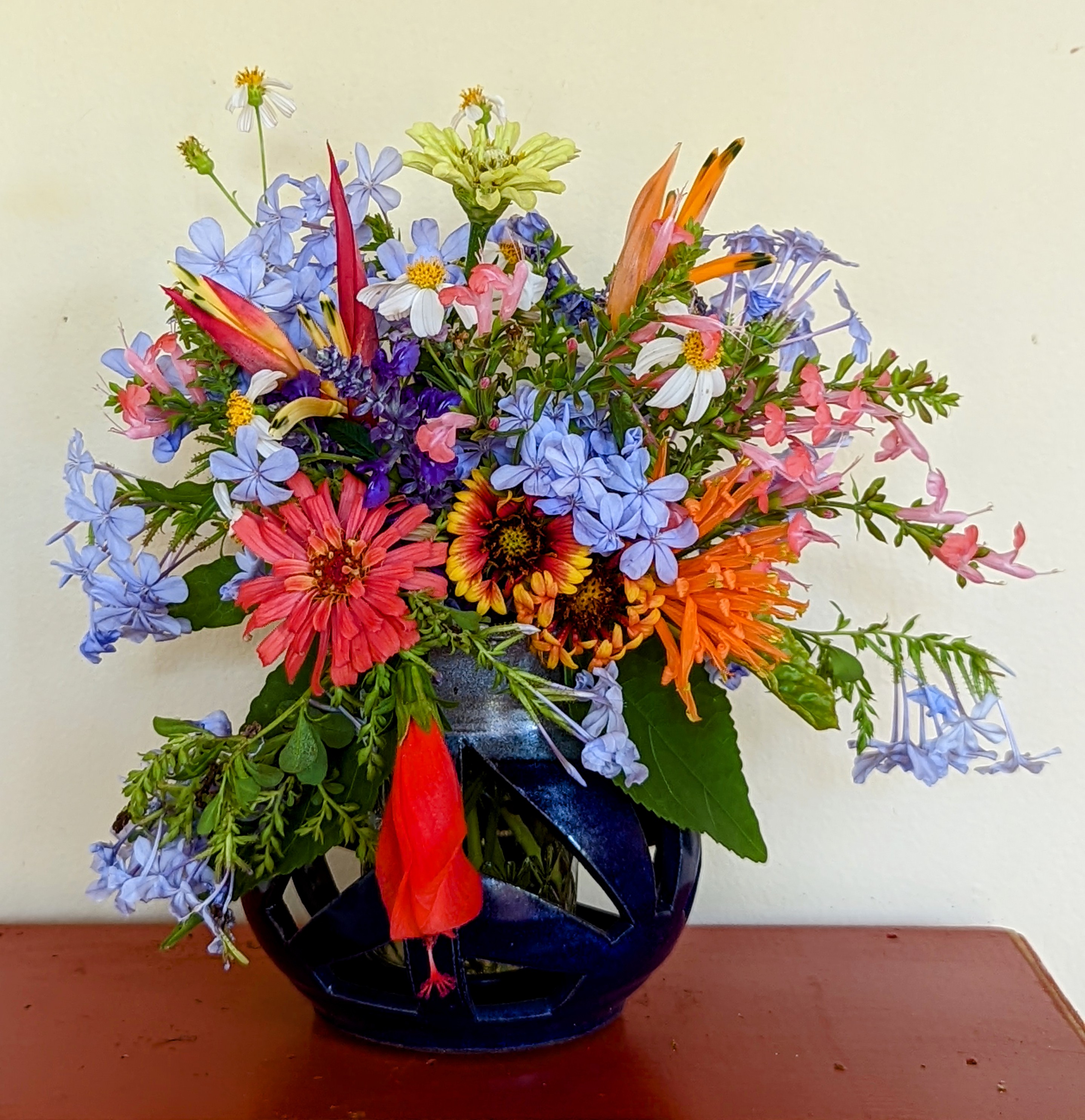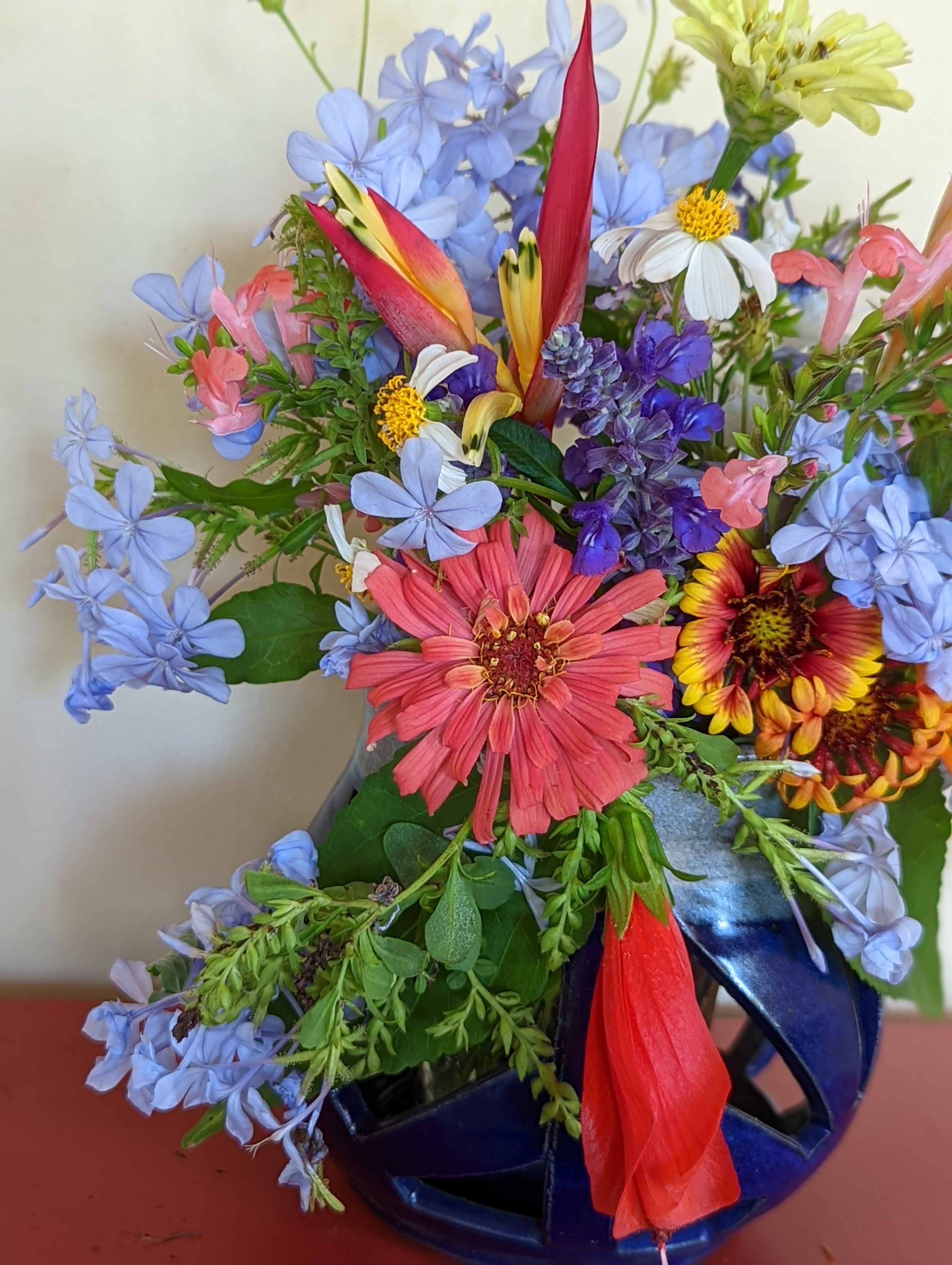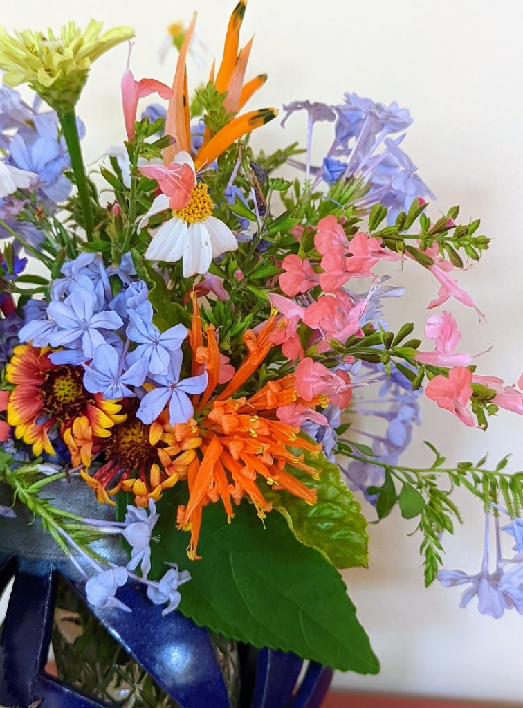 My vase, this Monday is filled with resilient plants from my garden. I had to search a bit to find likely candidates, winds burned or knocked many plants down. Amazingly the berries did not blow off the Beautyberry or the Firebush and I don’t believe the Parrotflowers even paused for Irma. Look closely at the Parrotflowers and note the tips of the flowers are burned black.