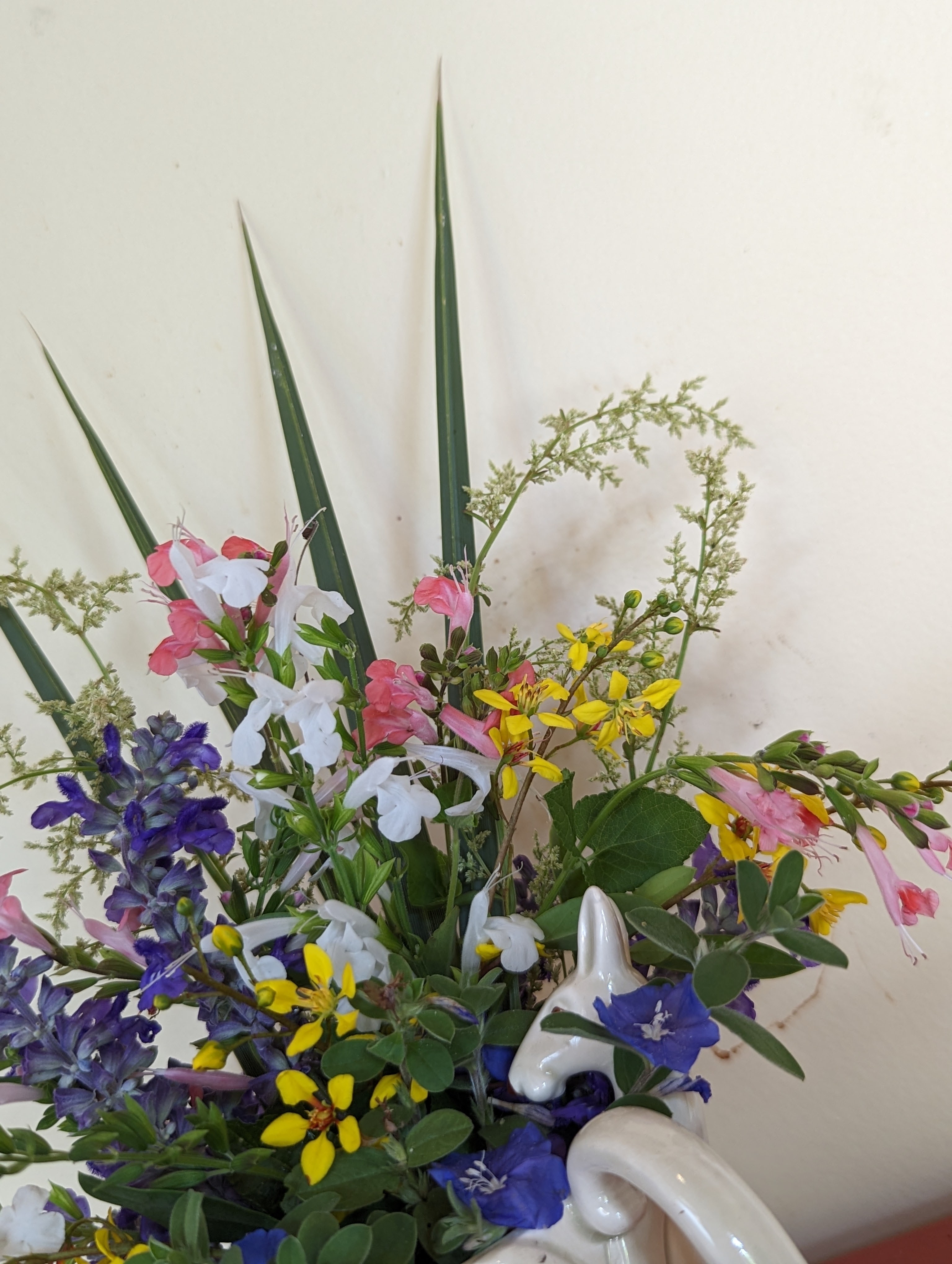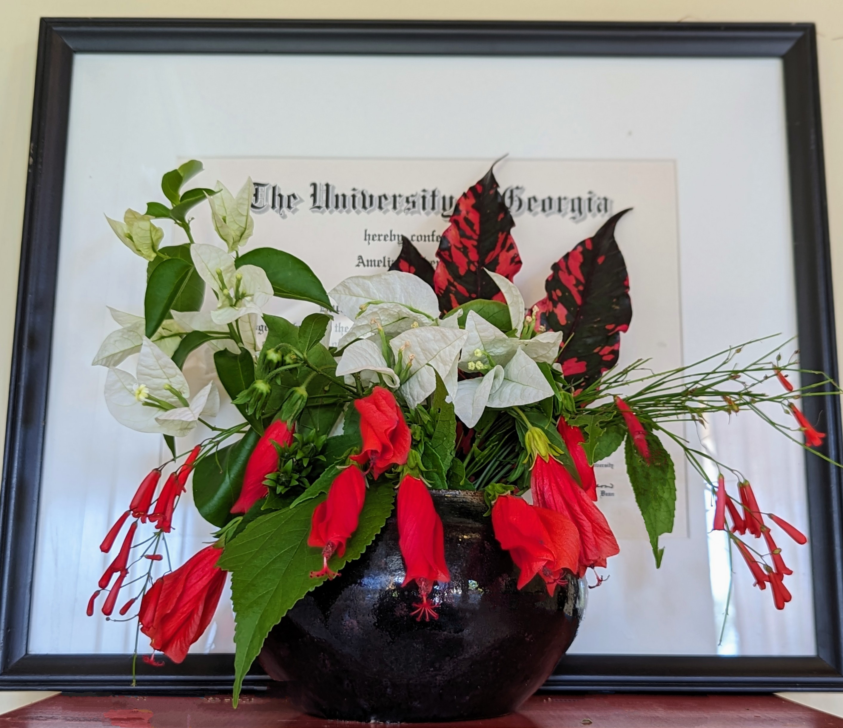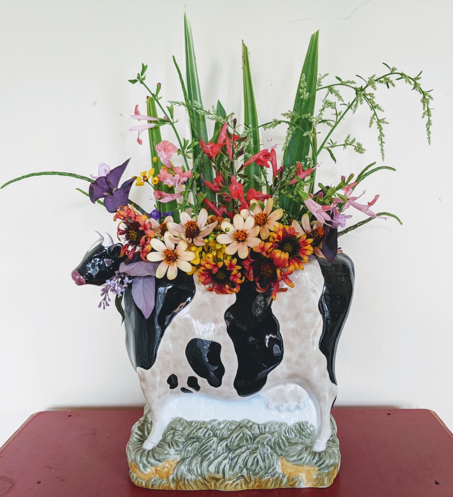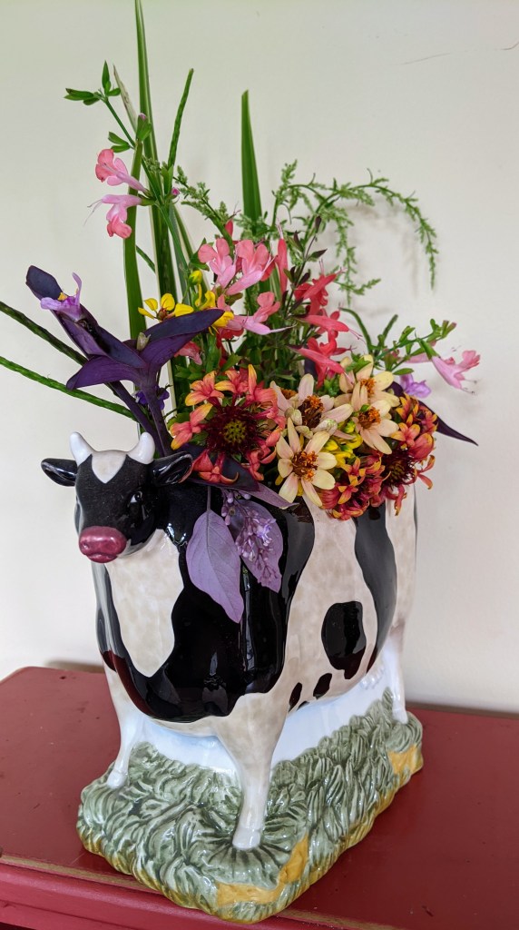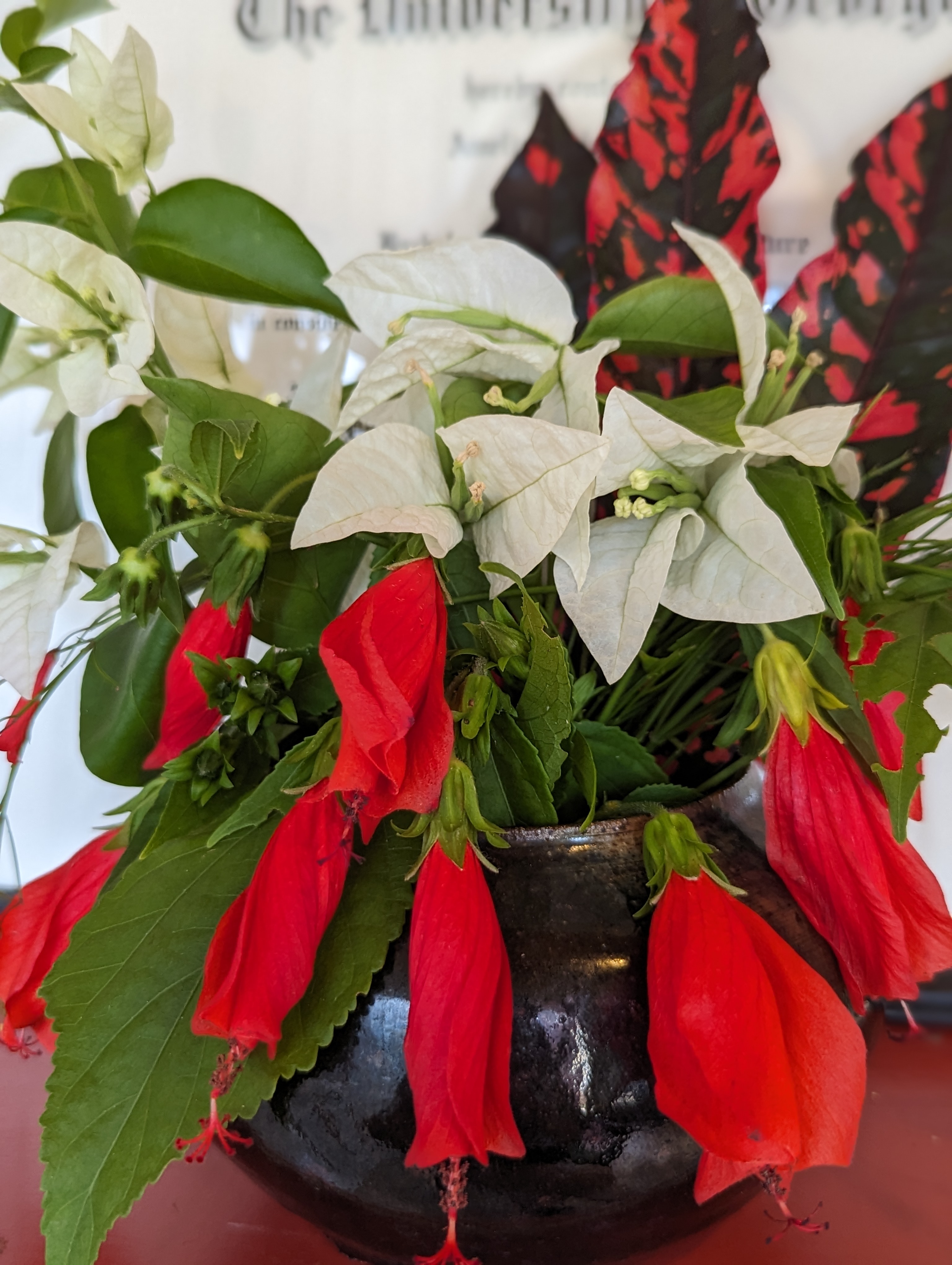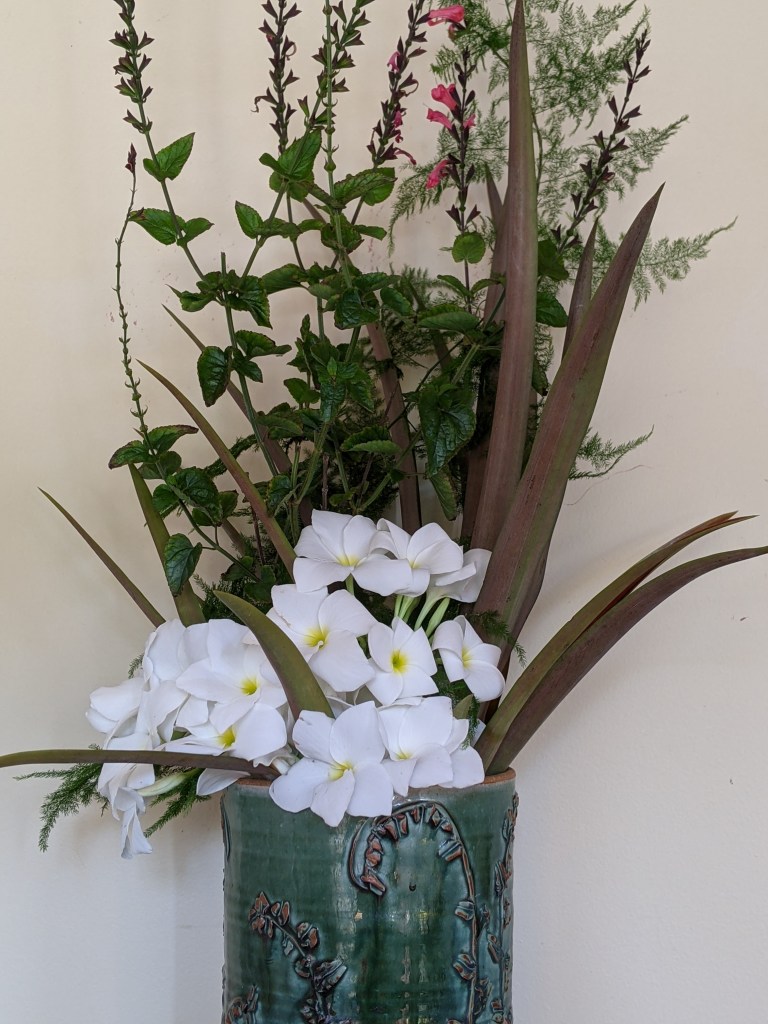 My vase, this Monday is filled with resilient plants from my garden. I had to search a bit to find likely candidates, winds burned or knocked many plants down. Amazingly the berries did not blow off the Beautyberry or the Firebush and I don’t believe the Parrotflowers even paused for Irma. Look closely at the Parrotflowers and note the tips of the flowers are burned black.