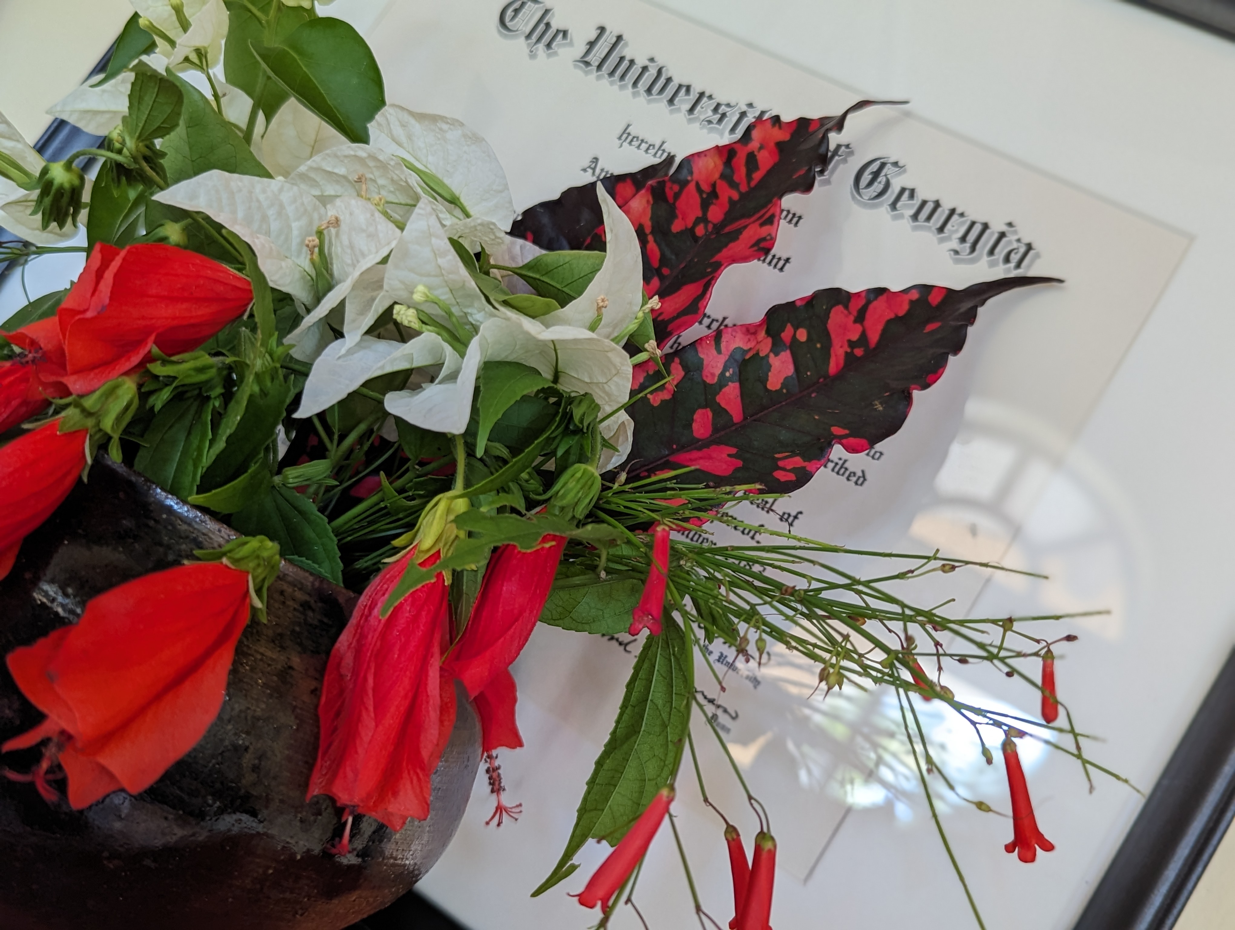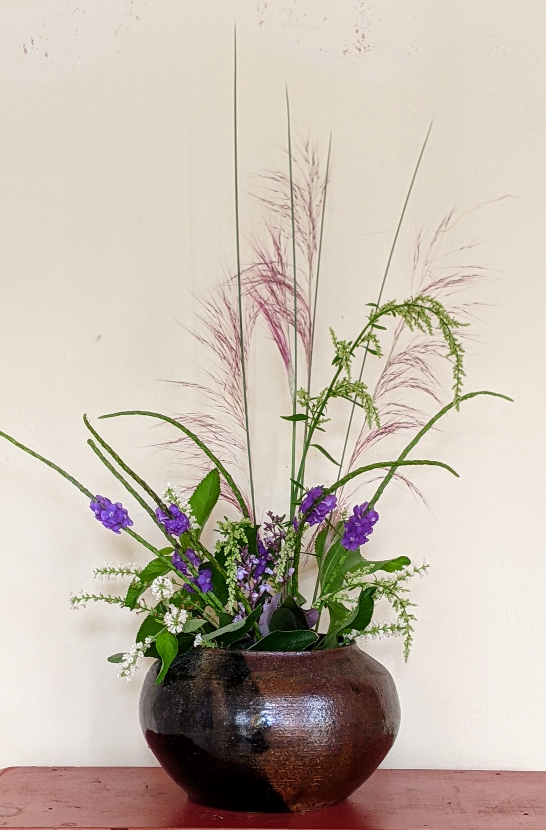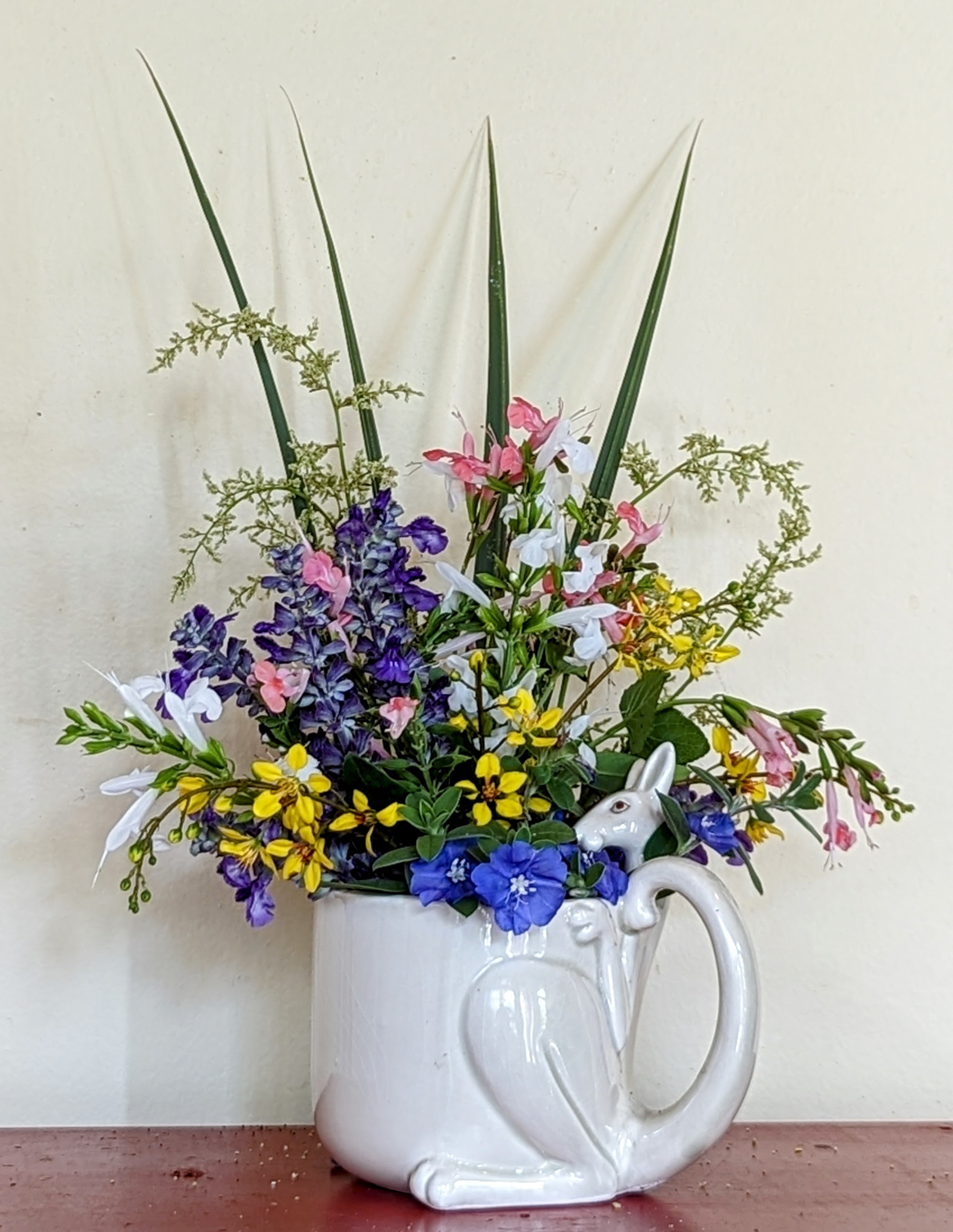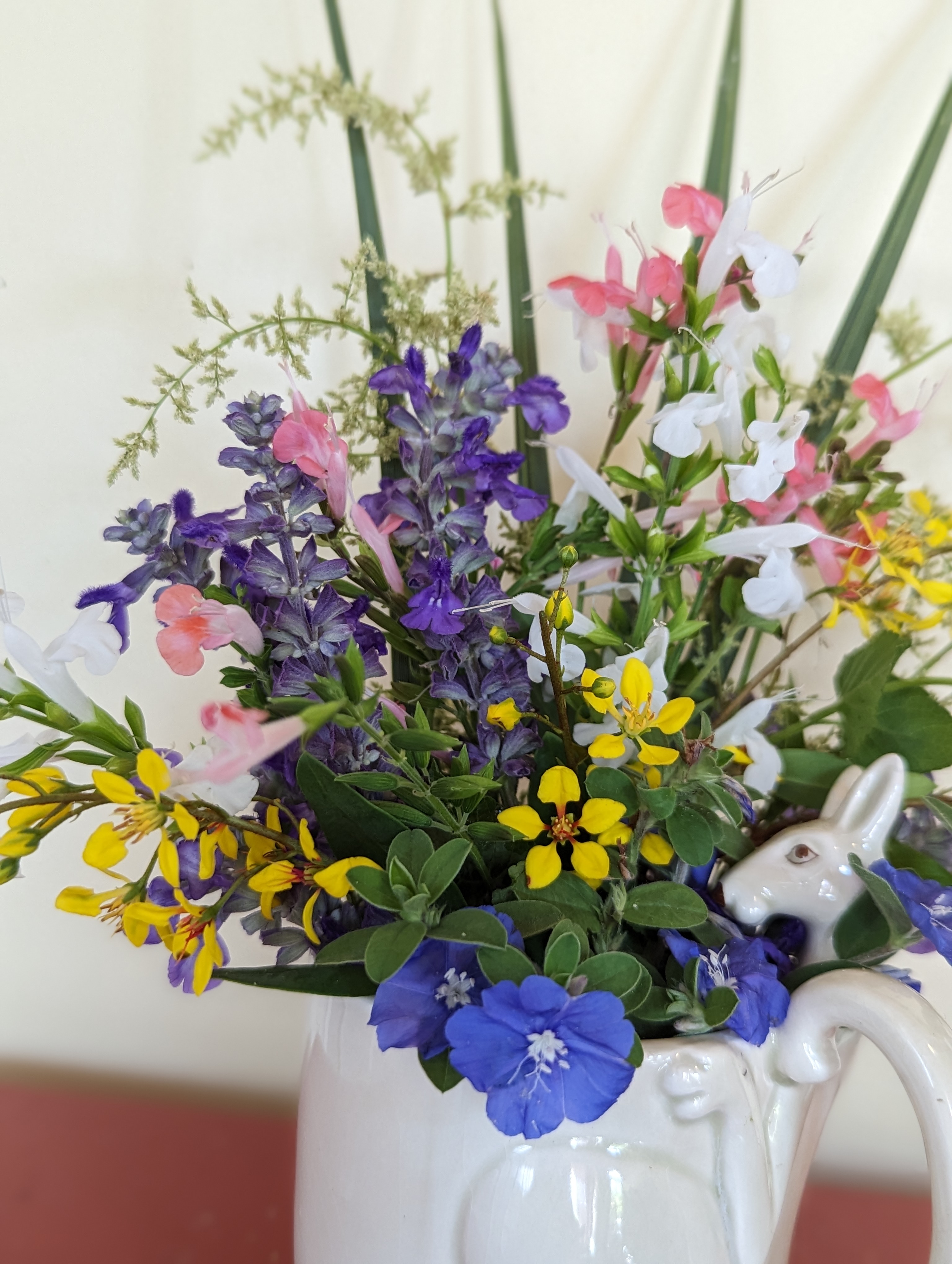 My vase, this Monday is filled with resilient plants from my garden. I had to search a bit to find likely candidates, winds burned or knocked many plants down. Amazingly the berries did not blow off the Beautyberry or the Firebush and I don’t believe the Parrotflowers even paused for Irma. Look closely at the Parrotflowers and note the tips of the flowers are burned black.