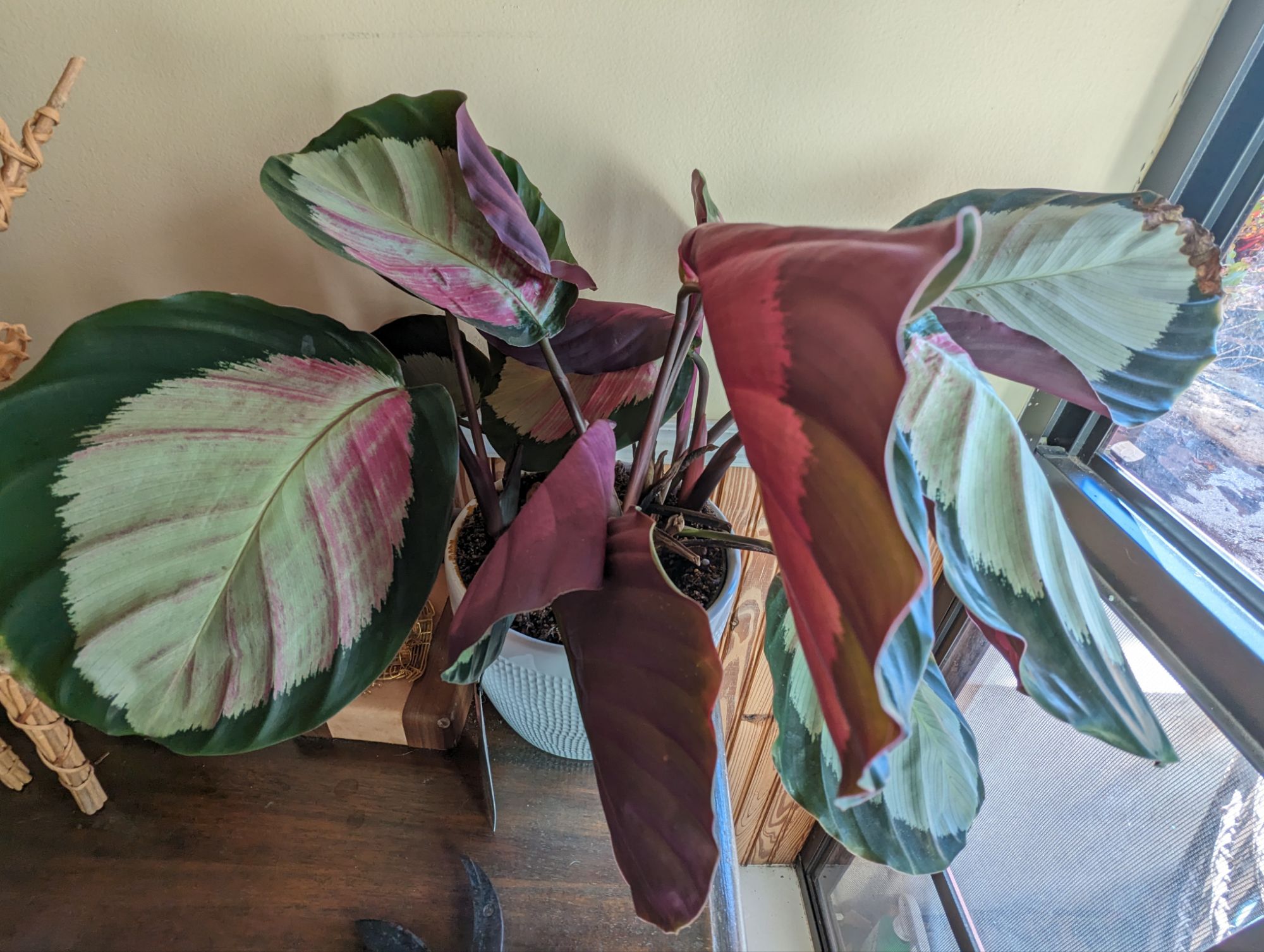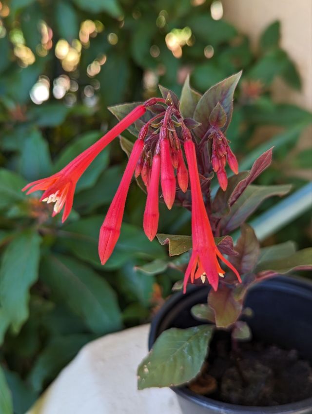 The red berries in front are from the Firebush (Hamelia patens), the purple berries from the Beautyberry (Calliocarpa americana), Parrotflowers (Heliconia psittacorum) in red and yellow. Blanchetiana Bromeliad flowers are beside the Beautyberry and Asian Sword Ferns in the back for some greenery. The ferns are missing a chunk (most of them are) but are amazingly alive and green.