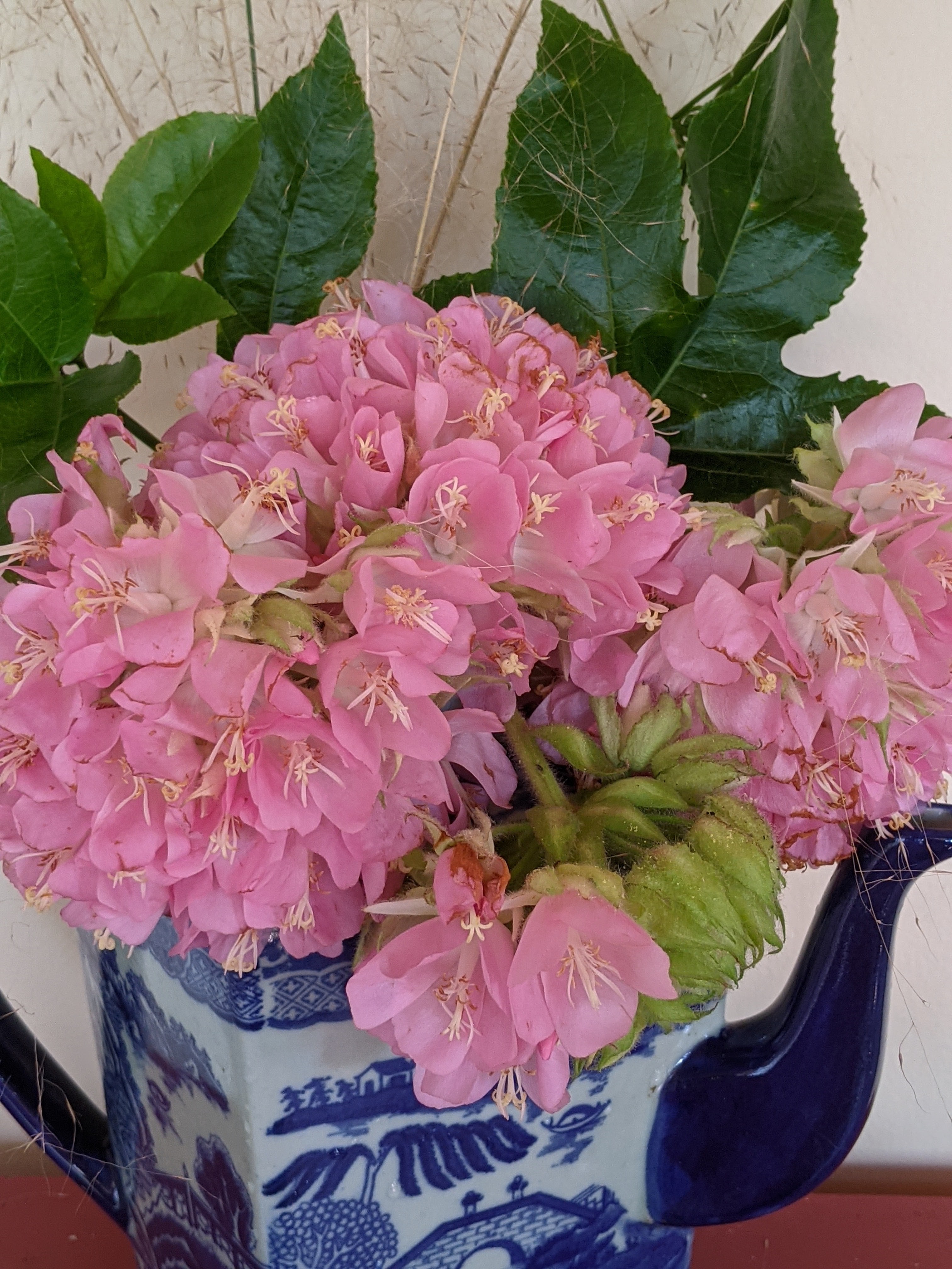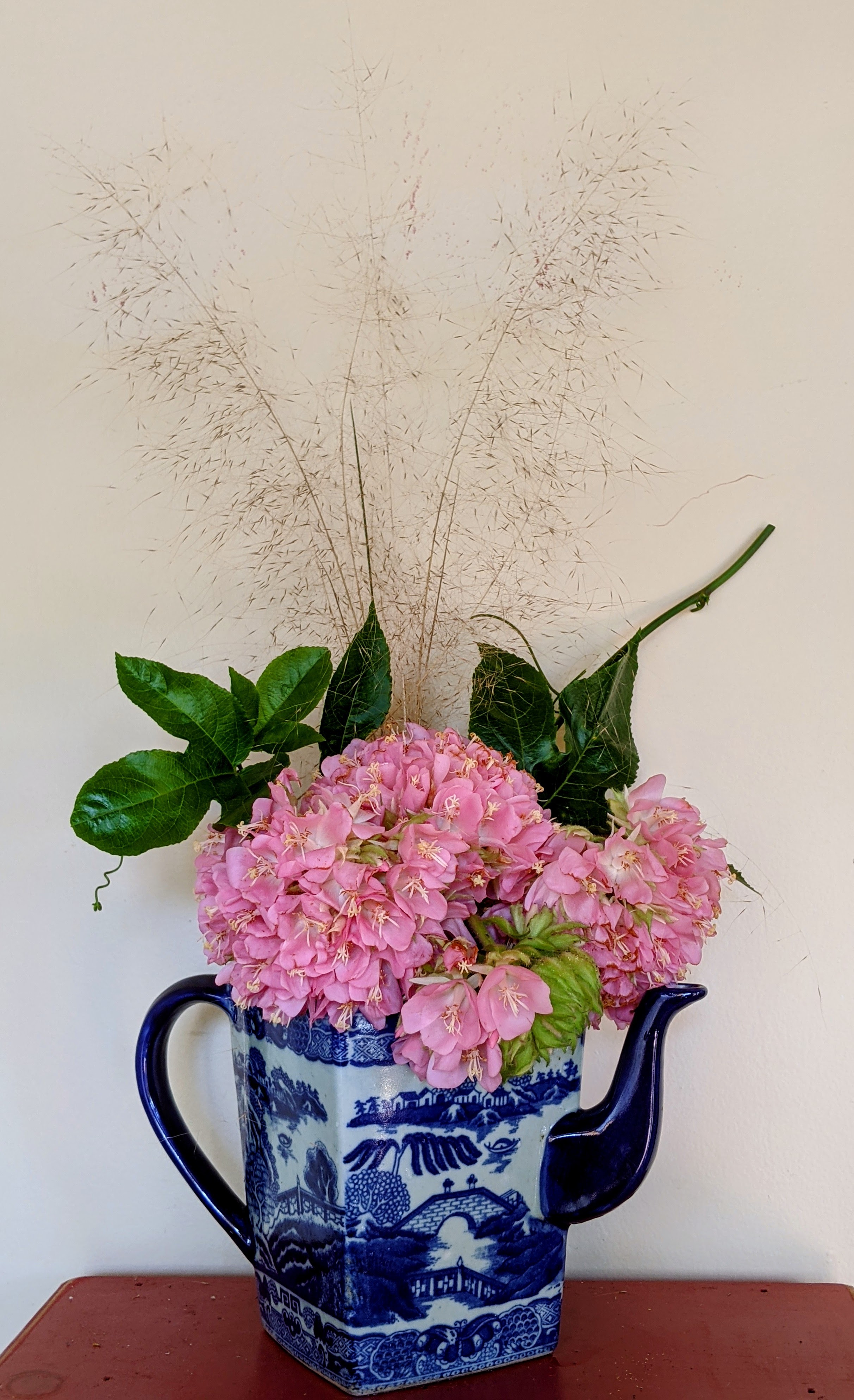 It is a surprisingly rainy, overcast Sunday in South Florida. A little indoor cheer was in order before the truly stormy weather arrived. Pastel flowers spiced up with burgundy and a little Green Envy have been served up in an antique Blue Willow teapot. Cheer crisis averted.