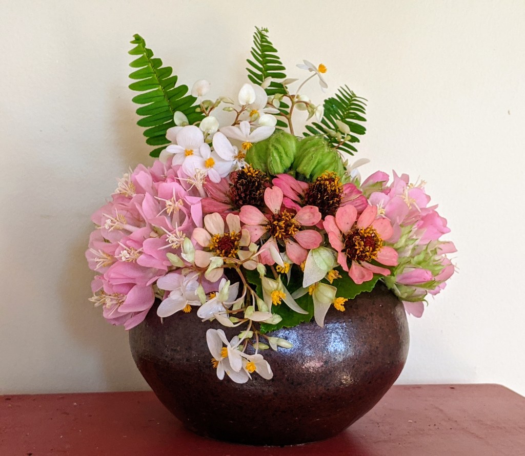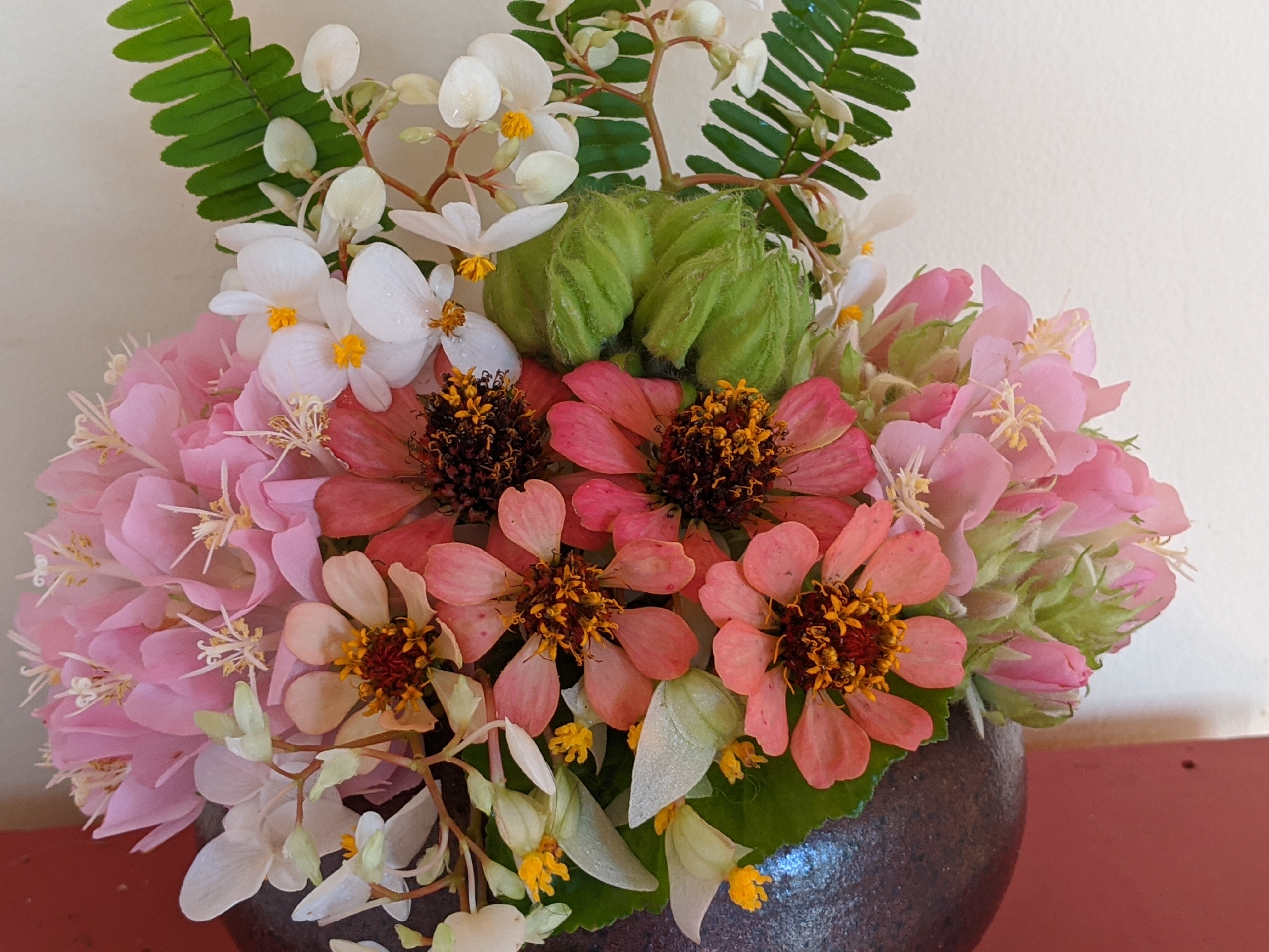 As much as this might look like a summer bouquet, it is really not. The pink Tropical Hydrangeas flower in December and January as does the white Bougainvillea. I am not really sure about the Zinnias yet, though I am going to try starting another batch soon as I have seemingly fooled the rabbits with what other Florida gardeners called kebobs. Looks a little weird, little bamboo stakes around the base of the Zinnias, but it works. A bit of an oriental touch, maybe?