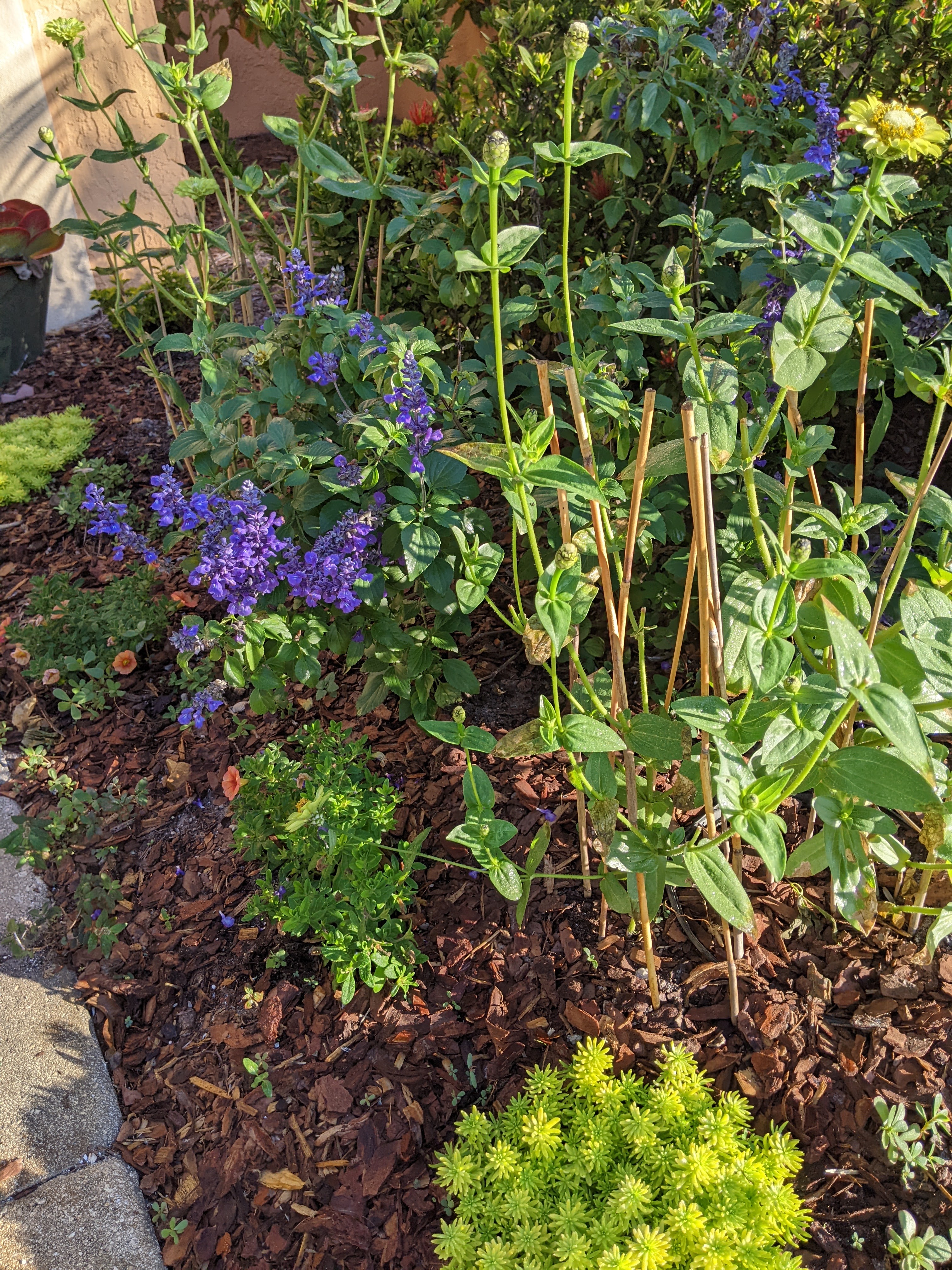 The remaining unidentified: blue flowers, Blue Plumbago (Plumbago auriculata); burgundy foliage, ‘Purple Prince’ Alternanthera.