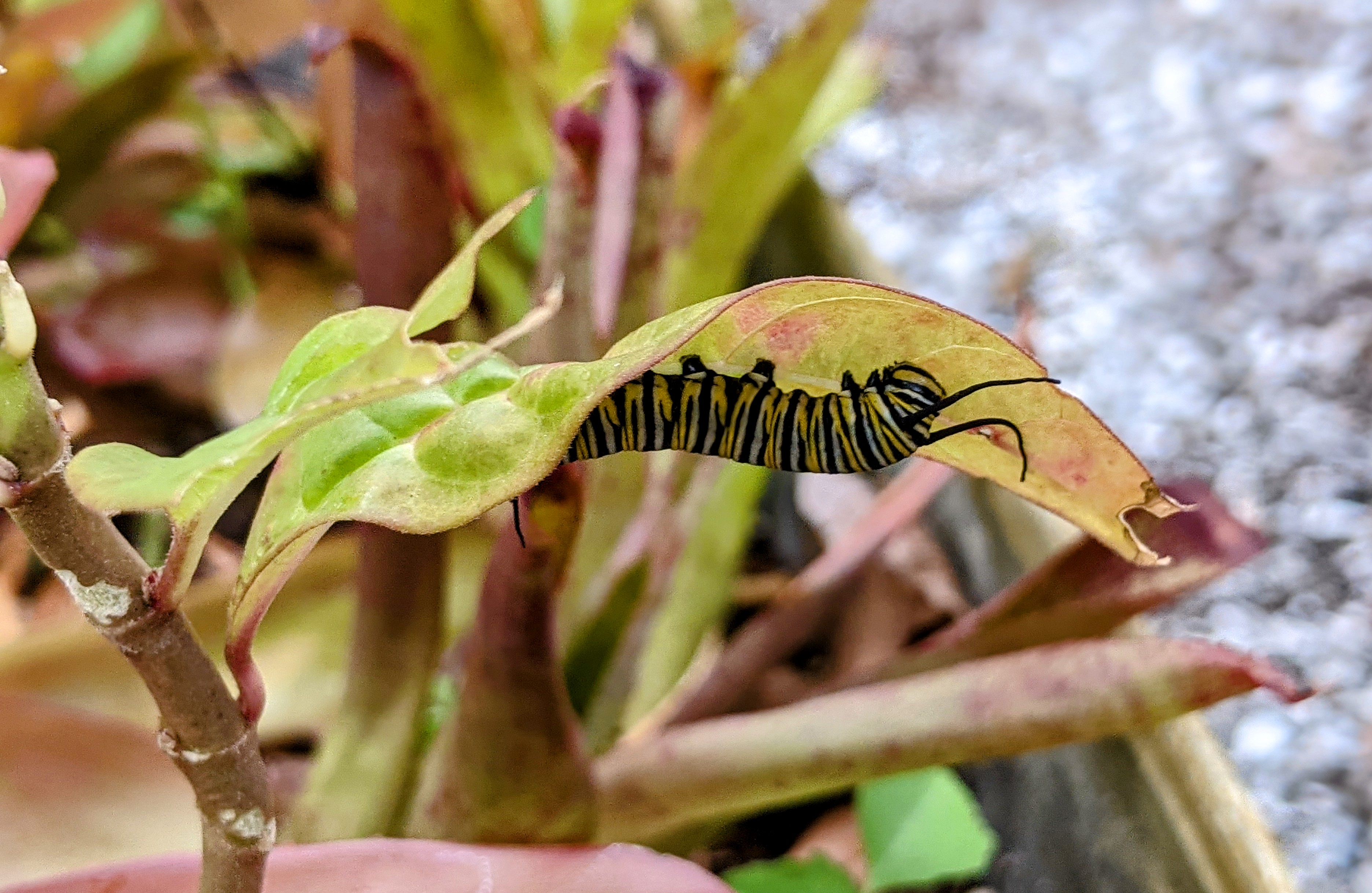 This is the first Monarch butterfly caterpillar in my garden. I have been attempting to grow its host plant, Tropical Milkweed, from seed since last summer. It seems planting the seed in late summer is the wrong season and late spring is the time. The Milkweed isn’t very big and this caterpillar is in its final instar before pupating (I measured and the length is right). During the final instar they eat like crazy, so I put some canned pumpkin out and the catepillar ate that until it dried out and then went back to the Milkweed. I pulled up another Milkweed and he or she ate that one, too. The final instar is supposed to last 3 to 5 days and I have been watching 4 days, so I hope the transition is soon.
