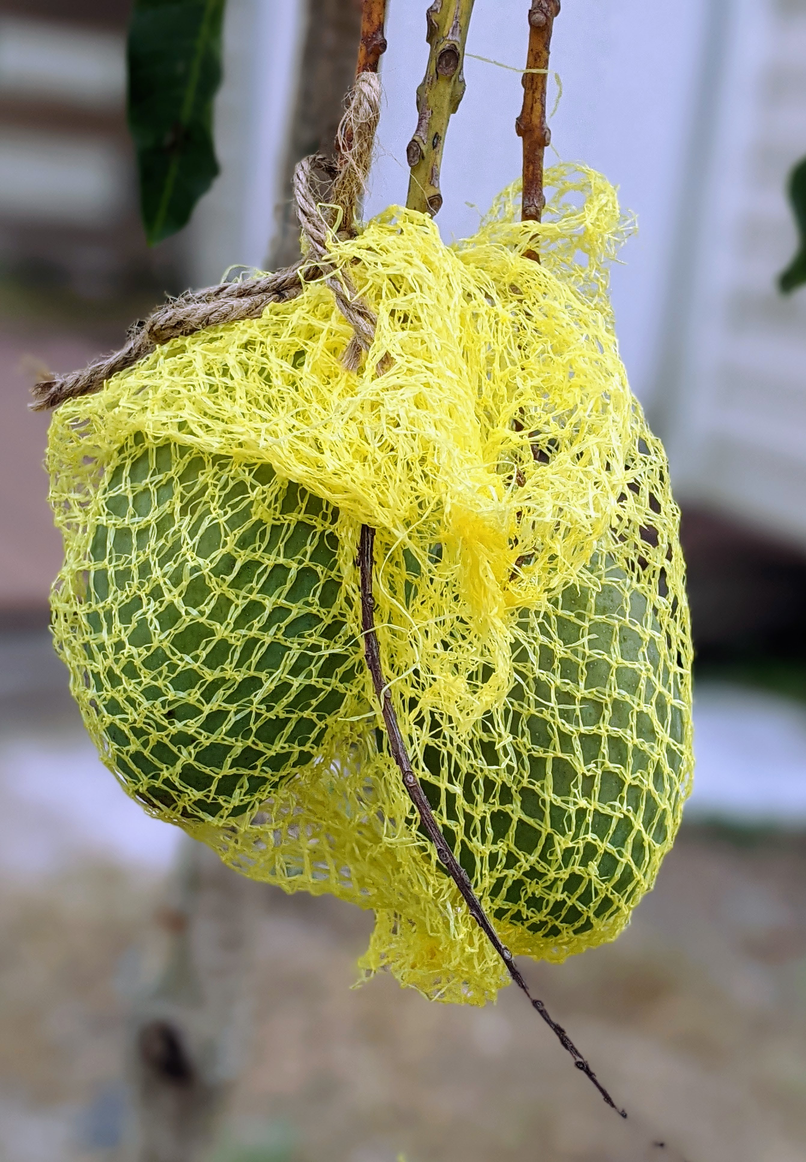 The Mangoes in my garden are teasing me and not quite ripe yet…here is their current condition. They look like weird Christmas ornaments. I put net bags over the fruit to keep squirrels and greyhounds away. One of my dogs loves fruit and is tall enough to reach them.