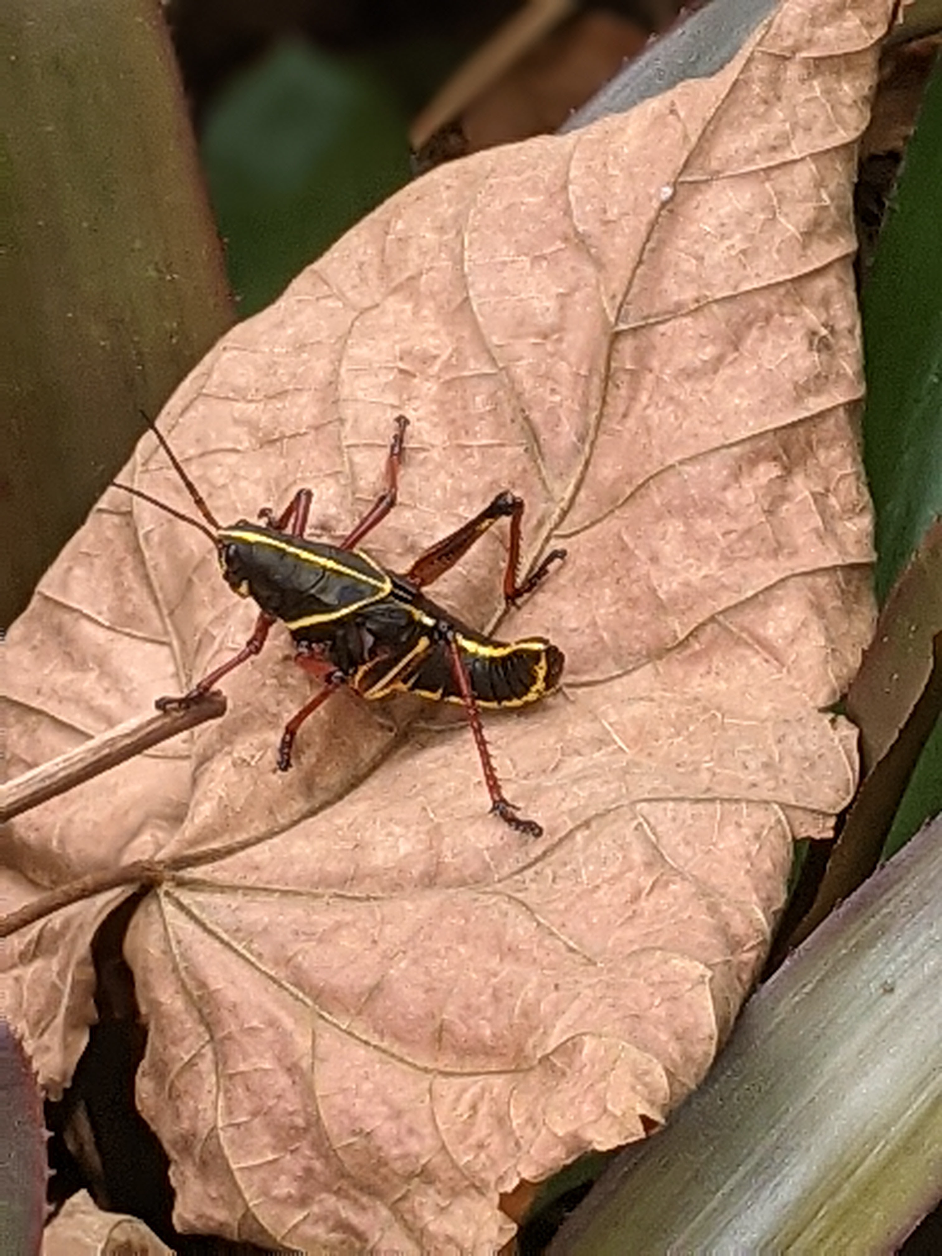 Finally, a dreaded insect in the garden. The Lubber Grasshopper. These things have been eating holes in the Bromeliads. They can be drowned in soapy water or squashed. Vile things.